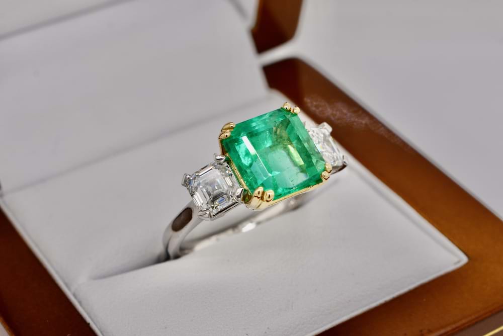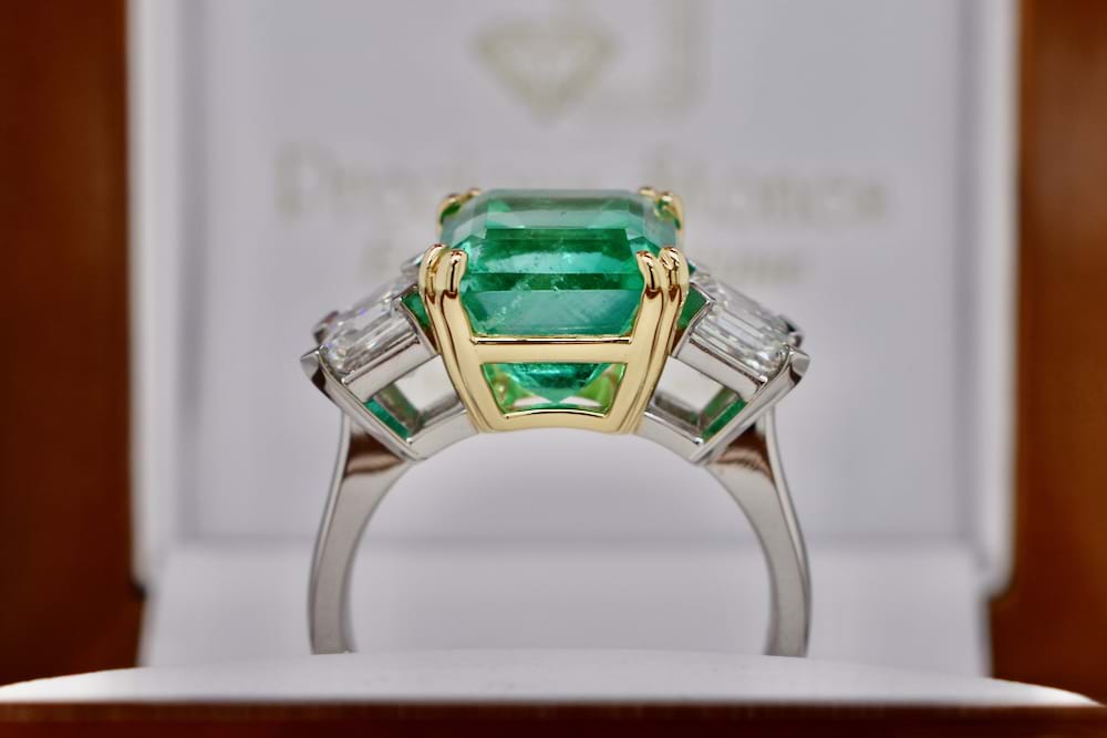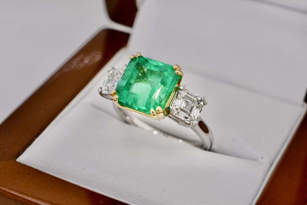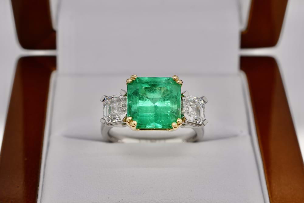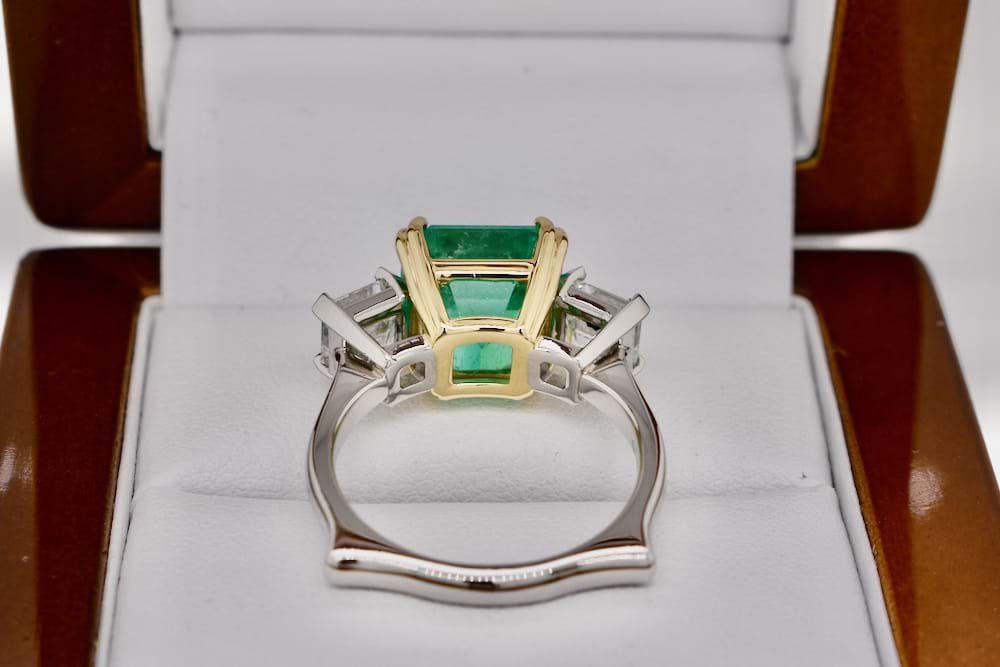 A spectacular 5.89ct certified Colombian emerald described as bright, mid green, lightly included set into this custom design platinum and 18ct yellow gold ring. The emerald is set into four yellow gold double claws in a square gallery and is flanked on either side by a 1.01ct GIA certified square emerald cut diamond four bar set into platinum. The band is solid platinum with a mermaids tale at the base to help stop this magnificent piece from moving on the finger. Total diamond content equals 2.02cts (F colour and VS2 clarity). Independent Valuation, Spectra Laboratory Certificate and GIA Certificate Supplied.