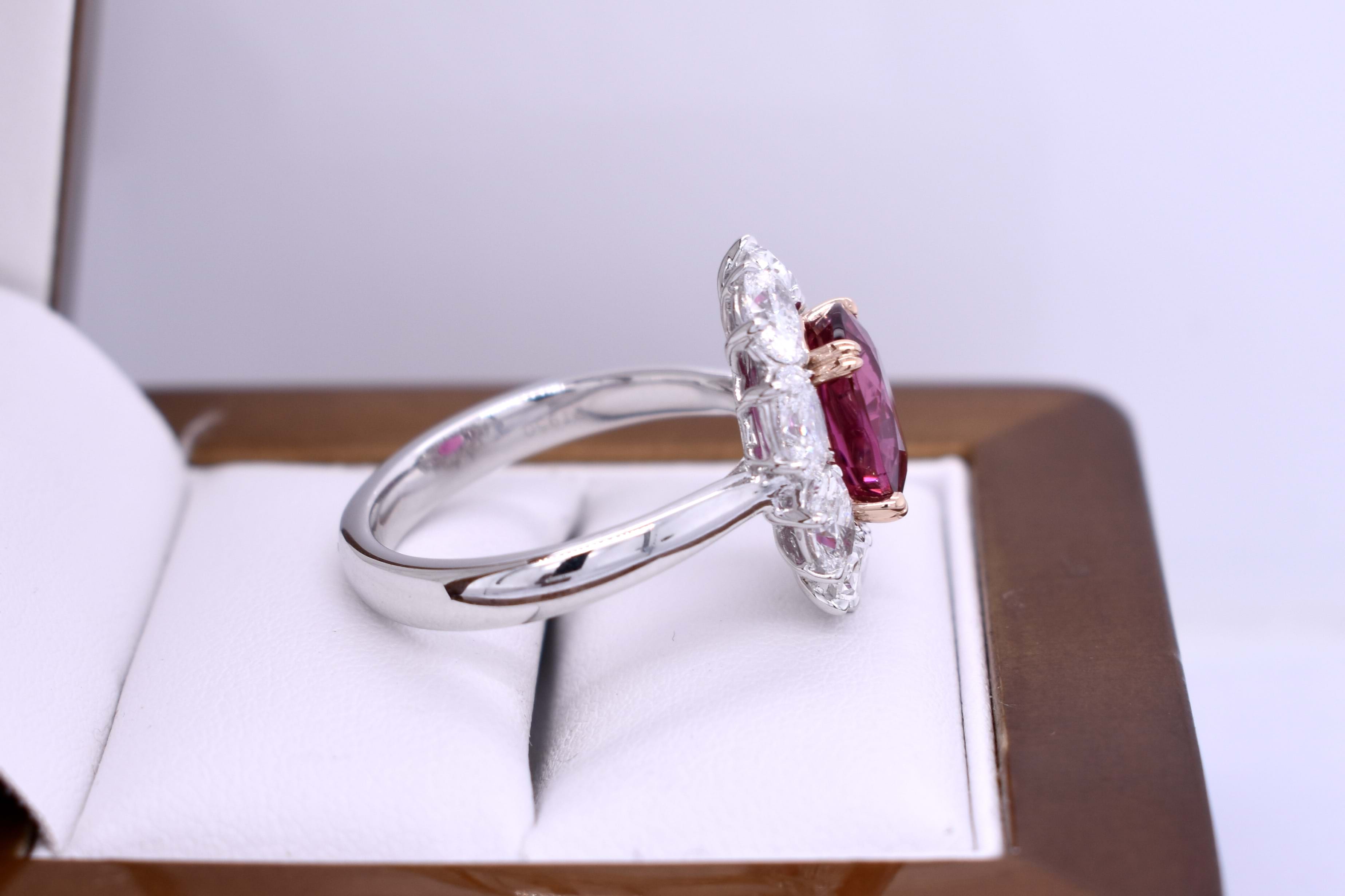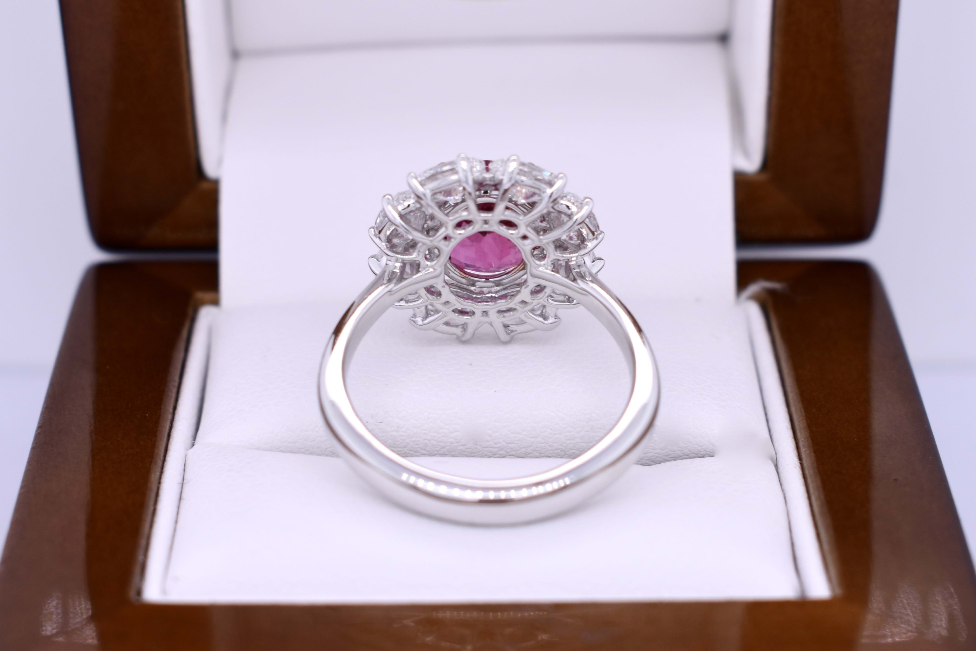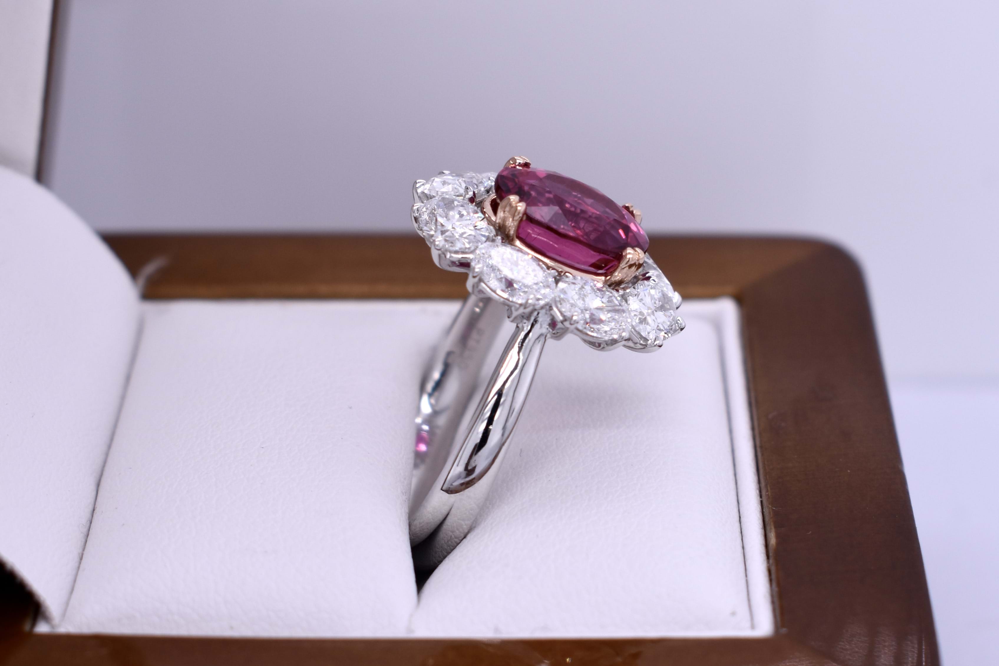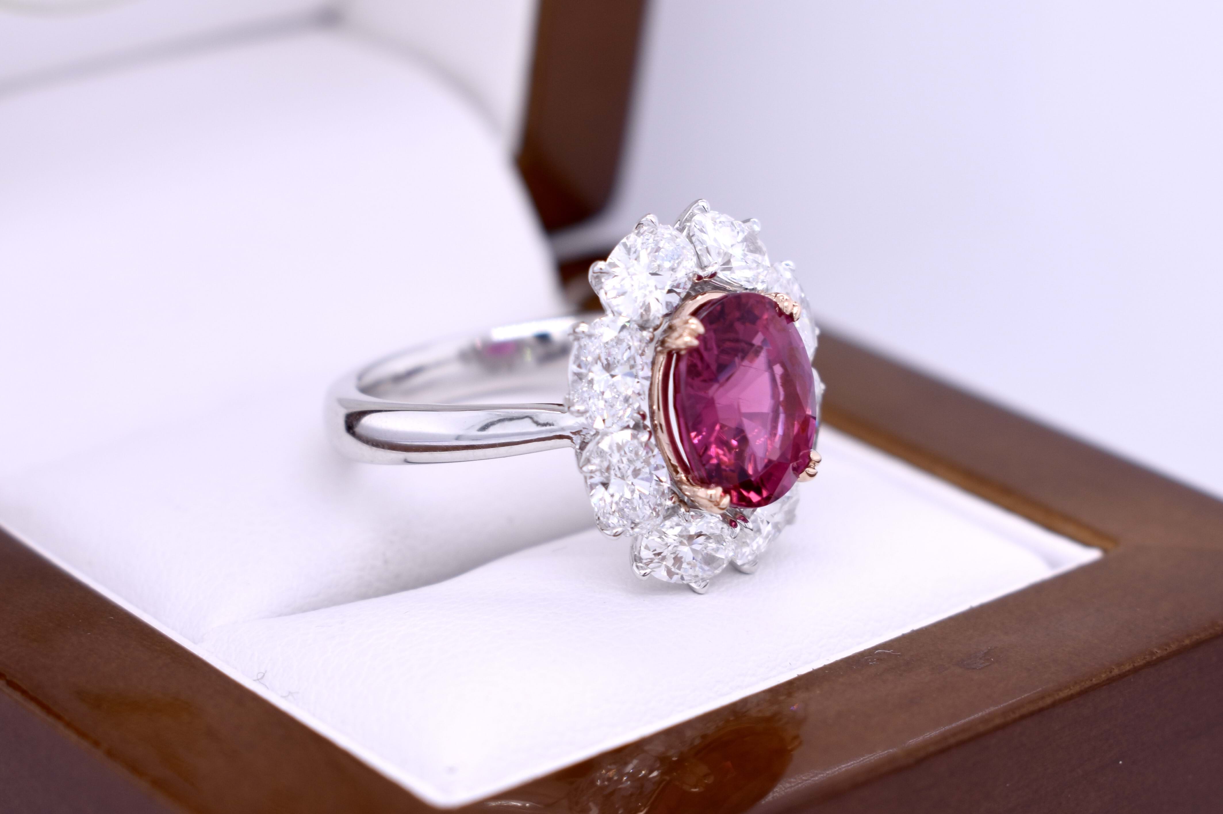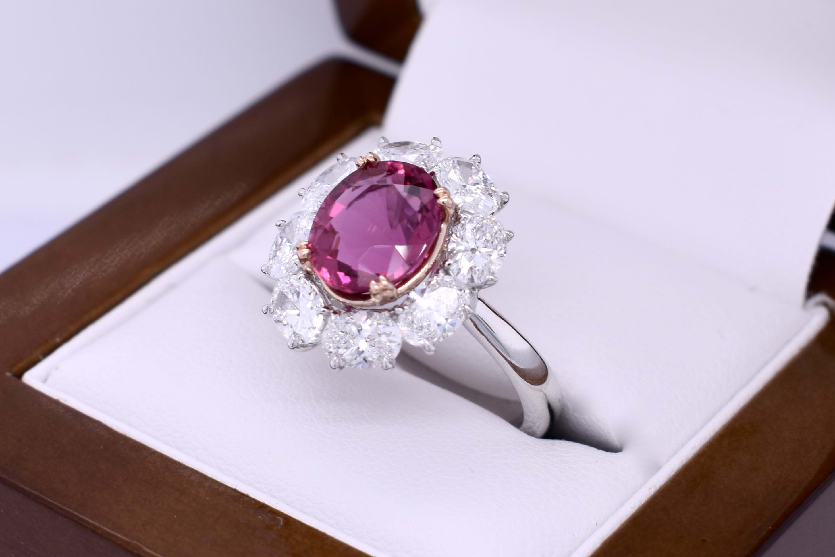 Fabulous dress ring featuring this vivid hot pink Rubellite tourmaline of 3.30cts set into four double talon, 18ct rose gold, claws and surrounded by a skirt of sparkling oval diamonds set in platinum. Total diamond content equals 2.77cts.