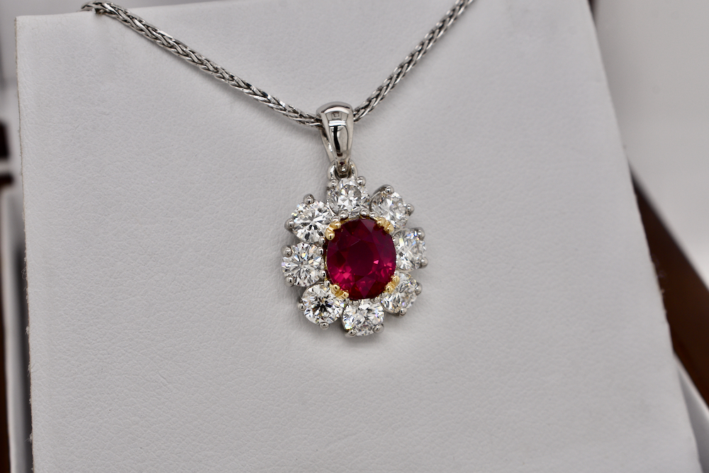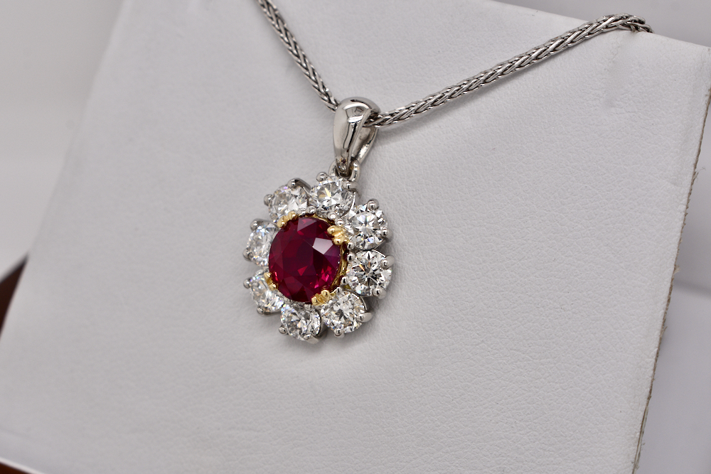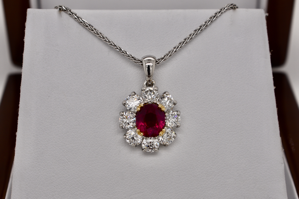 A magnificent 2.53ct ruby hand selected to be the feature of this timeless and stunning pendant with a surround of eight round brilliant cut diamonds totalling 2.47cts (D/F VS2). Expertly crafted in our workshop the ruby has been double four talon set into 18ct yellow gold with the diamonds and the bale in platinum. Independent Valuation Supplied.