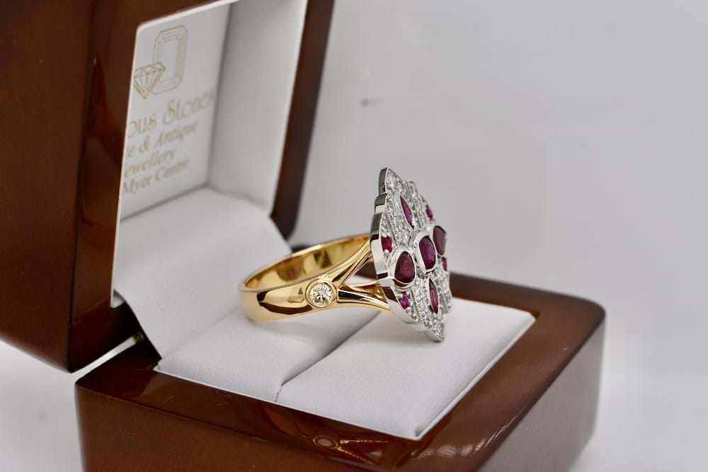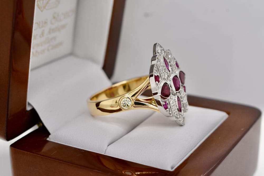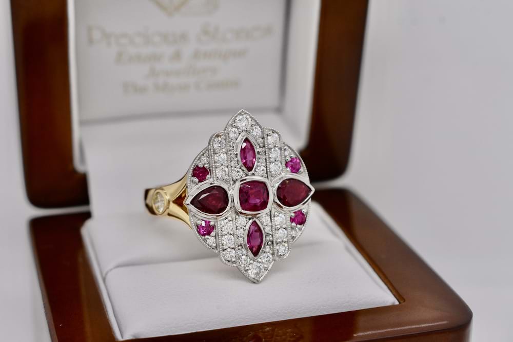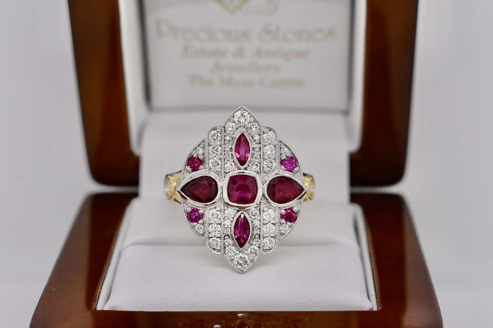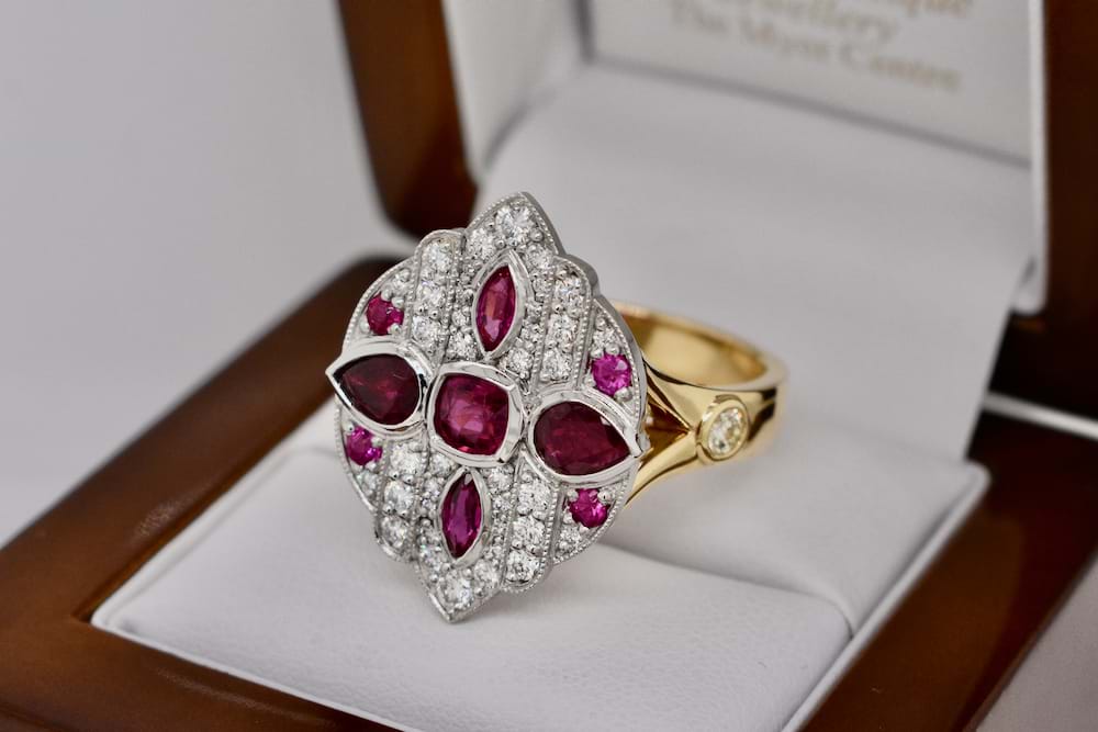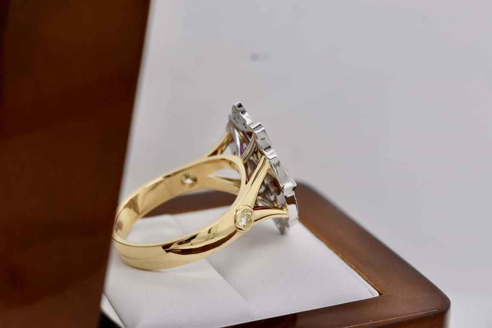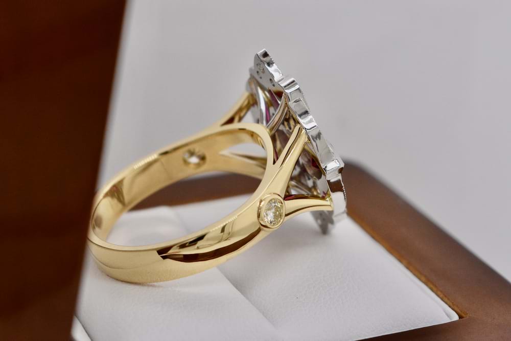 A fabulous dress ring designed in store for our client using a combination of her stones and additional diamonds supplied by us. The top is crafted in platinum with the band crafted in 18ct yellow gold and was designed in an Art Deco style and to create maximum impact. Independent Valuation Supplied. This bespoke creation is being enjoyed by its new owner, if you are inspired by this archived design contact us today to discuss how we can create something incredible for you or your loved one.