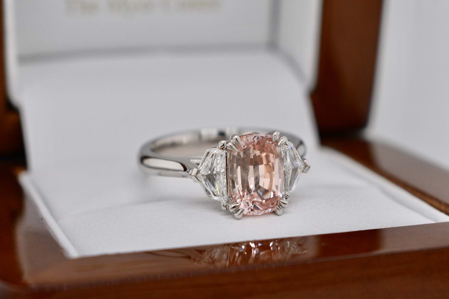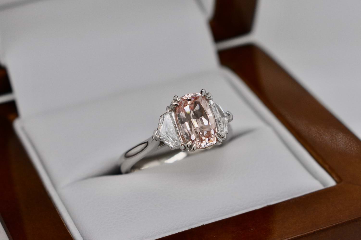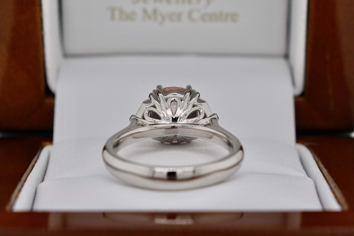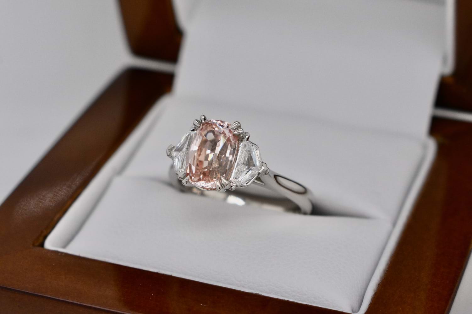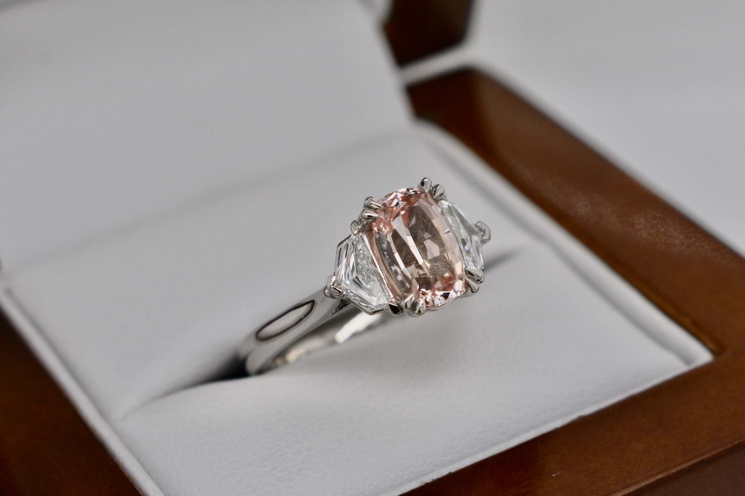 A spectacular 2.06ct certified Padparadascha sapphire selected personally by our client to feature in this elegant and beautiful platinum dress ring. Expertly crafted in our workshop the sapphire four double talon set with a scintillating Cadillac step cut diamond on each side claw & cap set. The ring has a simple, luxury style band, and a decorative gallery, it will sit beautifully with diamond bands or on its own. The two diamonds total 0.39cts E/F VVS. Independent Valuation & ICA Lab Cert Supplied.