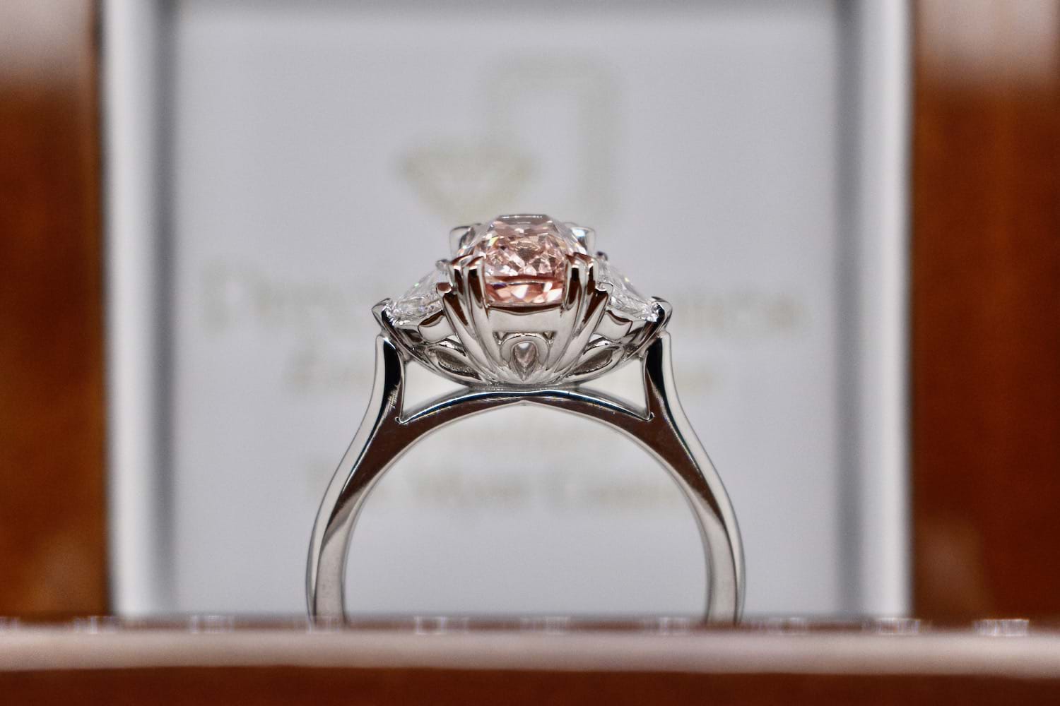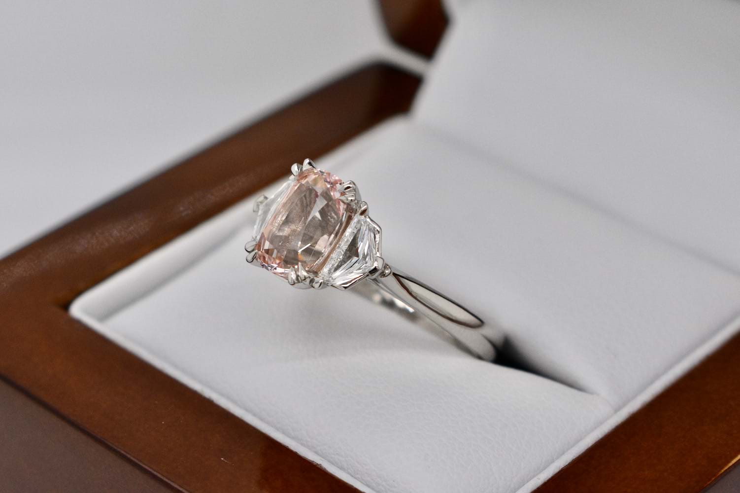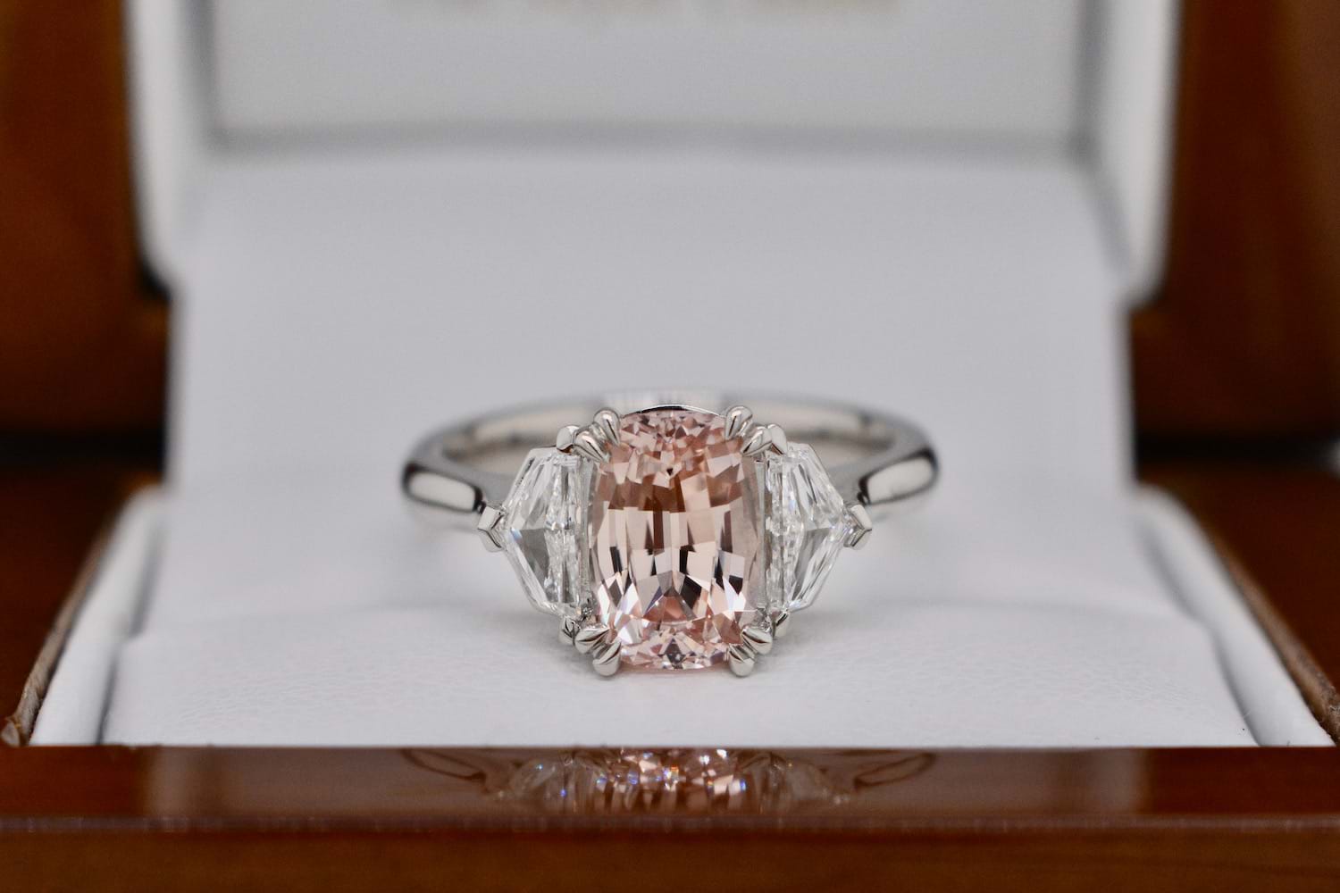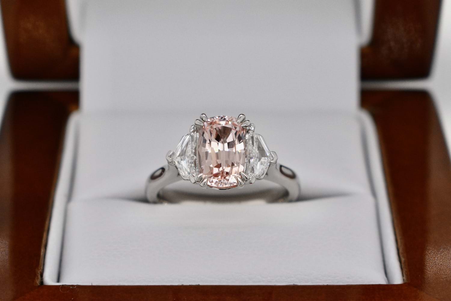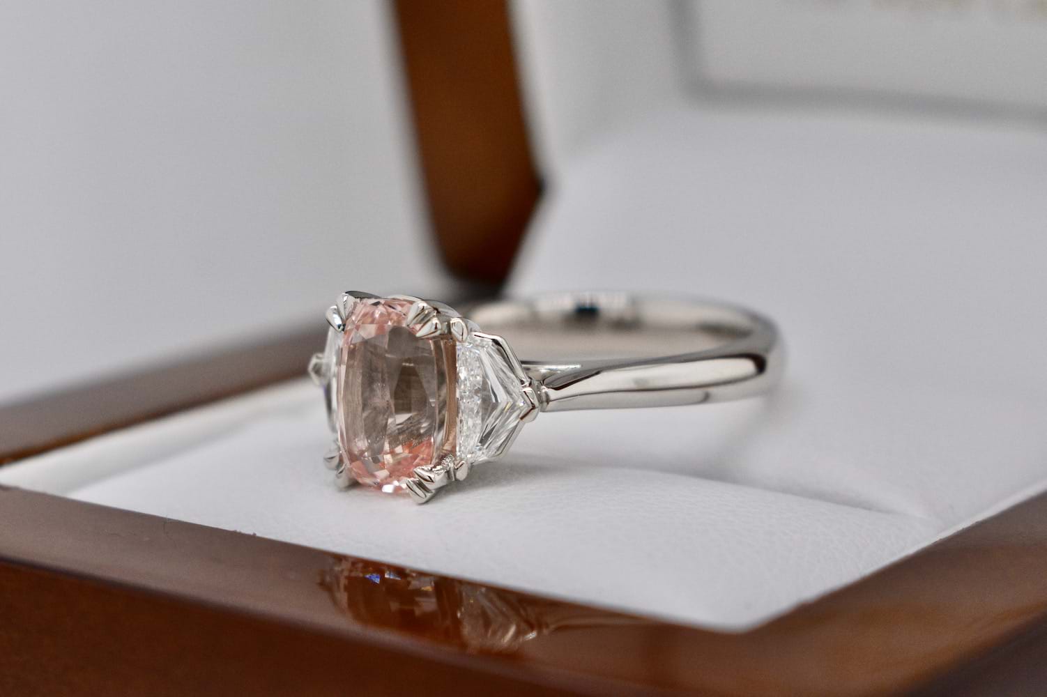 A spectacular 2.06ct certified Padparadascha sapphire selected personally by our client to feature in this elegant and beautiful platinum dress ring. Expertly crafted in our workshop the sapphire four double talon set with a scintillating Cadillac step cut diamond on each side claw & cap set. The ring has a simple, luxury style band, and a decorative gallery, it will sit beautifully with diamond bands or on its own. The two diamonds total 0.39cts E/F VVS. Independent Valuation & ICA Lab Cert Supplied.