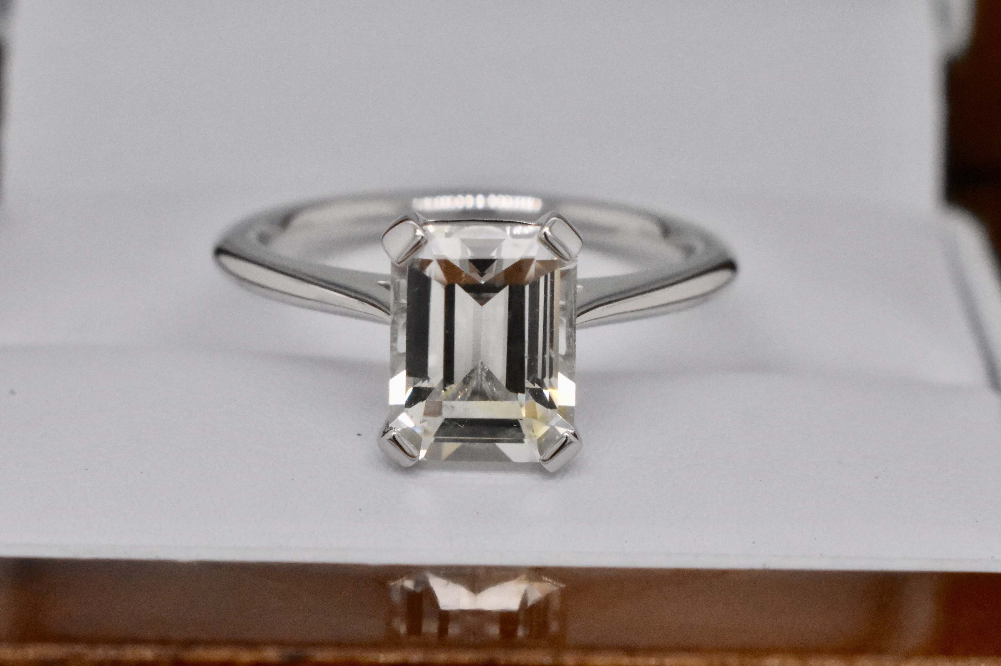 A striking emerald cut 2.17ct colourless sapphire hand chosen to be the centre of this custom made platinum solitaire engagement ring. Independent Valuation Supplied. This bespoke creation is being enjoyed by its new owner, if you are inspired by this archived design contact us today to discuss how we can create something incredible for you or your loved one.