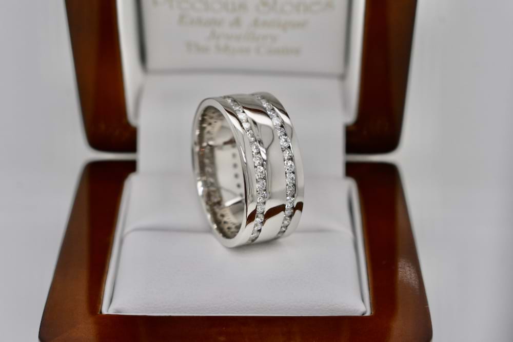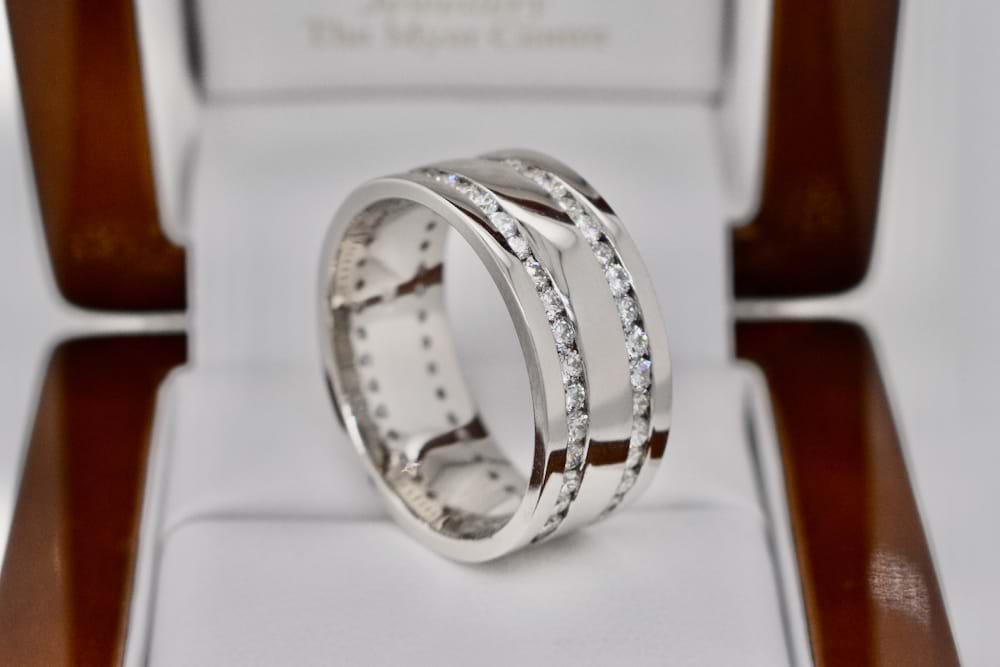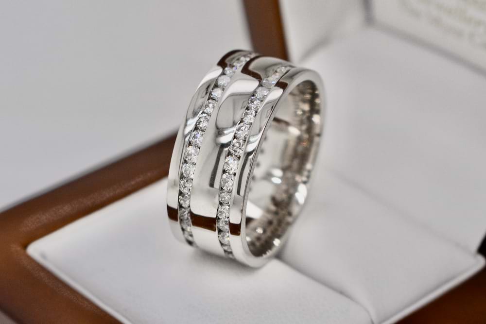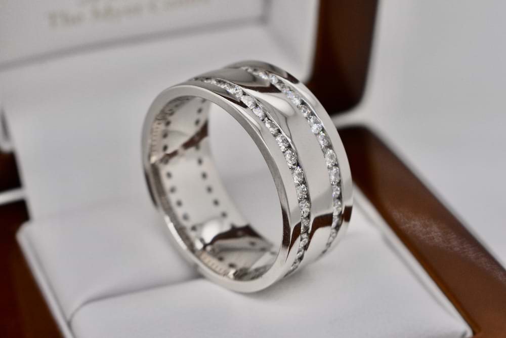 Exquisite and striking, this bespoke gentleman's wedding band has been crafted entirely in platinum and features 76 scintillating round brilliant cut diamonds channel set into two parallel rows going eternally around the band. The band is 9.8mm wide, with an internal luxury finish and a total of 2.61cts of D-F colour, VS/SI diamonds. Independent Valuation Supplied. This bespoke creation is being enjoyed by its new owner, if you are inspired by this archived design contact us today to discuss how we can create something incredible for you or your loved one.