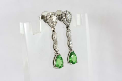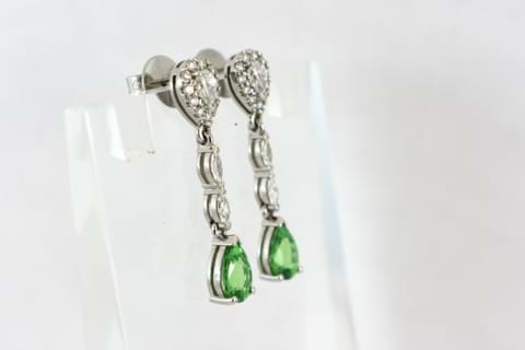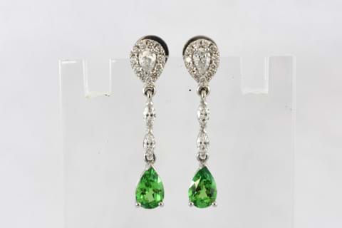 This truly exquisite pair of drop earrings were designed in store and created with exceptional workmanship in platinum in our workshop. With the bright and vivid green garnets (totaling 2.78cts) sourced and selected especially to match their owners existing pendant, these earrings are an elegant inspiration. They begin with a shimmering pearshape diamond halo stud followed by a streamlined drop of marquise diamonds, leading ones eye to the impeccable garnets suspended at the base. These earrings contain a total of 1.32cts of high white diamonds and have been be seen to be fully appreciated. Independent Valuation Supplied. If you are inspired by this archived design contact us today to discuss how we can create something incredible for you or your loved one