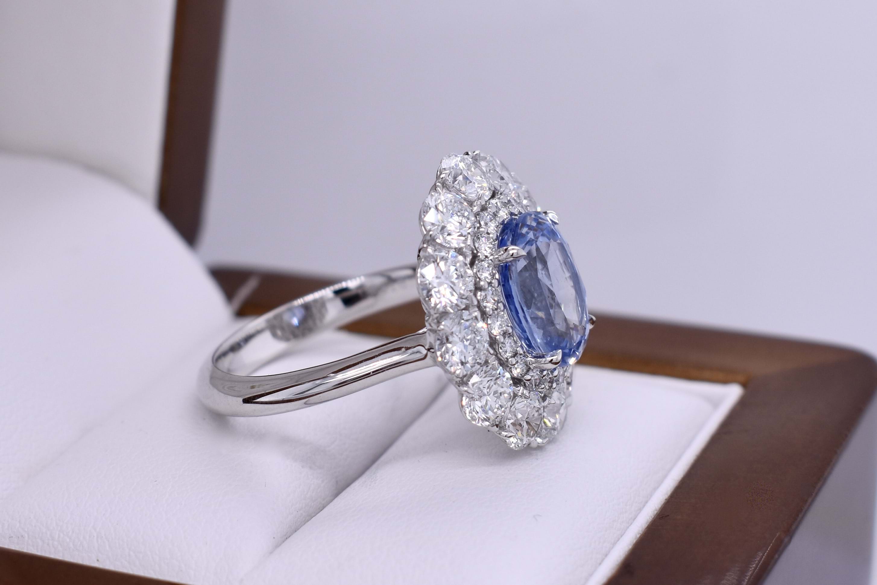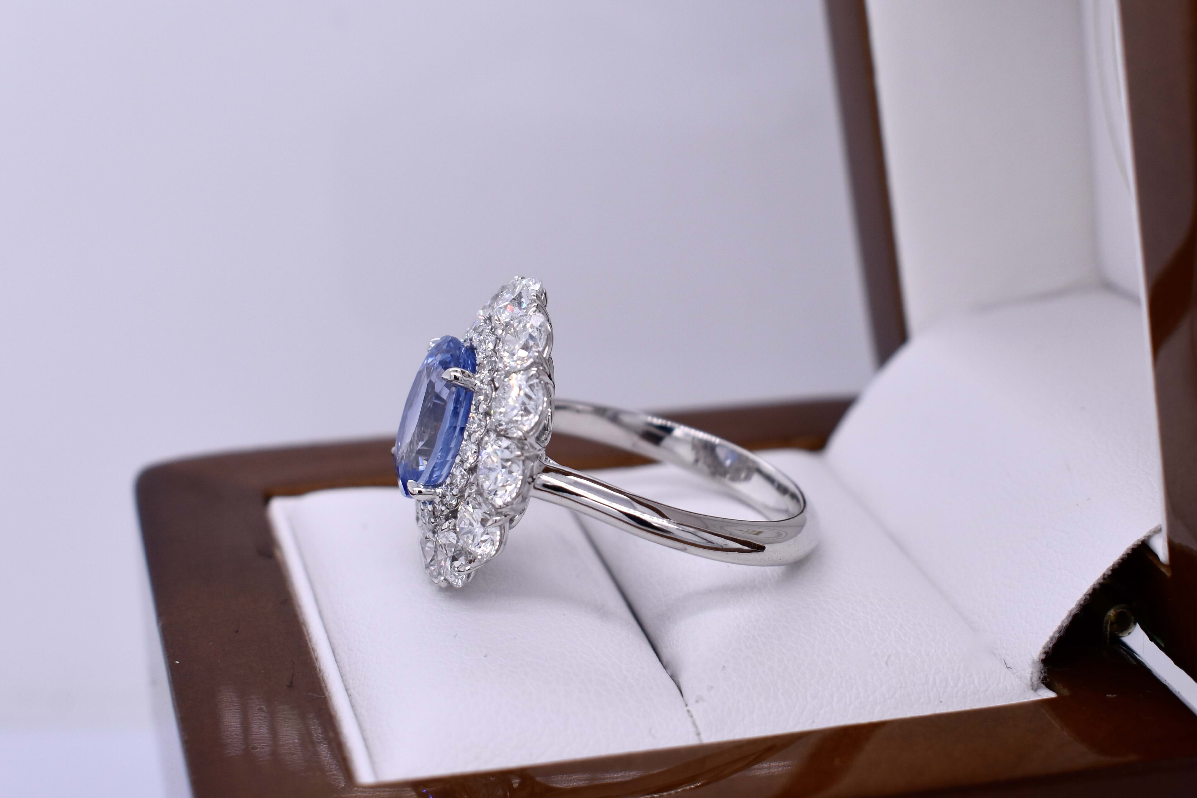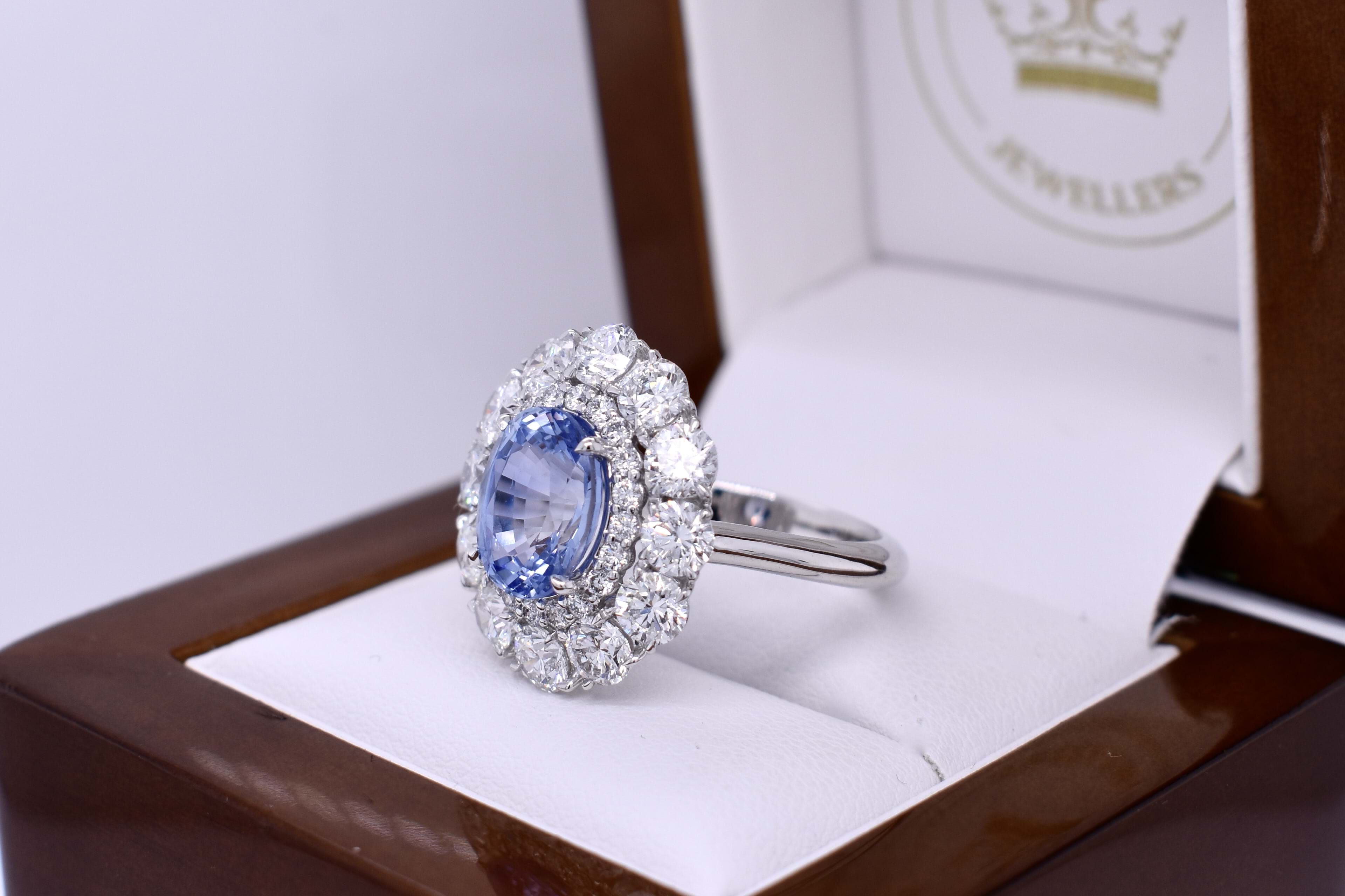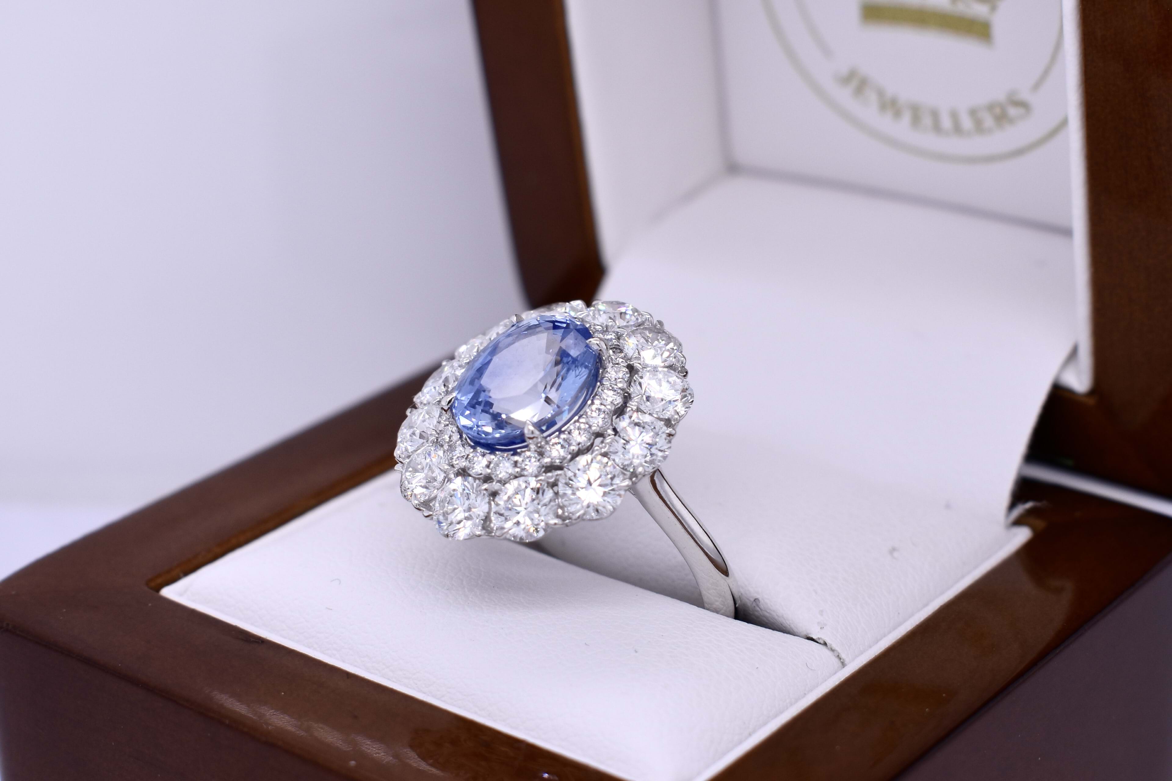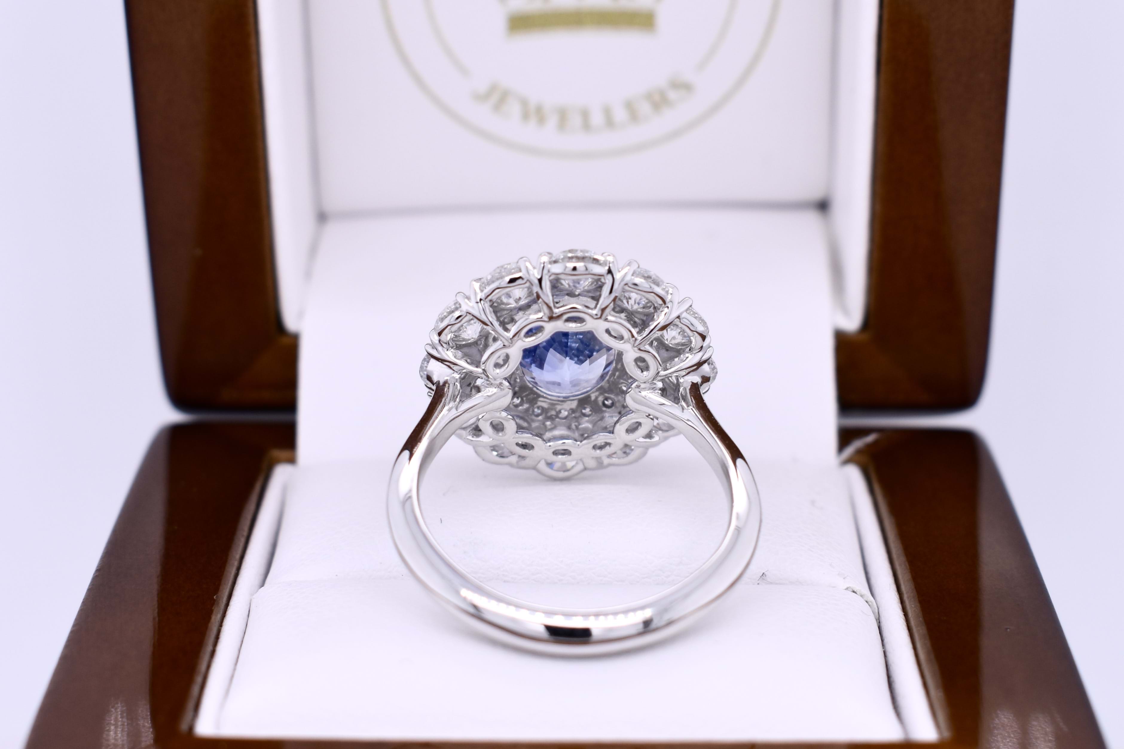 Stunning bespoke platinum cluster ring featuring a 4.30ct, bright light-mid blue, Ceylon sapphire sourced especially for our client and surrounded by an inner halo of small round brilliant cut diamonds and an outer halo of larger round brilliant cut diamonds to create a large, sparkling, cluster design. The ring contains a total diamond content of 3.44cts. Independent Valuation Supplied.