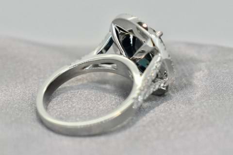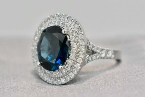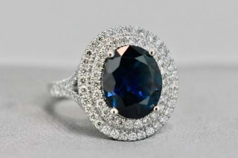This exceptionally bright, dark blue, Australian sapphire is an impressive 4.43cts and is accompanied by a GSL lab certificate. Hand chosen in store by the client this exquisite sapphire has been set into a beautifully tactile platinum, double halo, engagement ring. Containing 80 round brilliant cut diamonds shimmering throughout the halos and down the shoulders with a combined total of 0.88cts this eye catching ring has been designed to sit perfectly with wedding bands. This bespoke creation is being enjoyed by its new owner, if you are inspired by this archived design contact us today to discuss how we can create something incredible for you or your loved one. Independent Valuation & GSL Certificate supplied