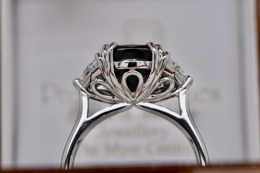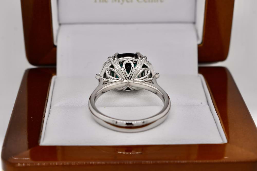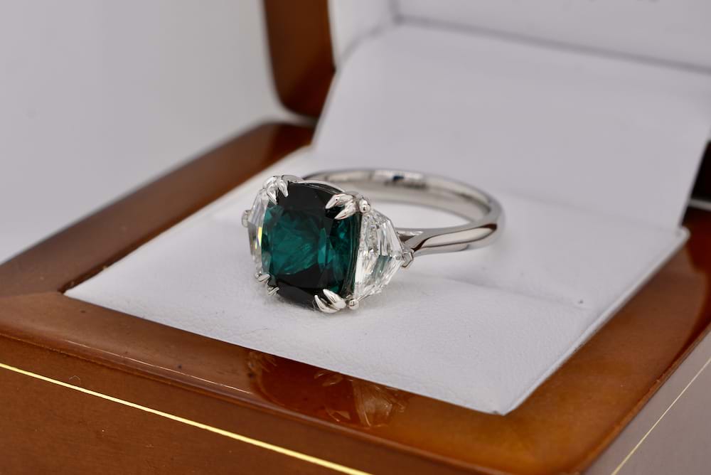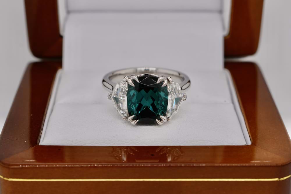 This rare and scintillating 4.71ct Indicolite tourmaline was deserving of spectacular side stones and it was not let down by these sensational Cadillac step cut diamonds totalling 1.02cts. A bespoke piece designed in store and expertly crafted in our workshop, the ring is crafted entirely in platinum and features beautiful sweeping lines and angles giving this large piece a timeless and innately feminine feel. Independent Valuation Supplied.