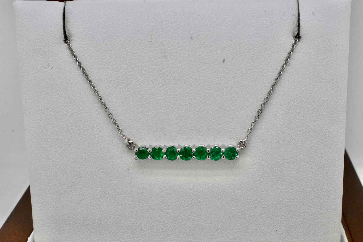 Sleek and striking platinum necklace featuring a horizontal bar set with seven, moderately bright and deeply saturated green emeralds cut down claw set and suspended from a trace link chain. Designed to be worn on its own or stacked with other necklaces. Independent Valuation Supplied.