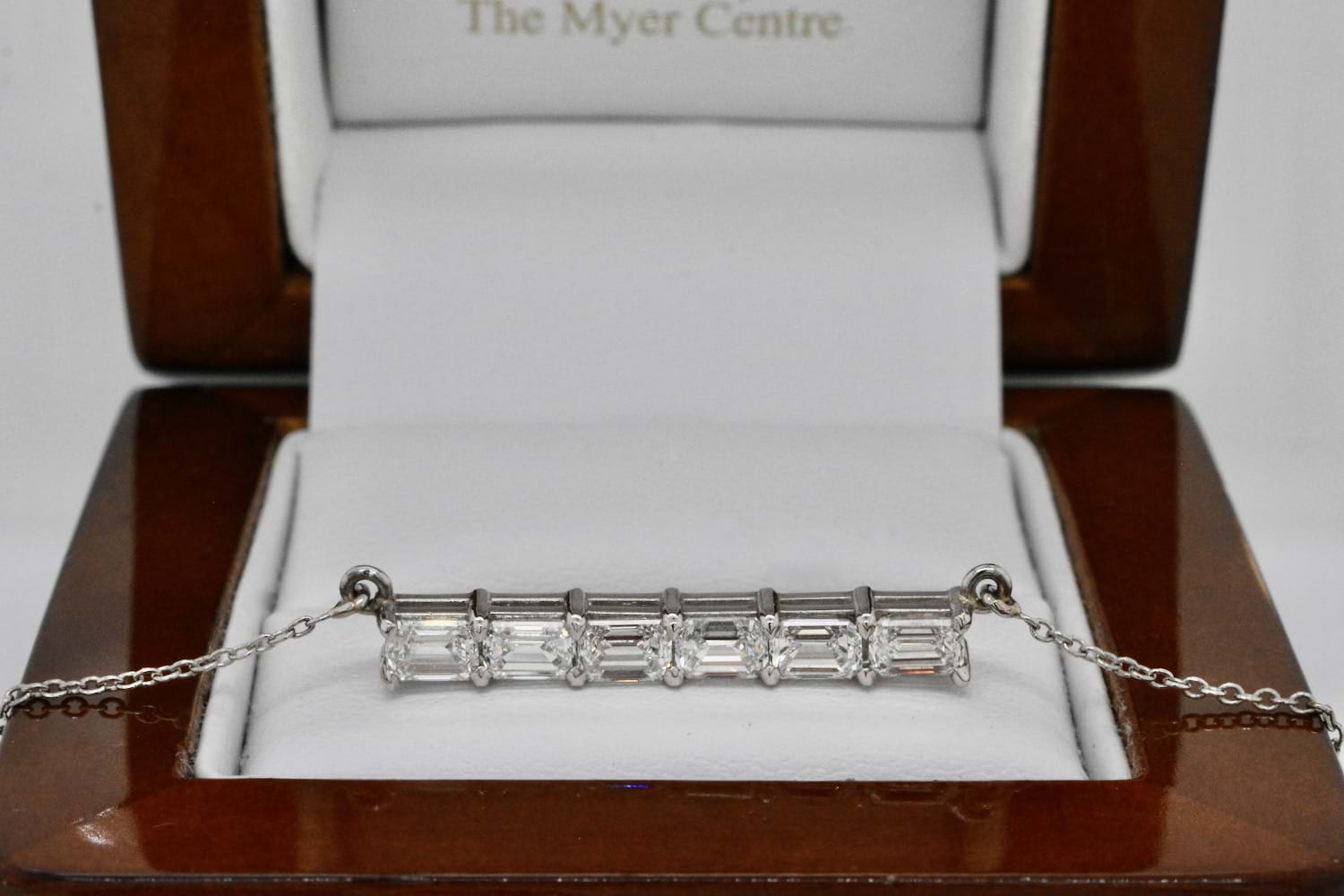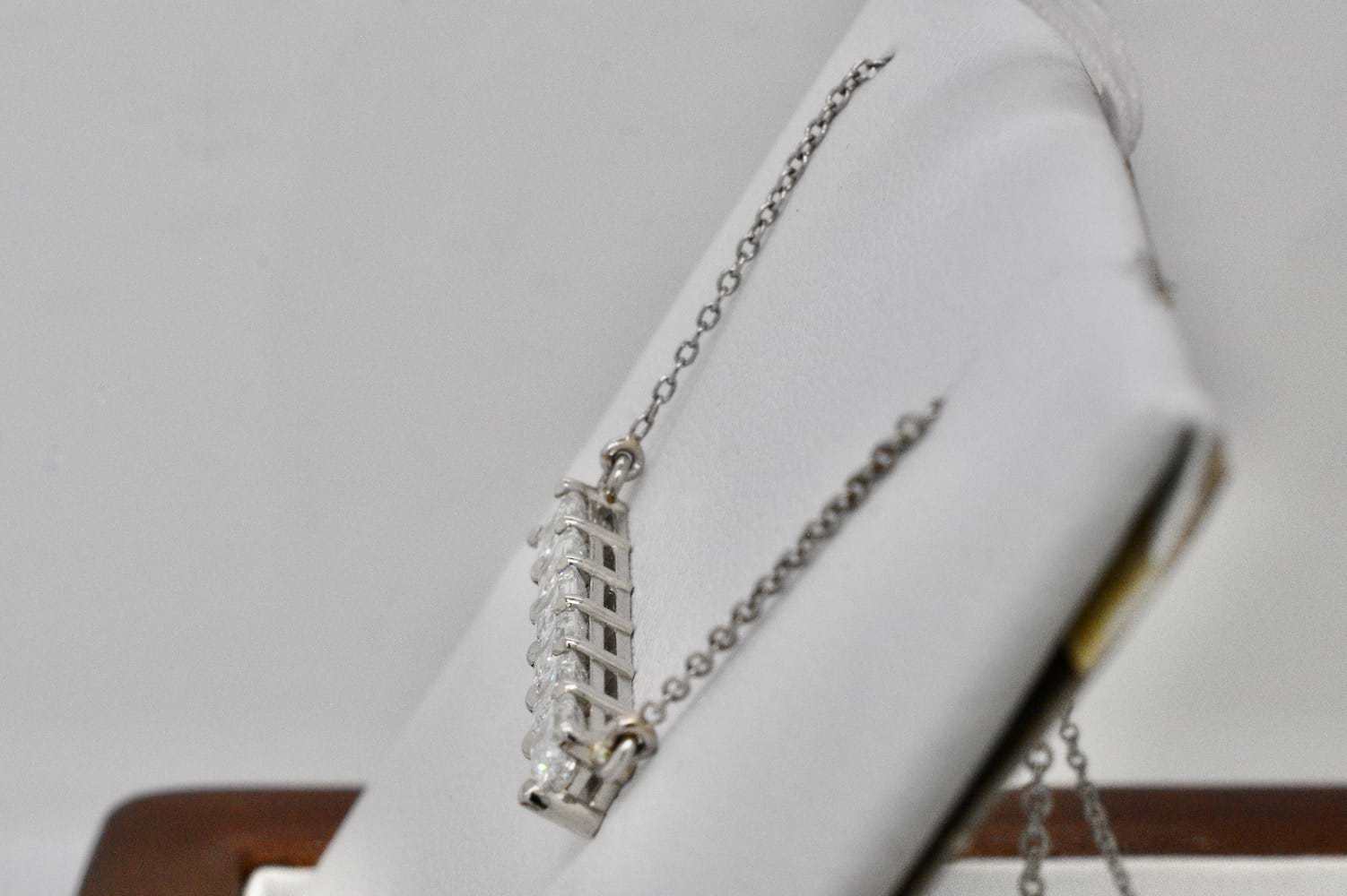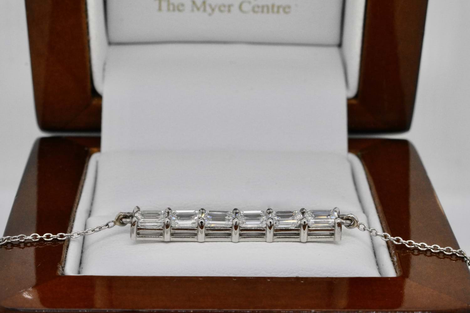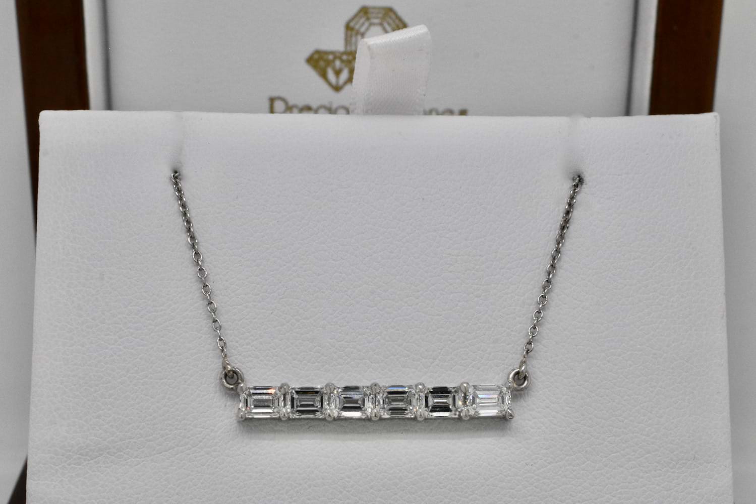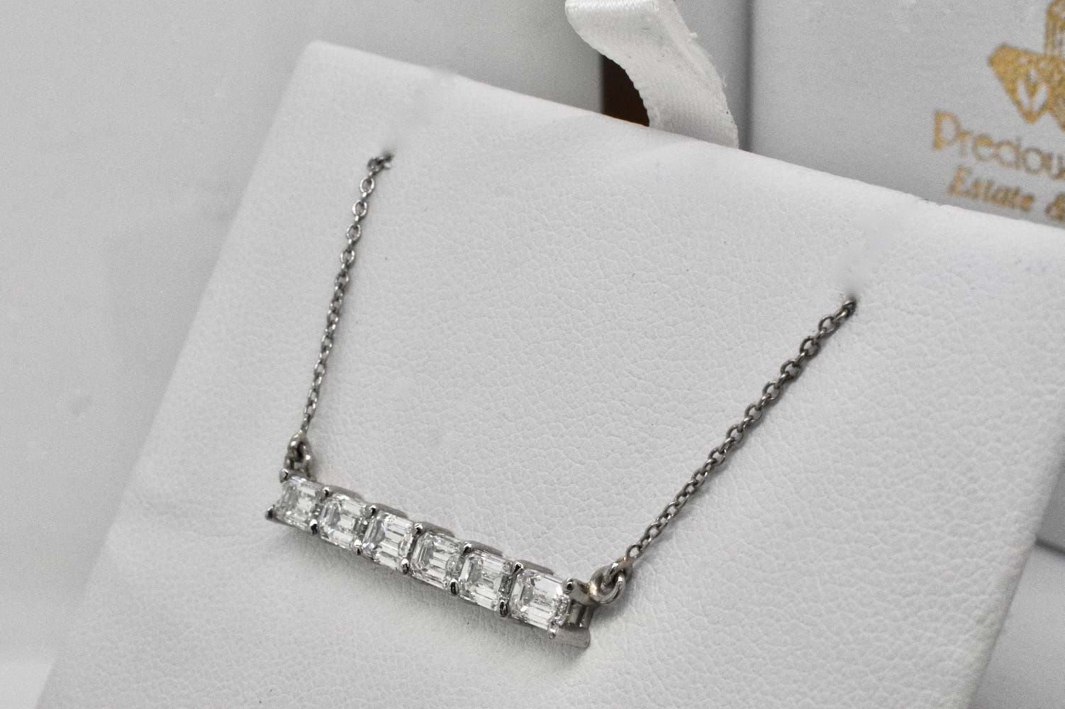 This stunning emerald cut bar pendant features eight scintillating emerald cut diamonds, each individually chosen to fit perfectly, claw set in a horizontal bar and suspended from a fine trace link chain. The necklace is crafted entirely in platinum and the eight diamonds total 1.83cts. Independent Valuation Supplied. (Emerald bar necklace pictured for stacking inspiration)