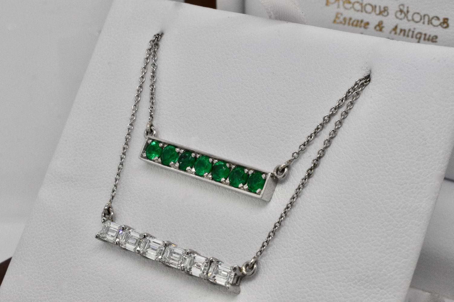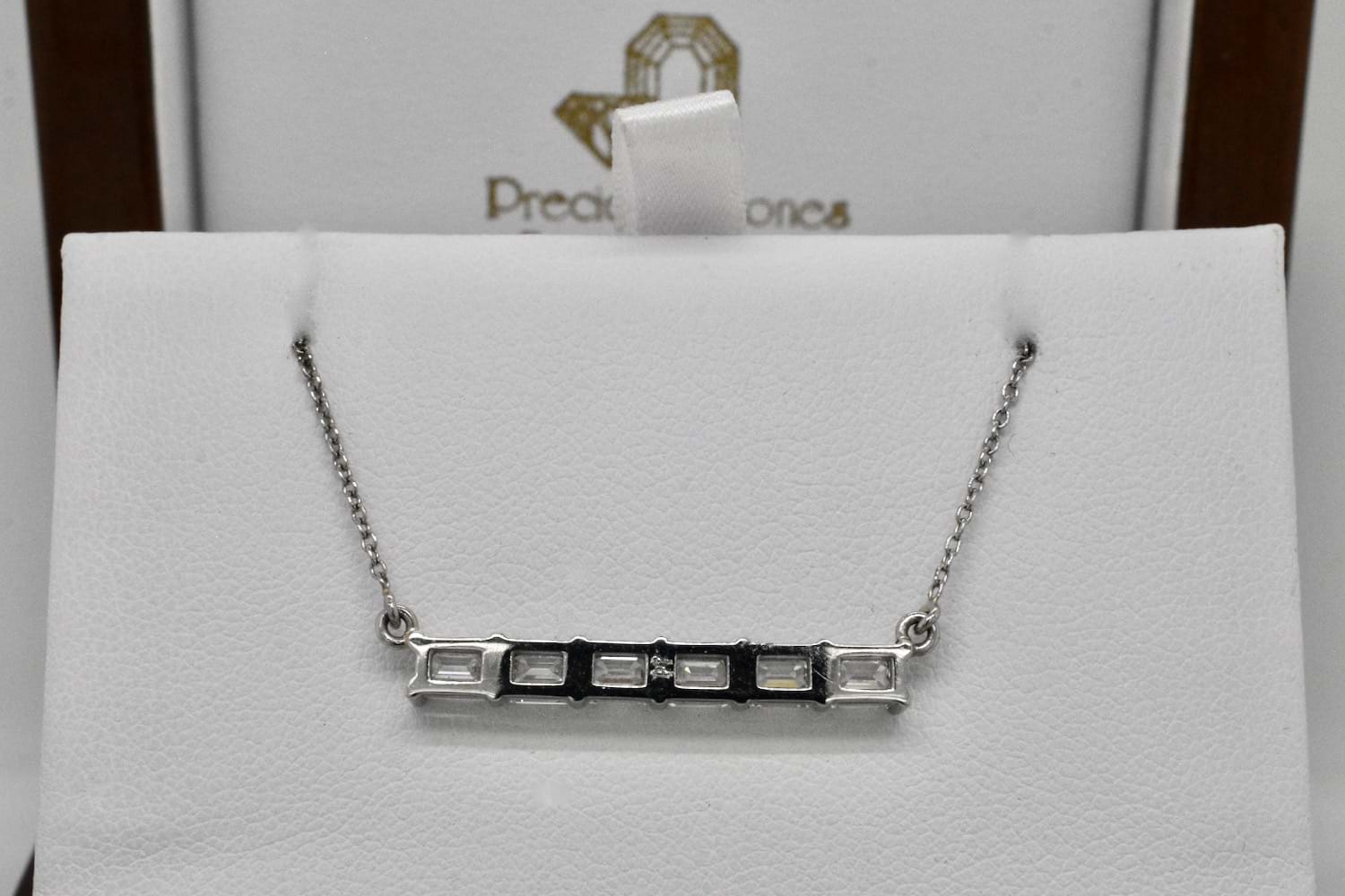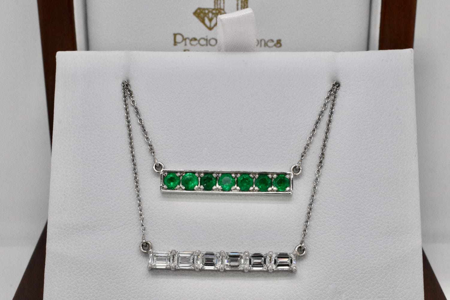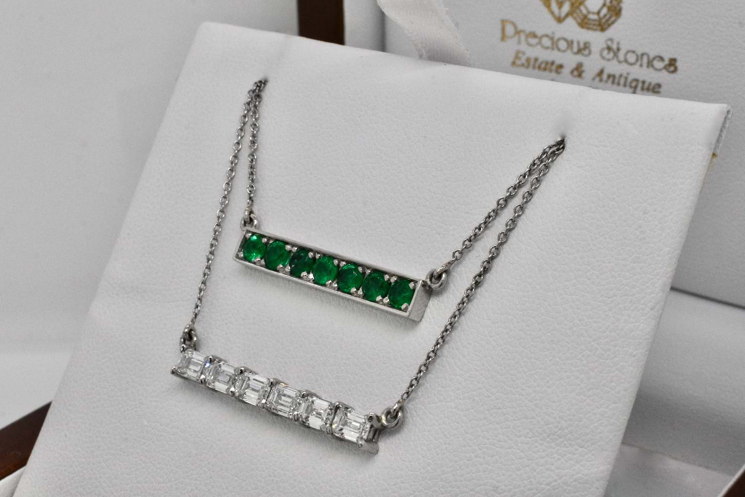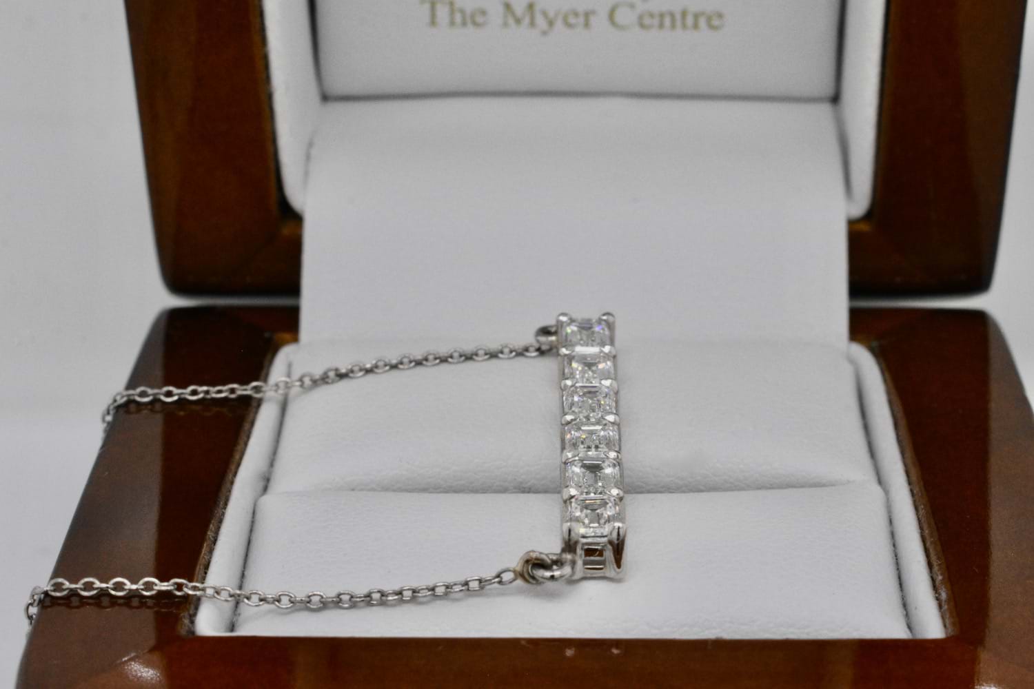 This stunning emerald cut bar pendant features eight scintillating emerald cut diamonds, each individually chosen to fit perfectly, claw set in a horizontal bar and suspended from a fine trace link chain. The necklace is crafted entirely in platinum and the eight diamonds total 1.83cts. Independent Valuation Supplied. (Emerald bar necklace pictured for stacking inspiration)