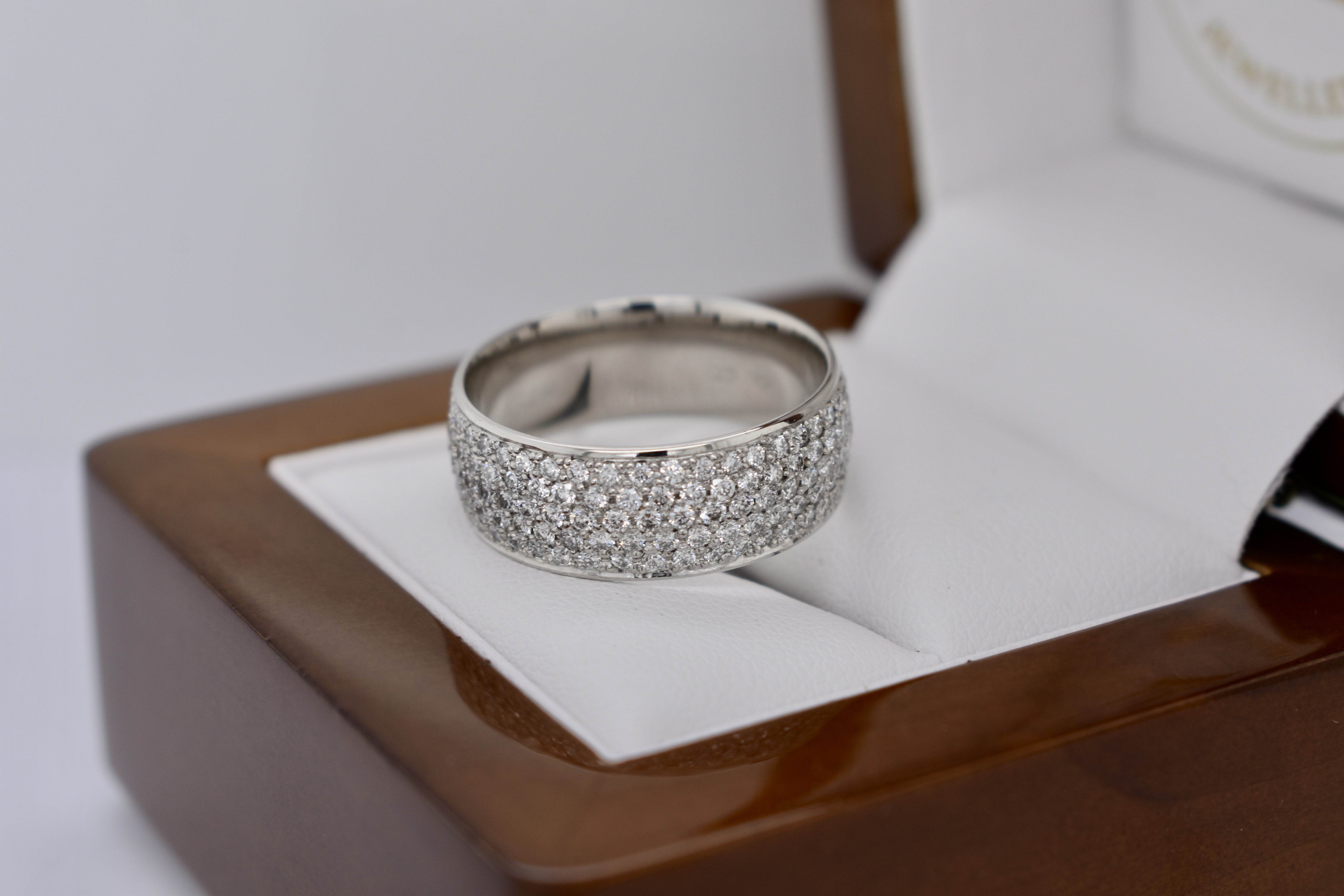 A tactile and stunning 8mm wide platinum band hand pave set with an incredible 210 scintillating round brilliant cut diamonds going all the way around the band in five rows. The 210 diamonds equal 2.10ct D-F colour. Independent Valuation Supplied.