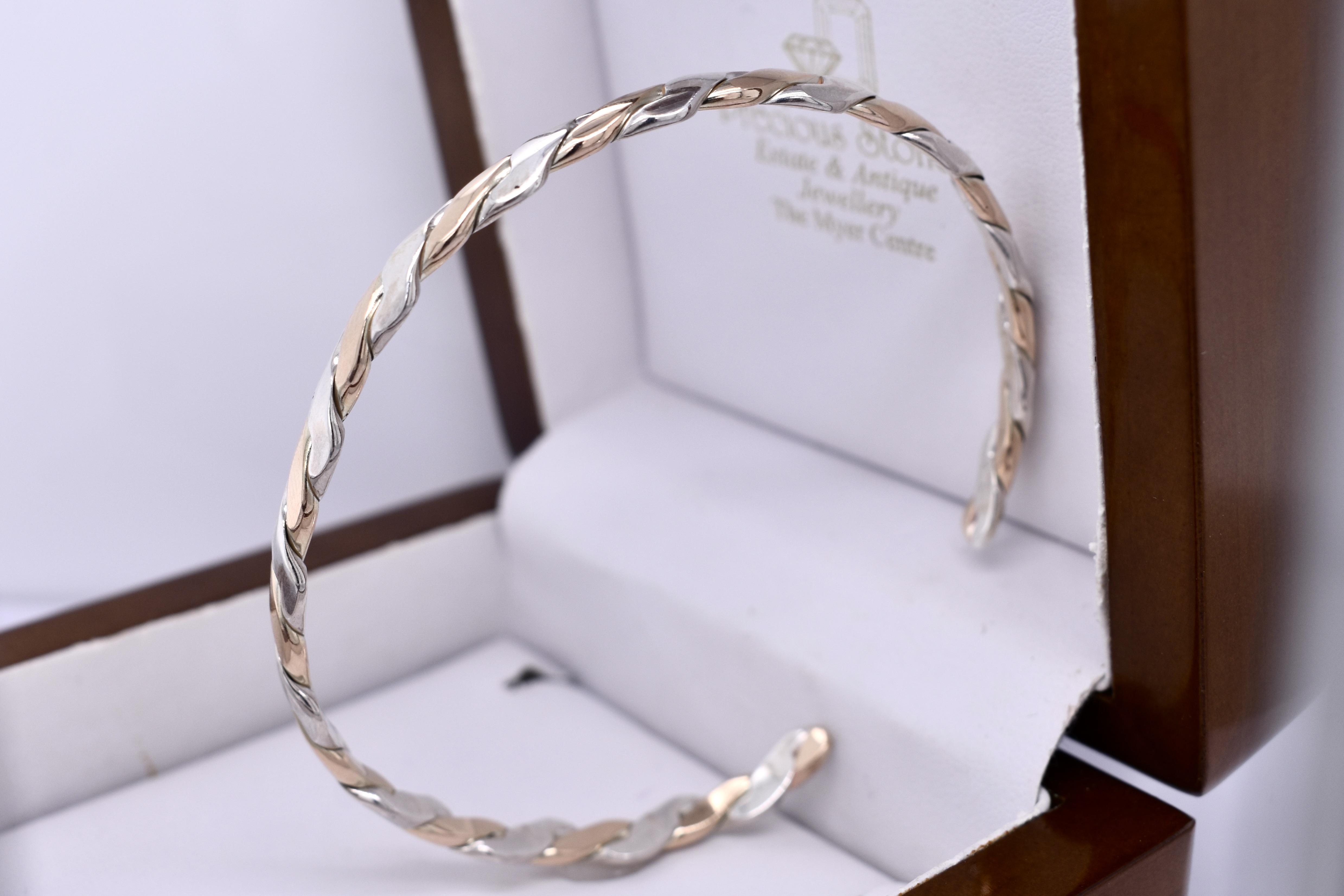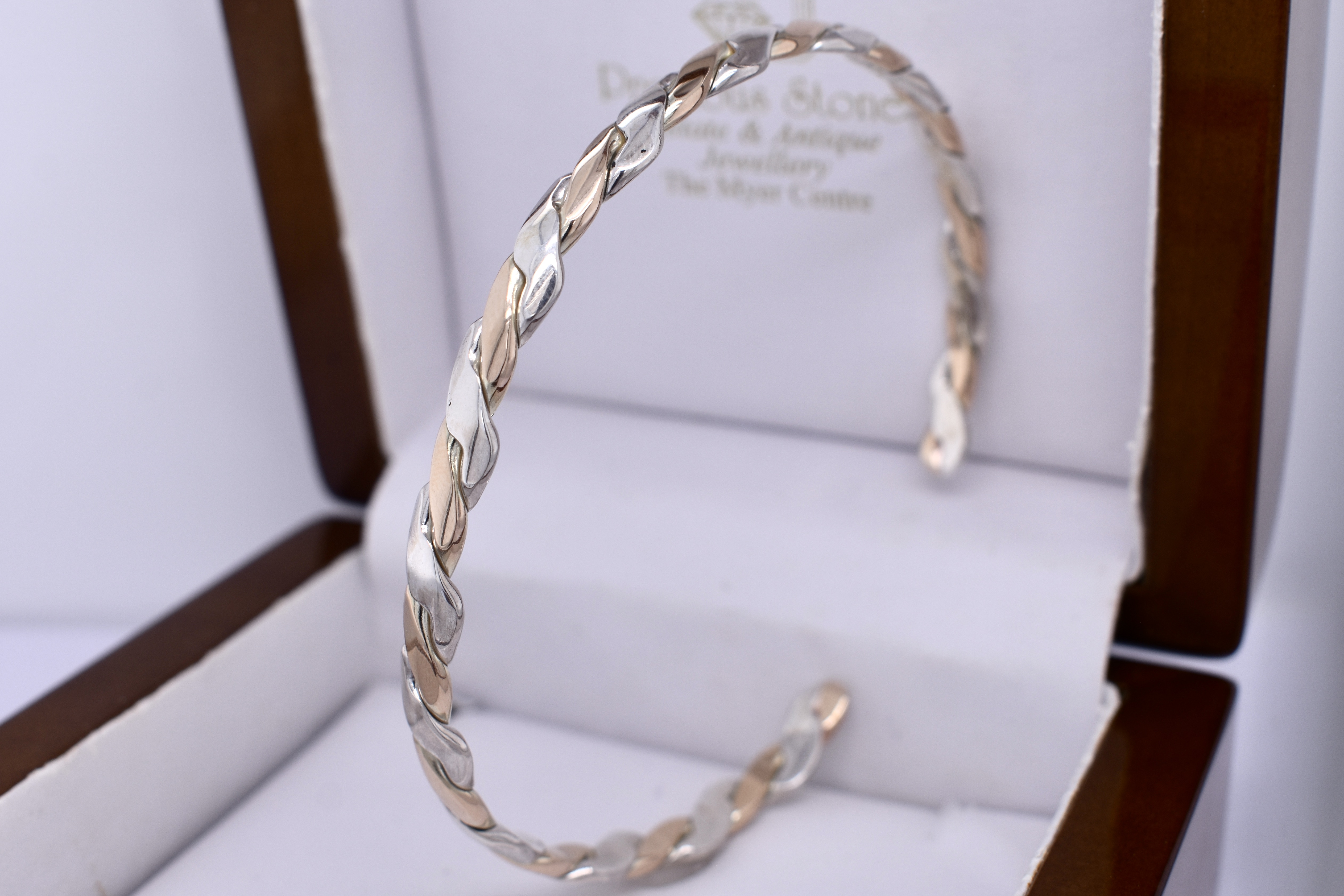 Handmade by our talented goldsmith this twist style cuff has been crafted in sterling silver and 9ct yellow gold. This particular cuff weighs 18grams, but can be made in varying metal combinations, widths and weights.