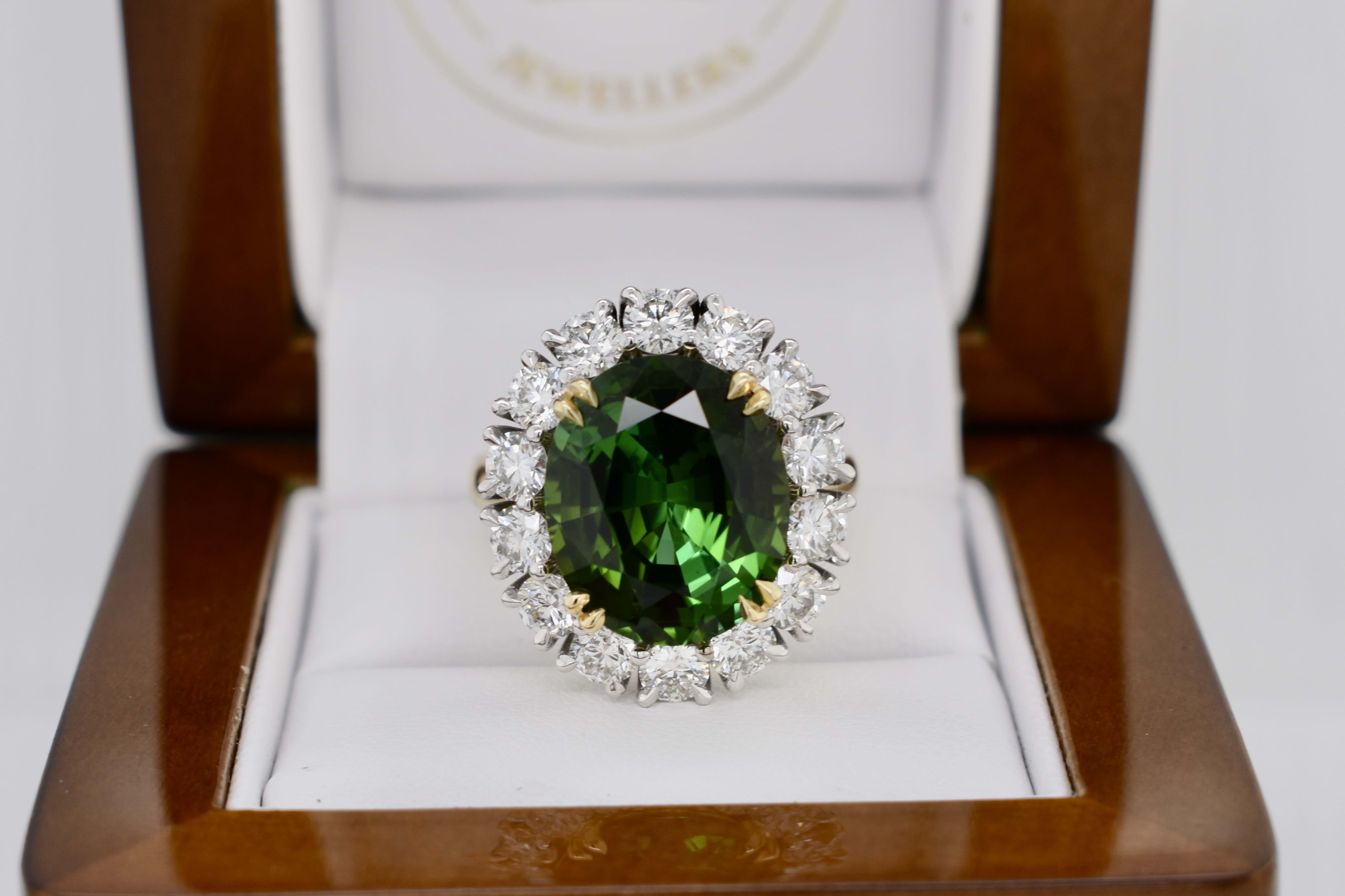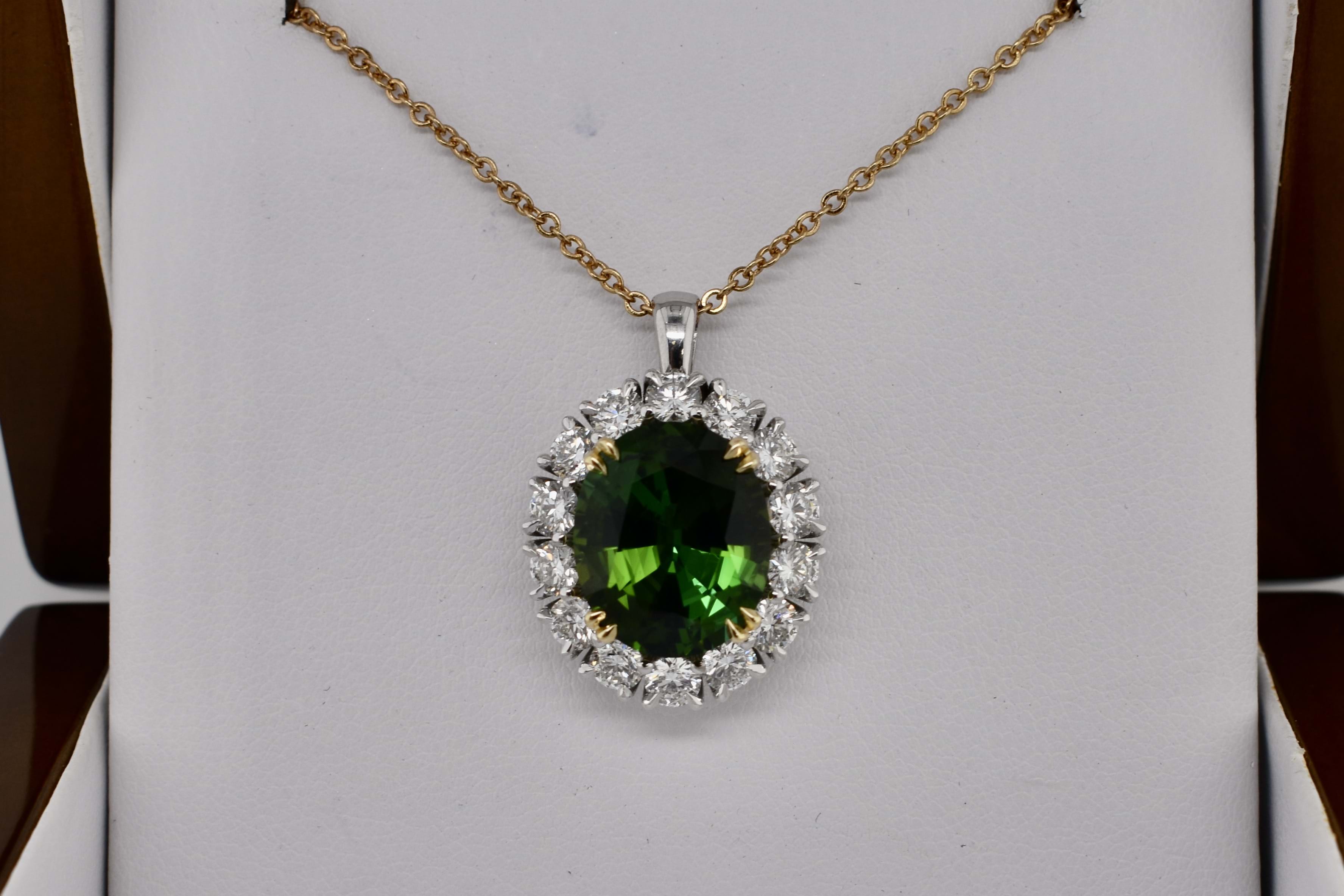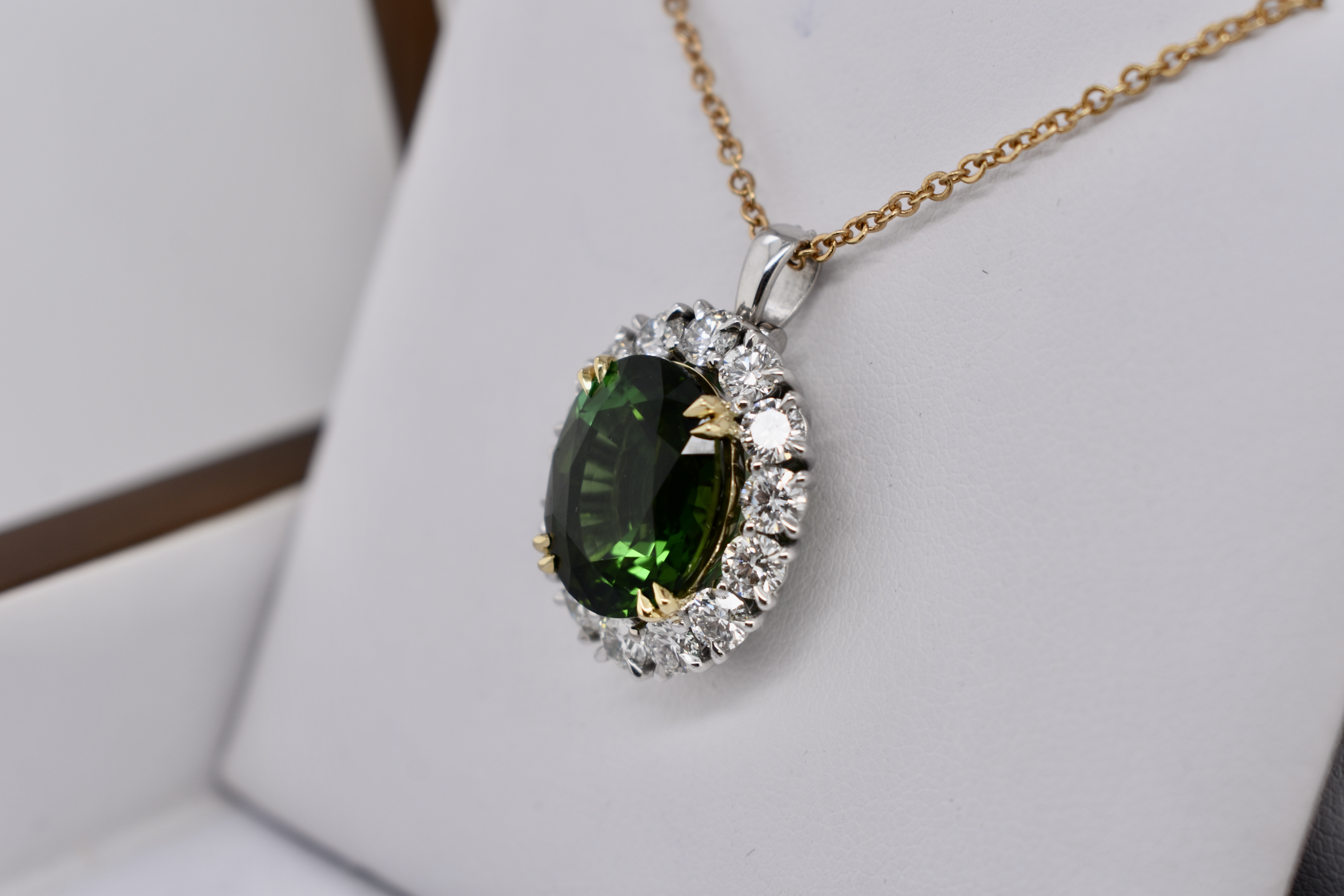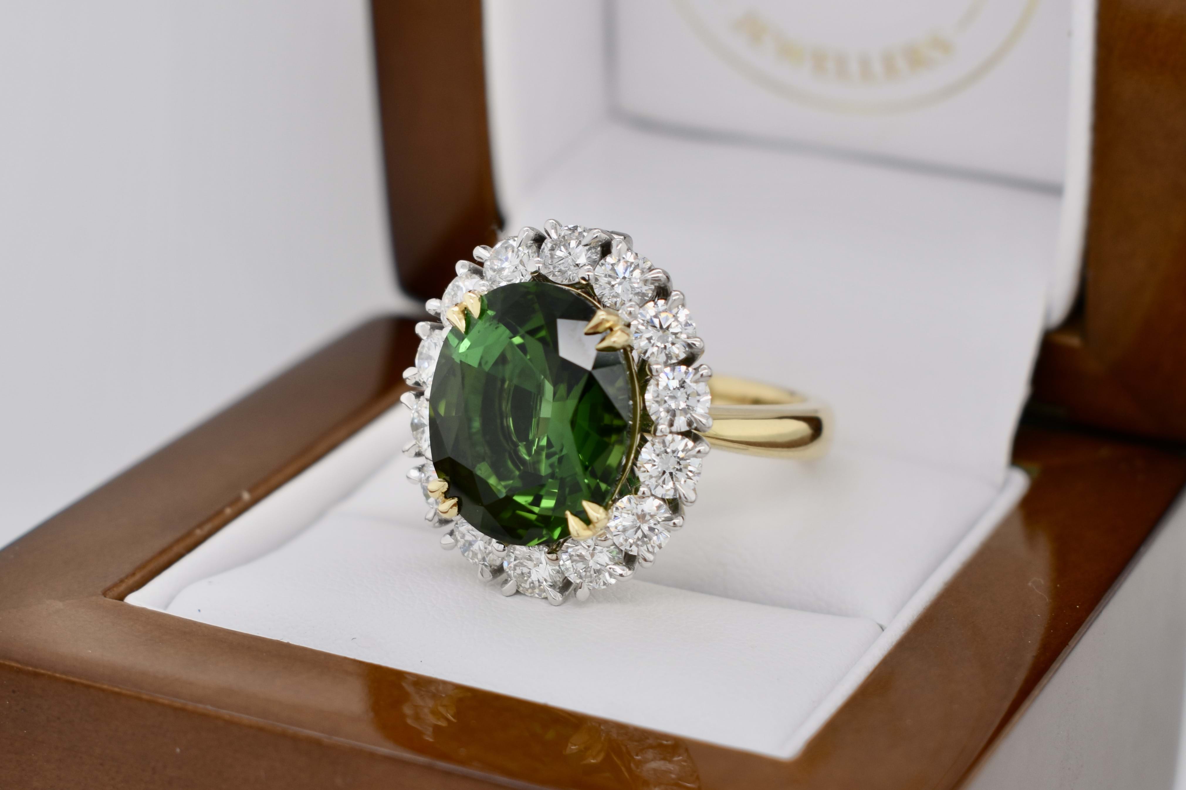 This spectacular bright dark green tourmaline is an impressive 9.56cts and is eye clean, it was sourced and selected to be the feature of this completely custom made convertible ring/pendant. Designed instore by our chief designers, this piece has been expertly crafted in our workshop in 18ct yellow and white gold. The tourmaline has been yellow gold double talon set in the centre of a scintillating surround of large, high white, round brilliant cut diamonds set individually in white gold four claw settings. The fourteen diamonds total a stunning 2.58cts and are D-F colour and VS-SI clarity. Finger size is O (can be resized if required) and the bale has been crafted as a simple white gold plain bale.