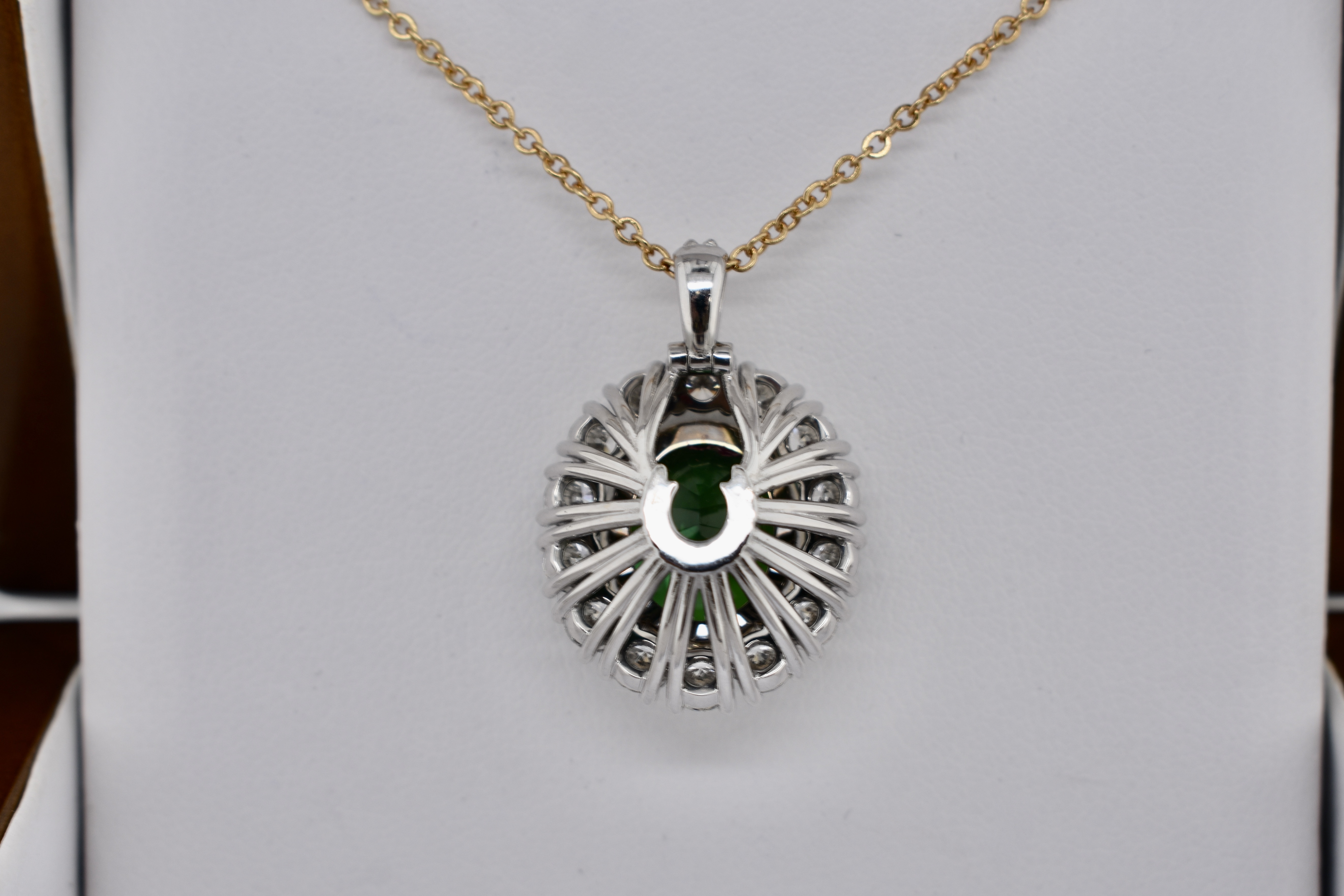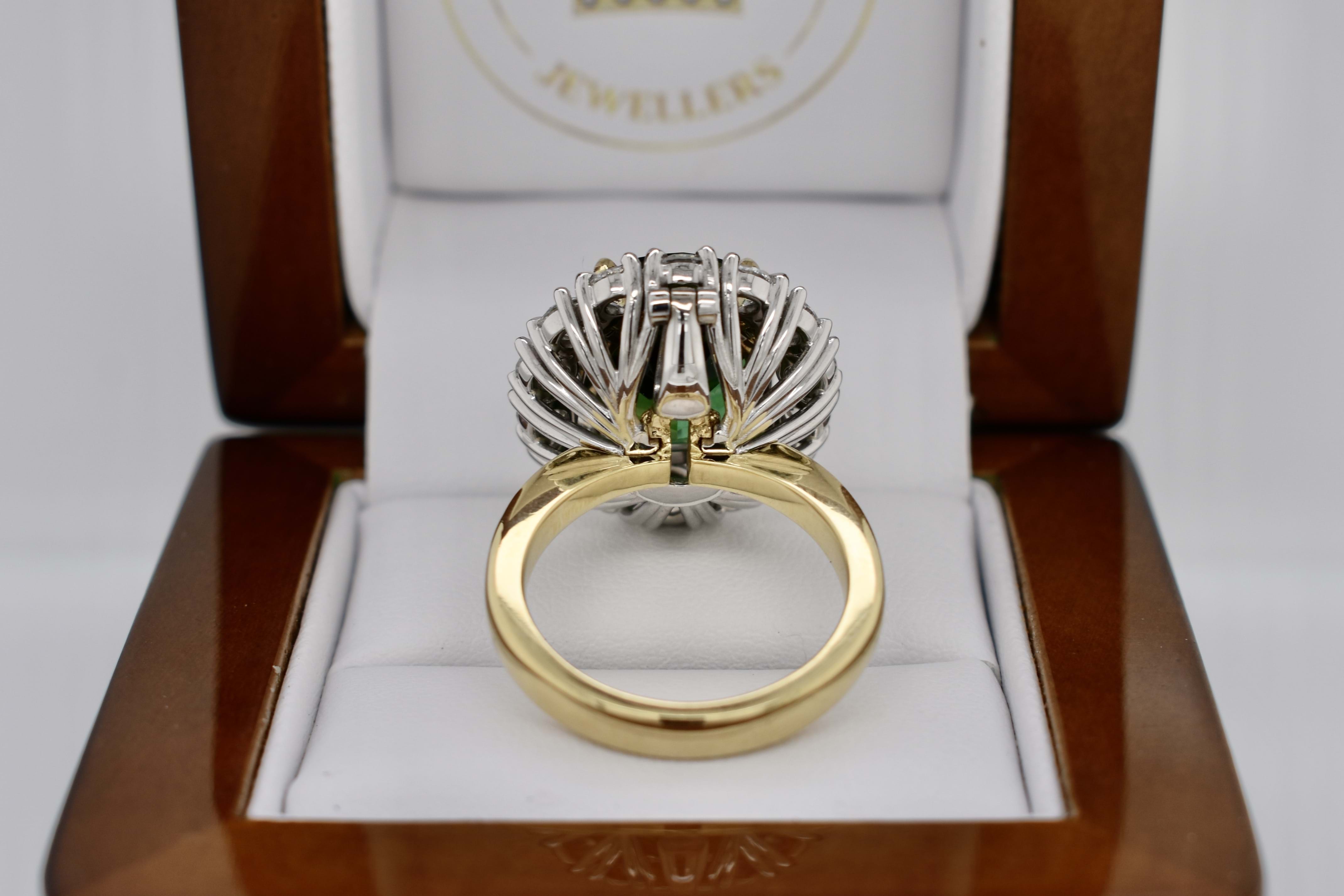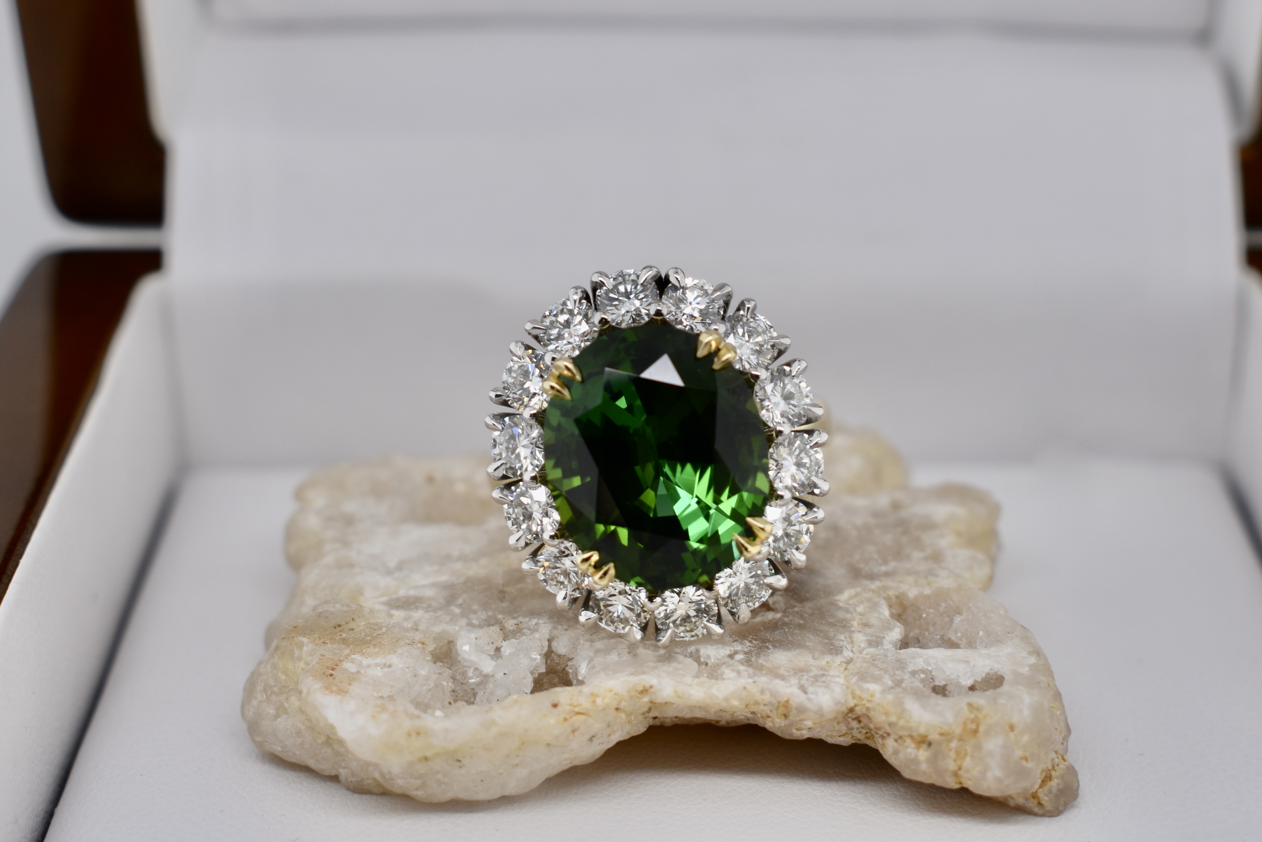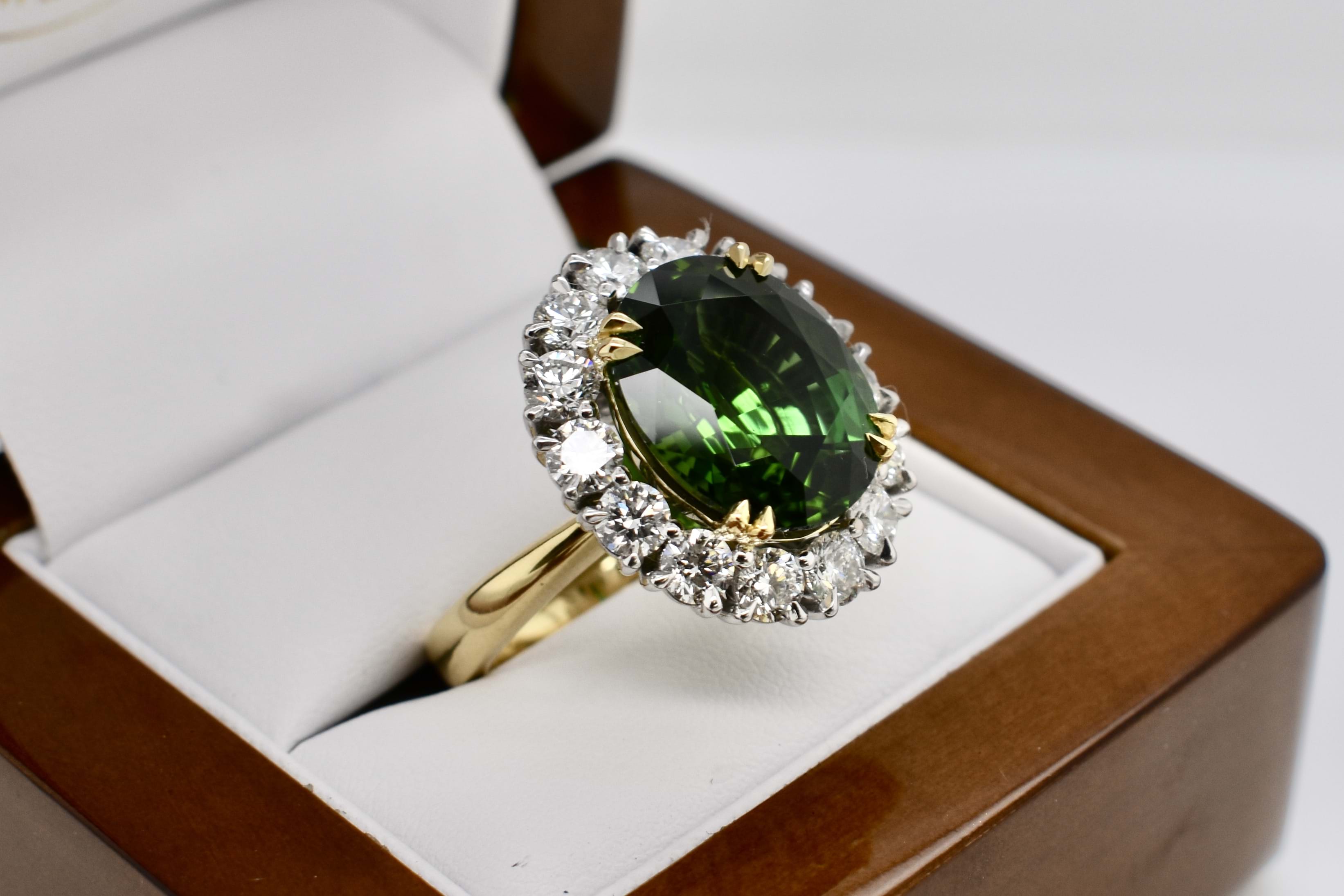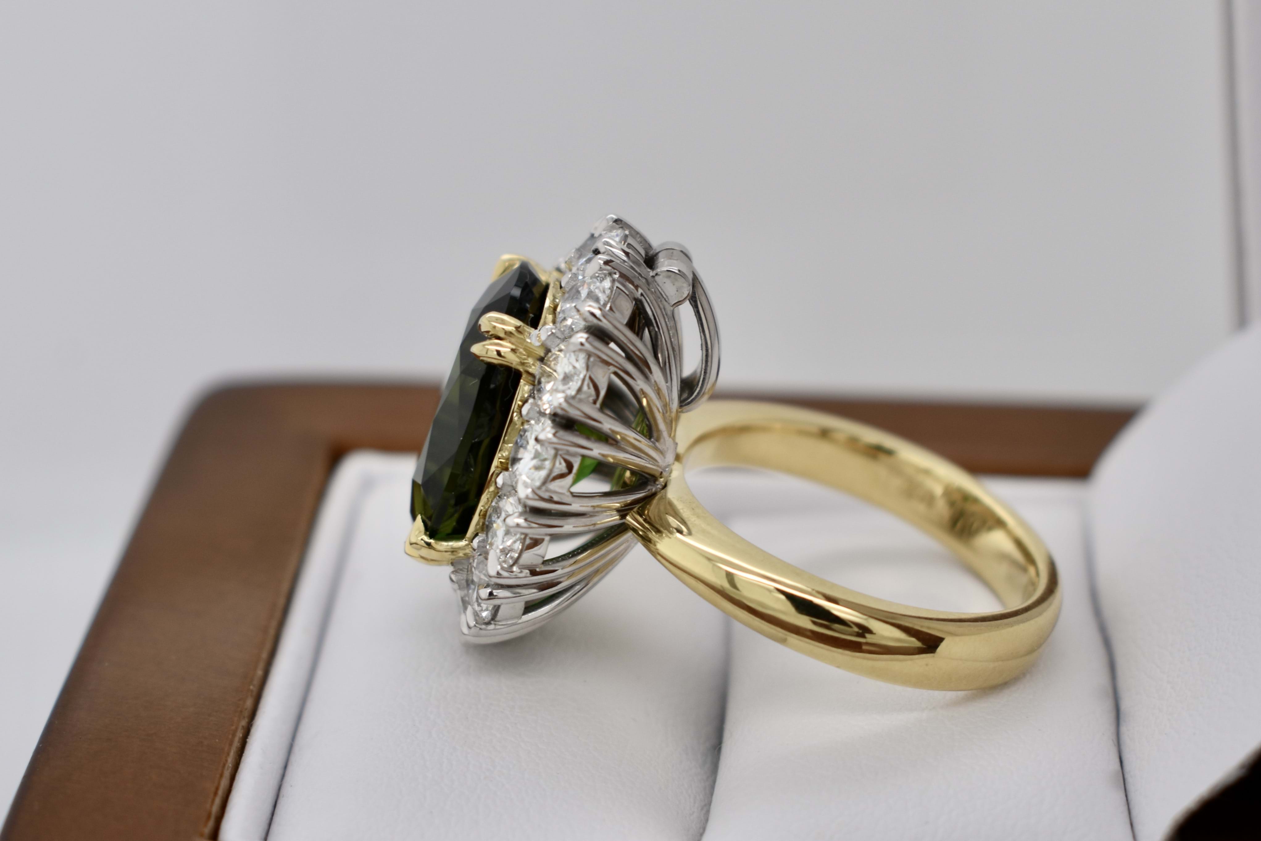 This spectacular bright dark green tourmaline is an impressive 9.56cts and is eye clean, it was sourced and selected to be the feature of this completely custom made convertible ring/pendant. Designed instore by our chief designers, this piece has been expertly crafted in our workshop in 18ct yellow and white gold. The tourmaline has been yellow gold double talon set in the centre of a scintillating surround of large, high white, round brilliant cut diamonds set individually in white gold four claw settings. The fourteen diamonds total a stunning 2.58cts and are D-F colour and VS-SI clarity. Finger size is O (can be resized if required) and the bale has been crafted as a simple white gold plain bale.