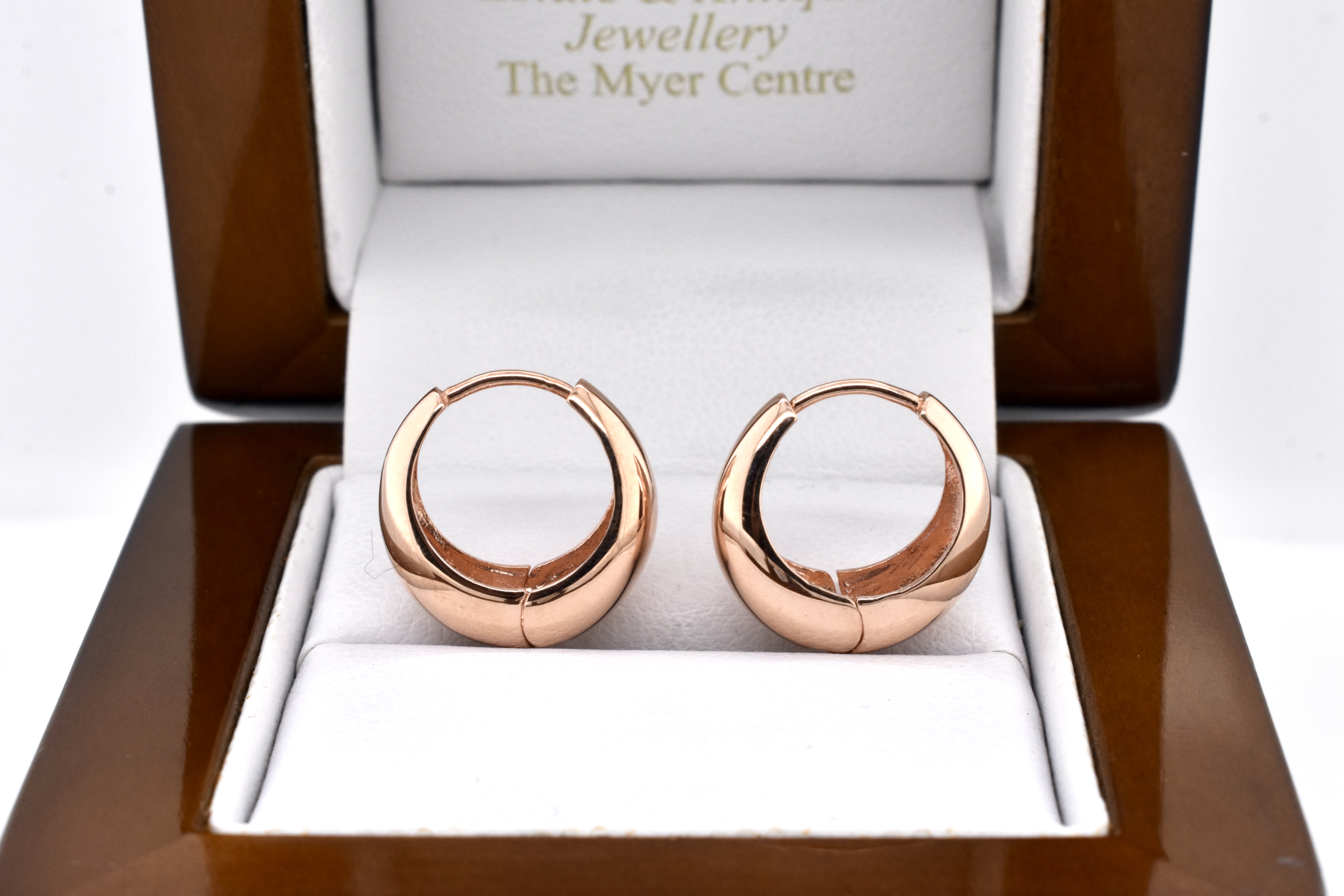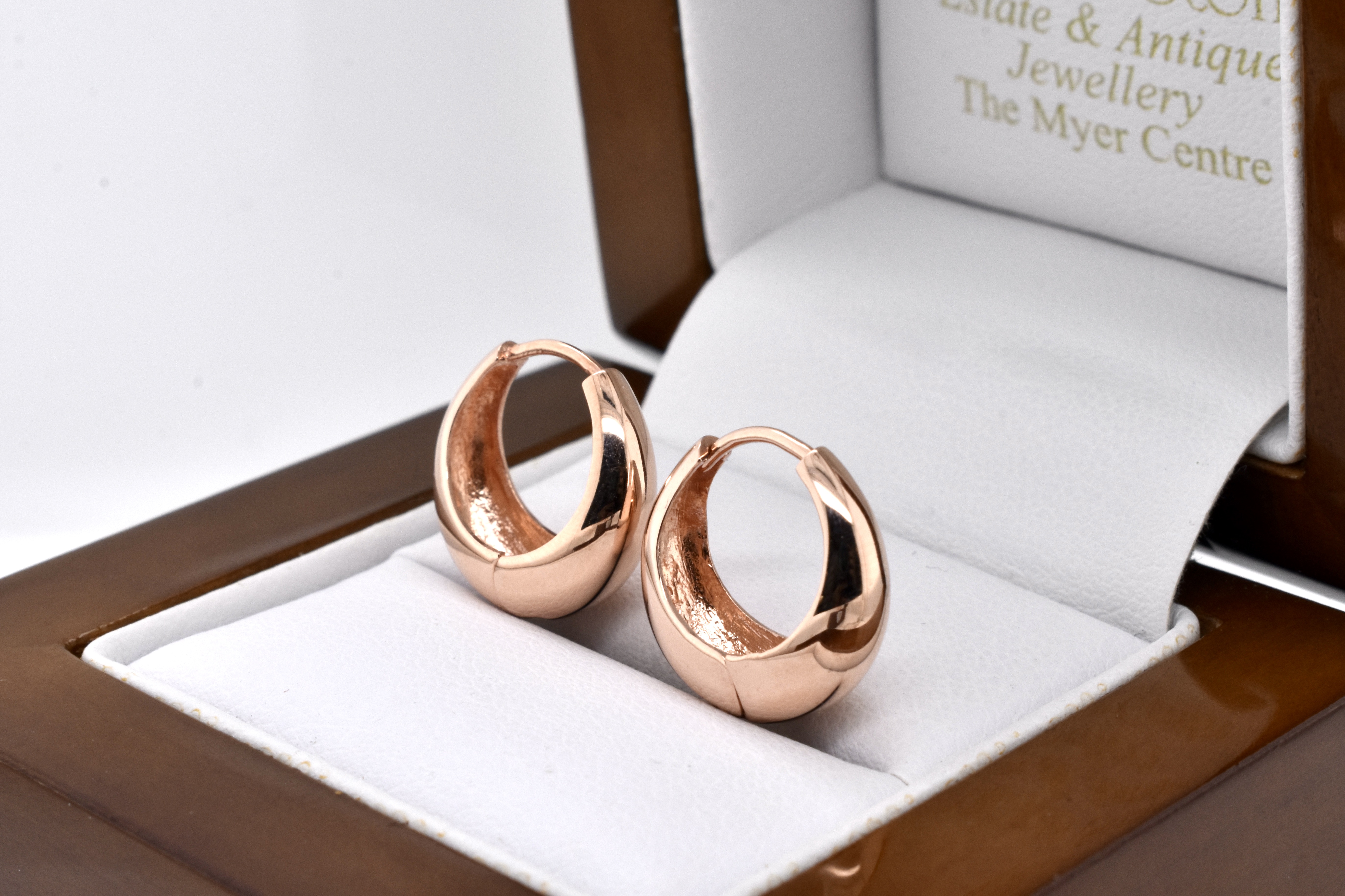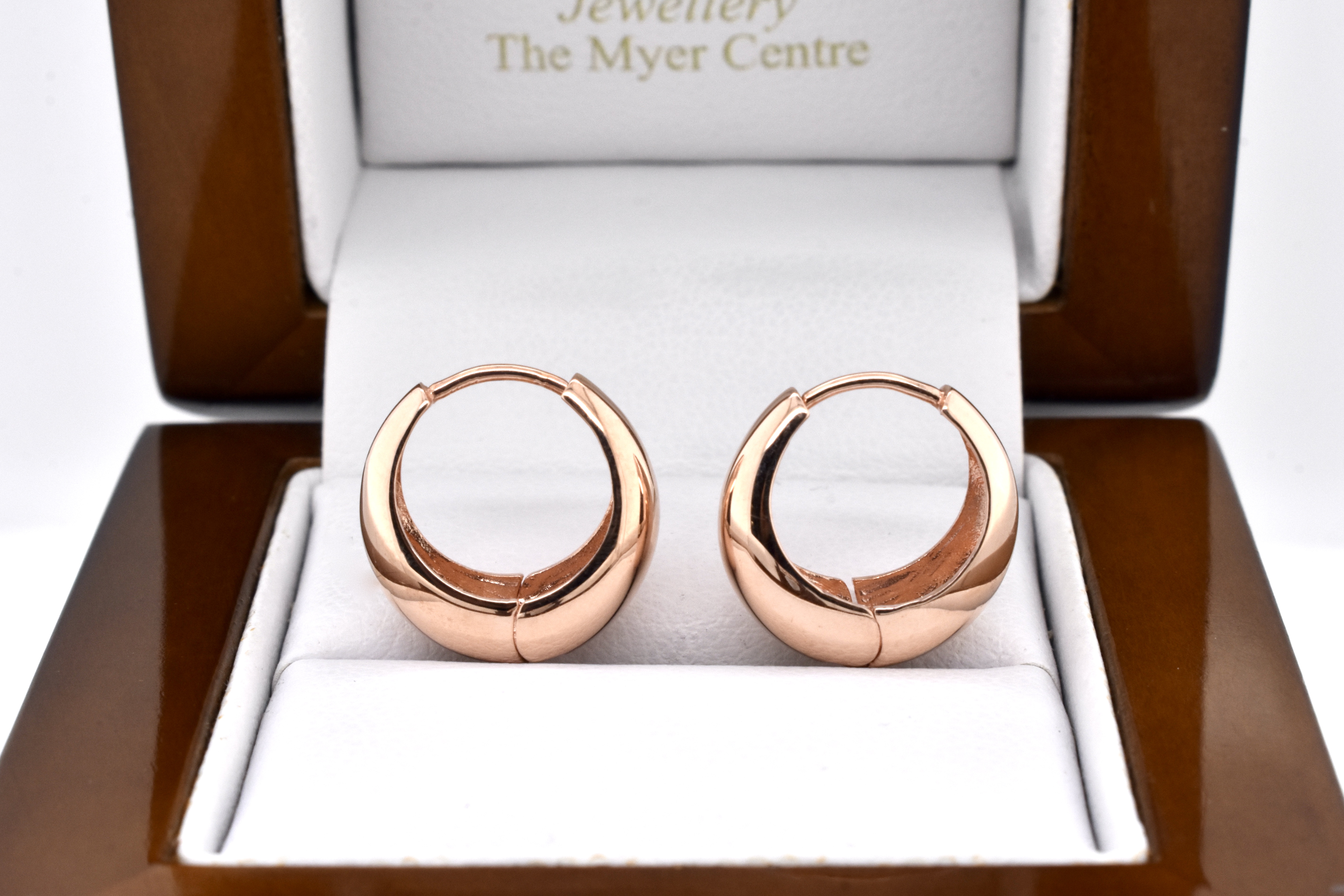 A sweet, everyday pair of huggies made from 9ct rose gold in a tapered, puffy round shape hinged at the bottom with clipped post fittings. Huggies measure approx. 15mm round and are 6mm wide