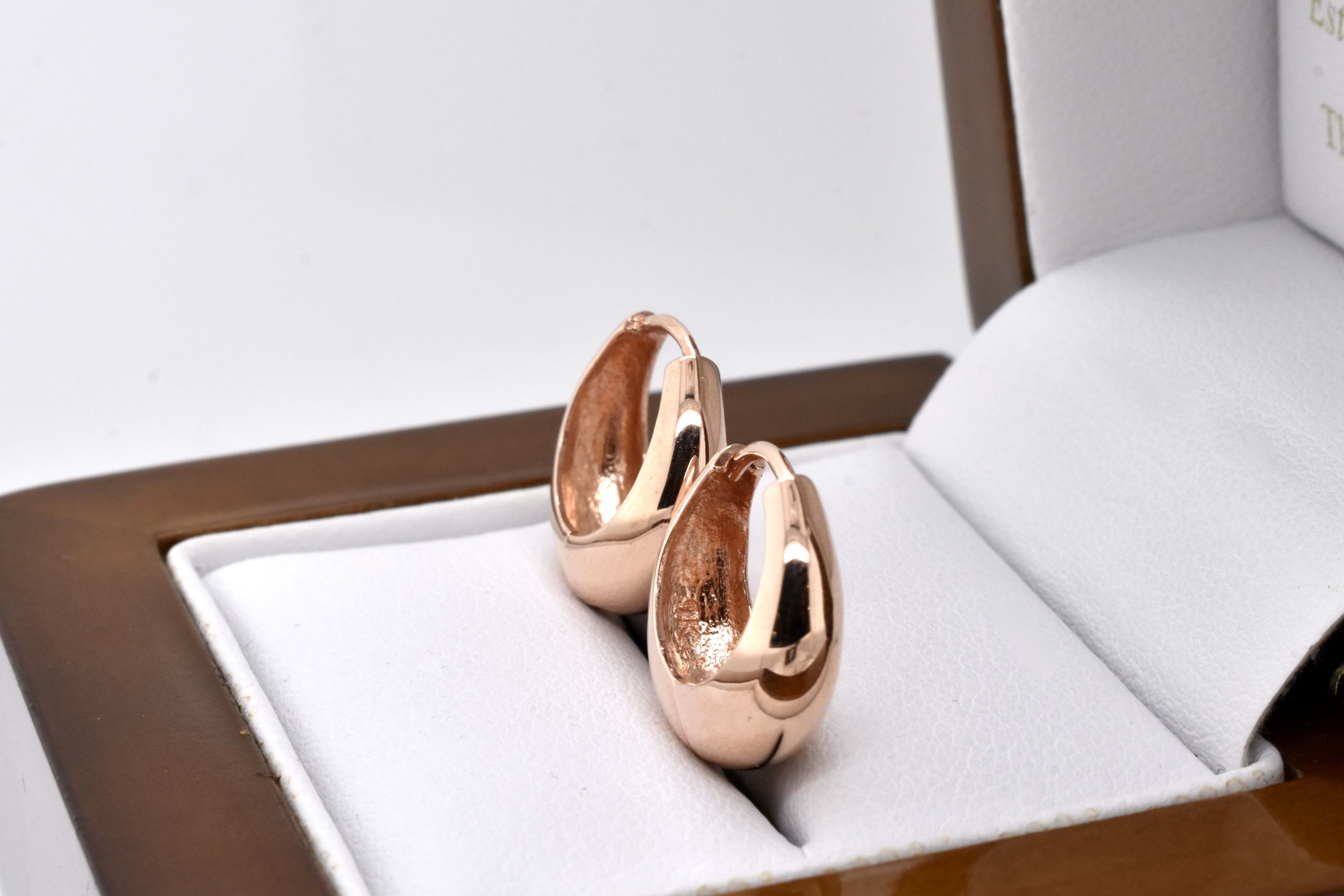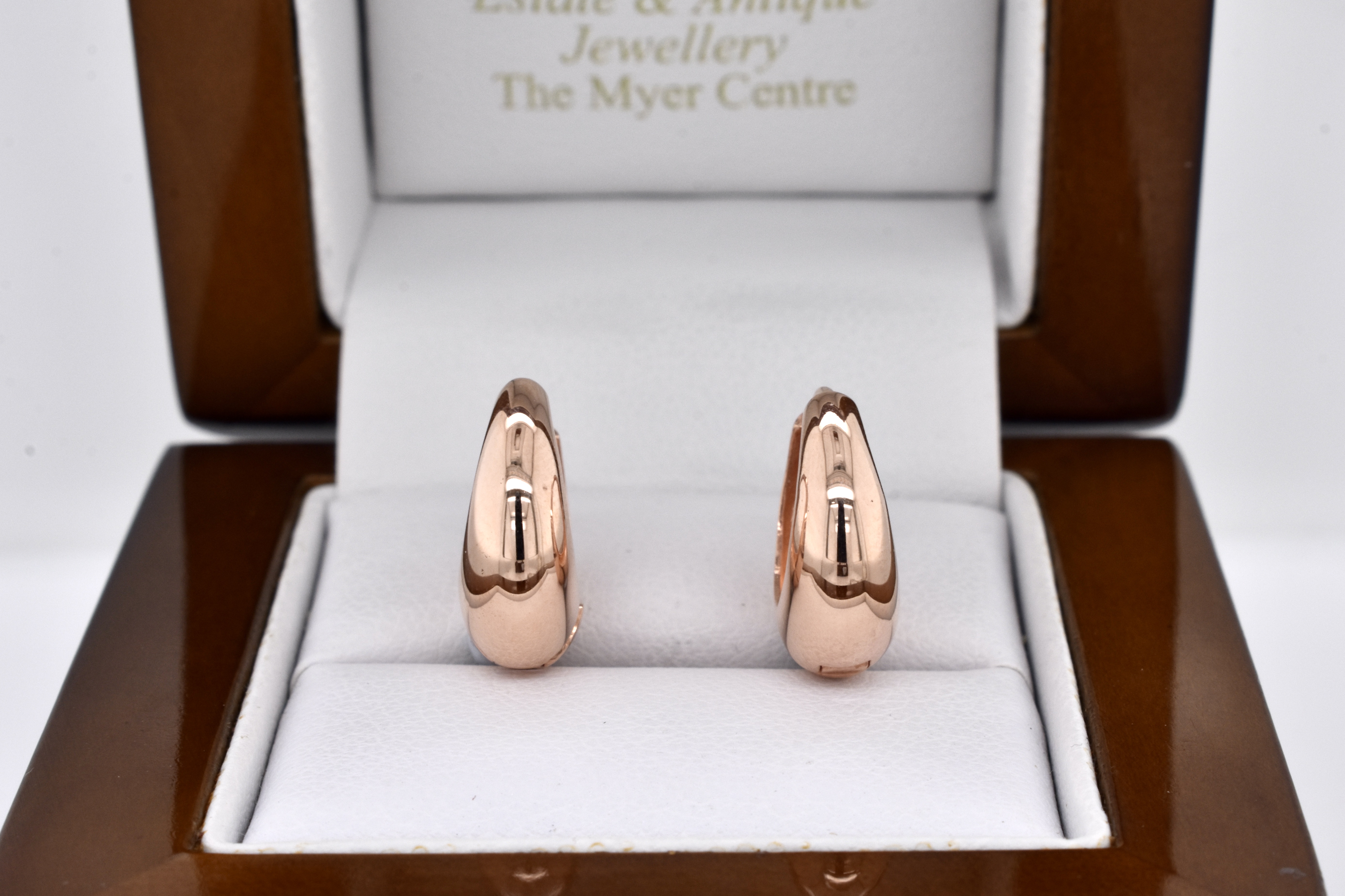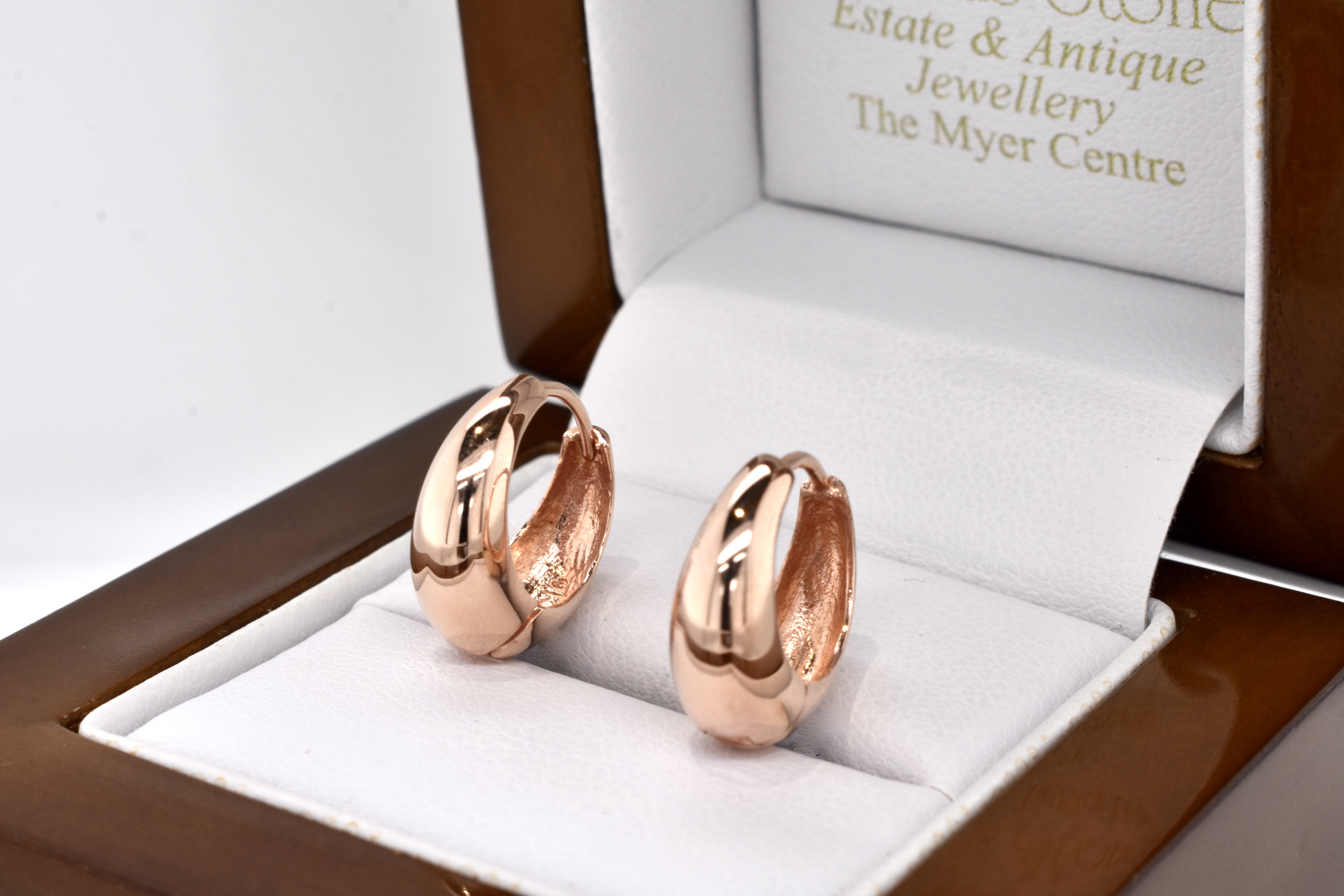 A sweet, everyday pair of huggies made from 9ct rose gold in a tapered, puffy round shape hinged at the bottom with clipped post fittings. Huggies measure approx. 15mm round and are 6mm wide