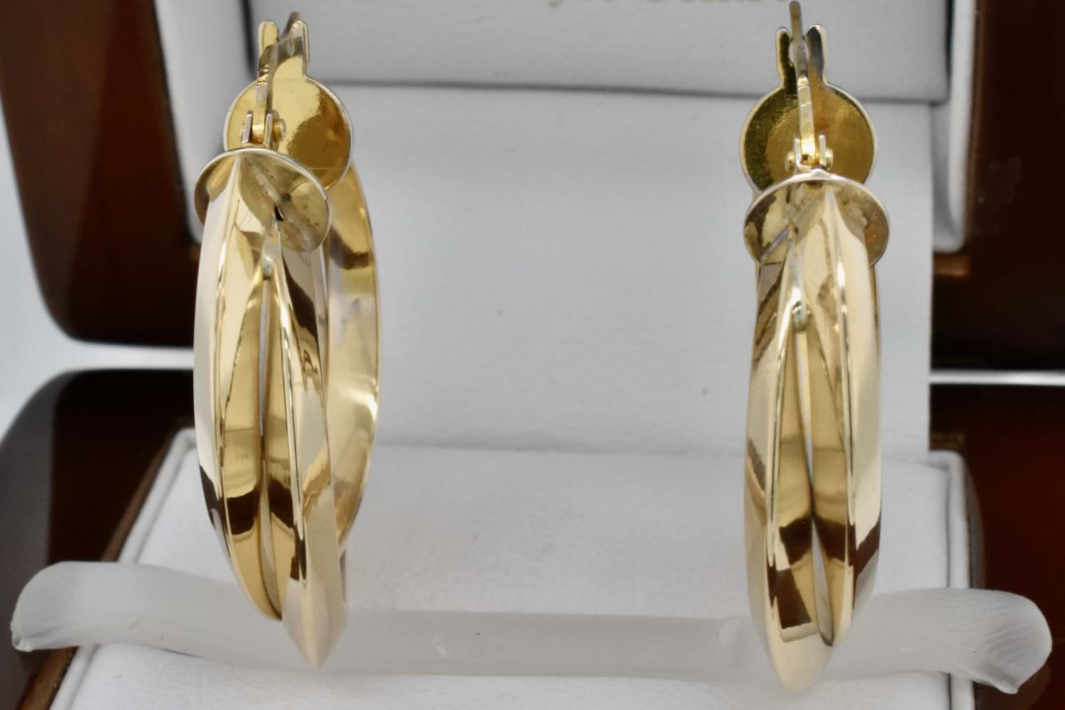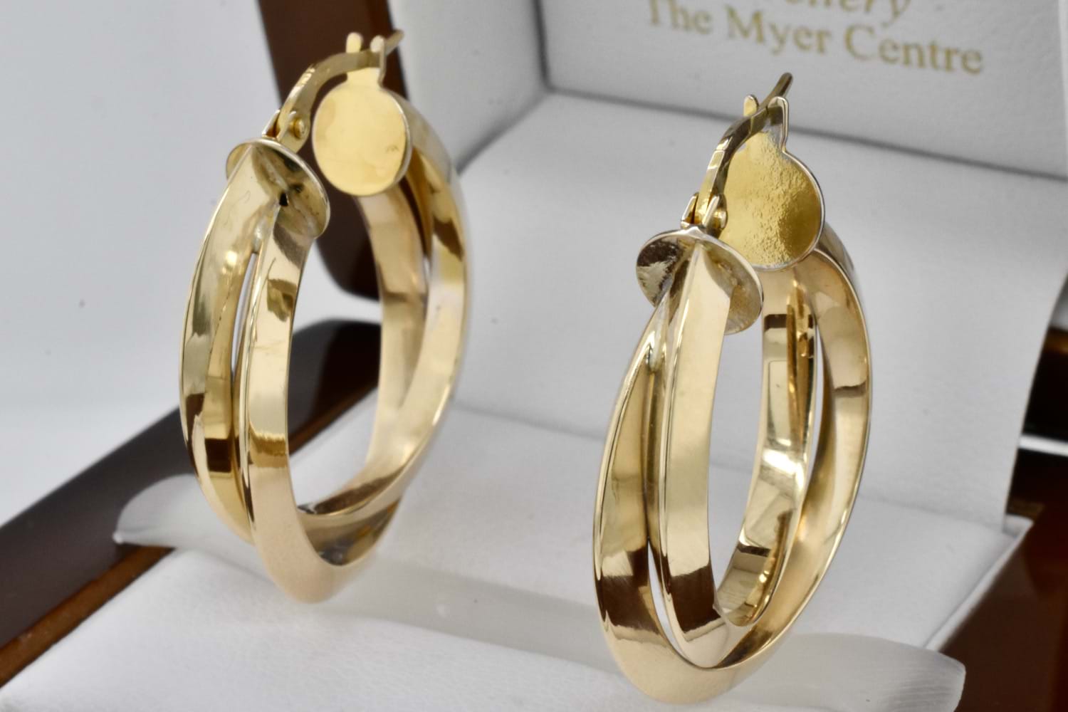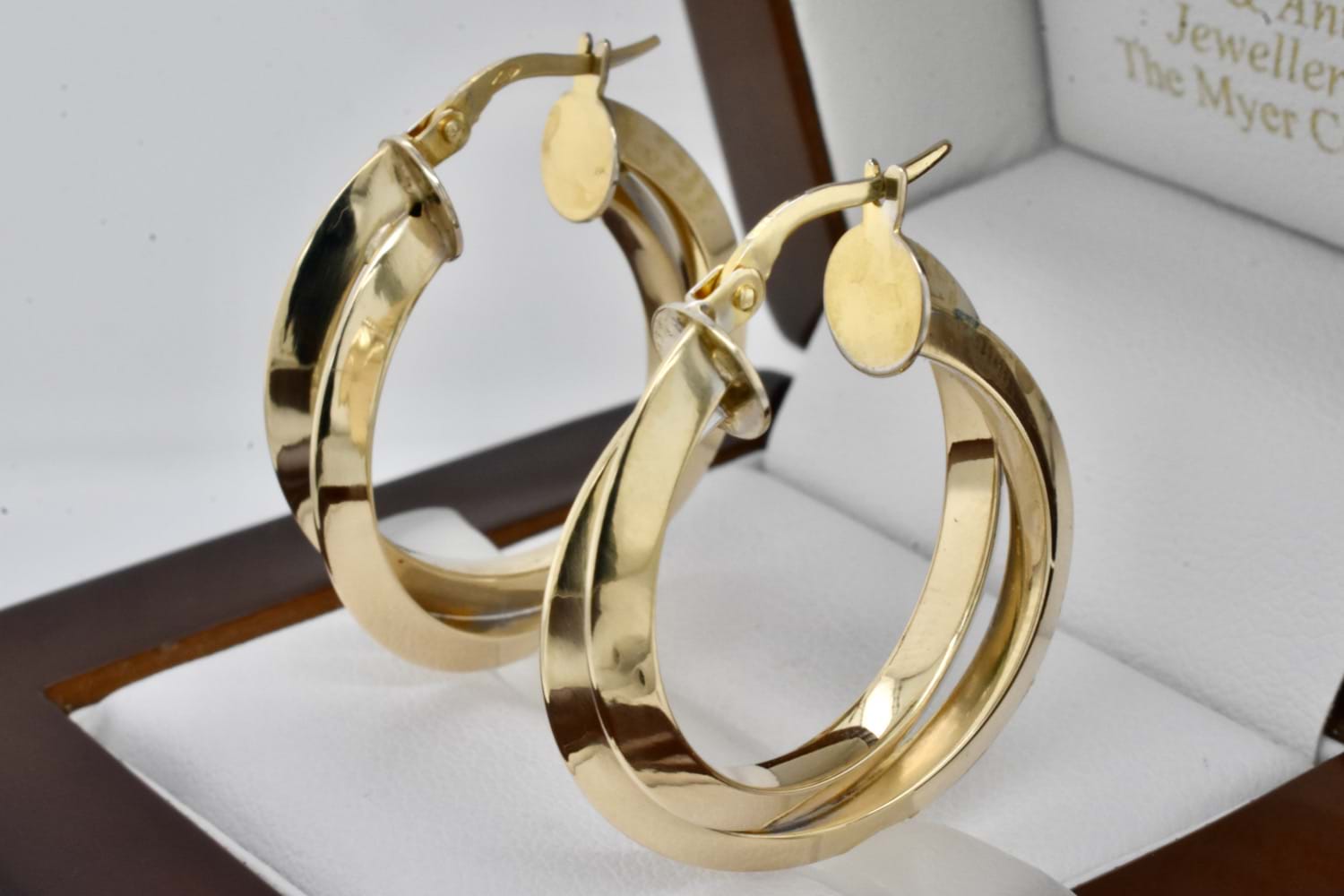 9ct yellow gold hoops measuring approx 25mm in diameter with two angular rows in a twist design