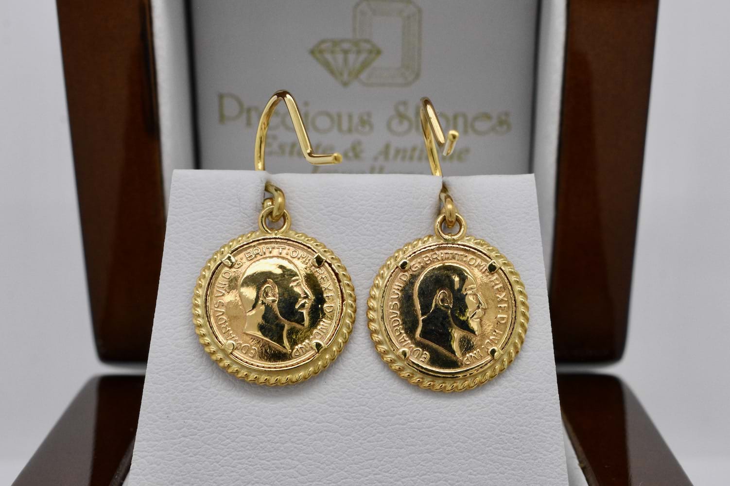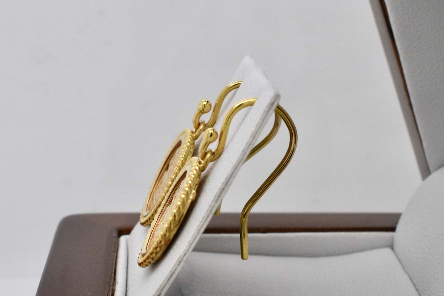 9ct yellow gold drop earrings featuring reproduction coins in a twisted frame setting suspended from shepherd hook fittings. Frame measures approx 14mm round
