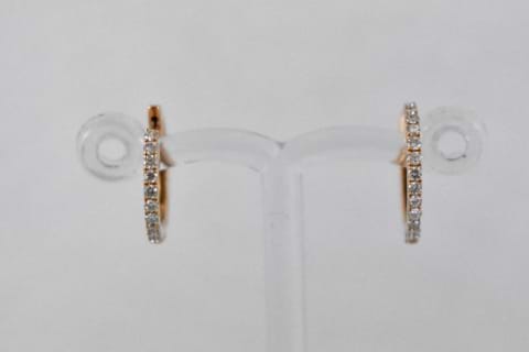 Crafted in 18ct Rose gold these simple but elegant huggie earrings are designed for everyday use. There is a total diamond content of 26 stones = .28ct with a grade of G colour, SI clarity. Independent Valuation Supplied