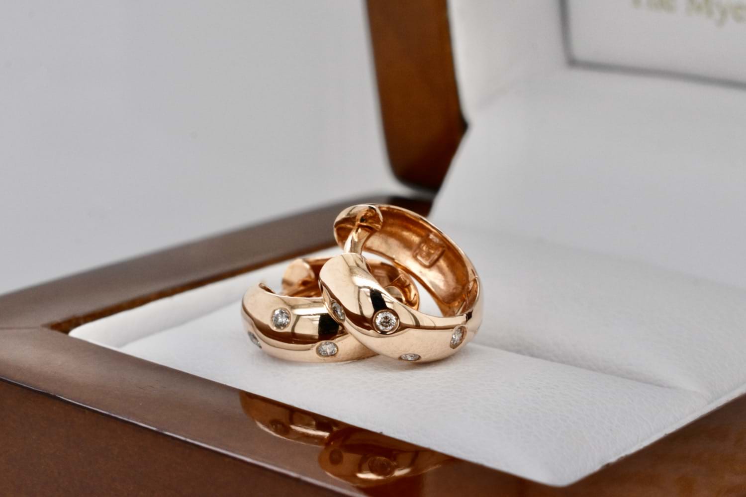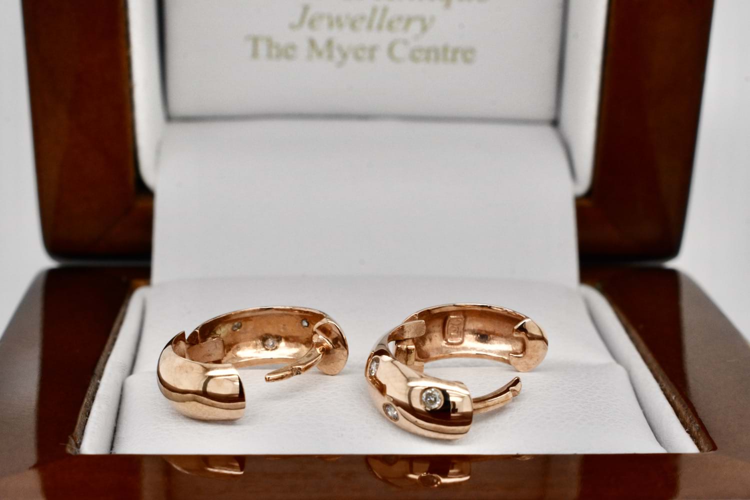 A classic and versatile pair of dainty, round 9ct rose gold domed huggies with scattered pressure set, sparkly white RBC diamonds. The huggies measure approx. 4.6mm wide and have a polished finish, which along with the diamonds gives them a lustrous overall look