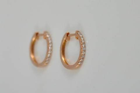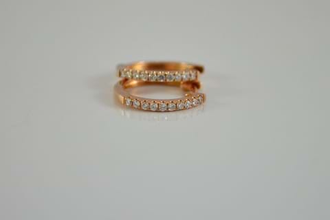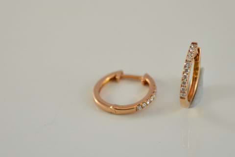 18ct Rose Gold Diamond Huggies, each set with 10 white, round brilliant cut, sparkling diamonds totalling 0.14ct. Perfect for the girl who LOVES her Rose Gold.
