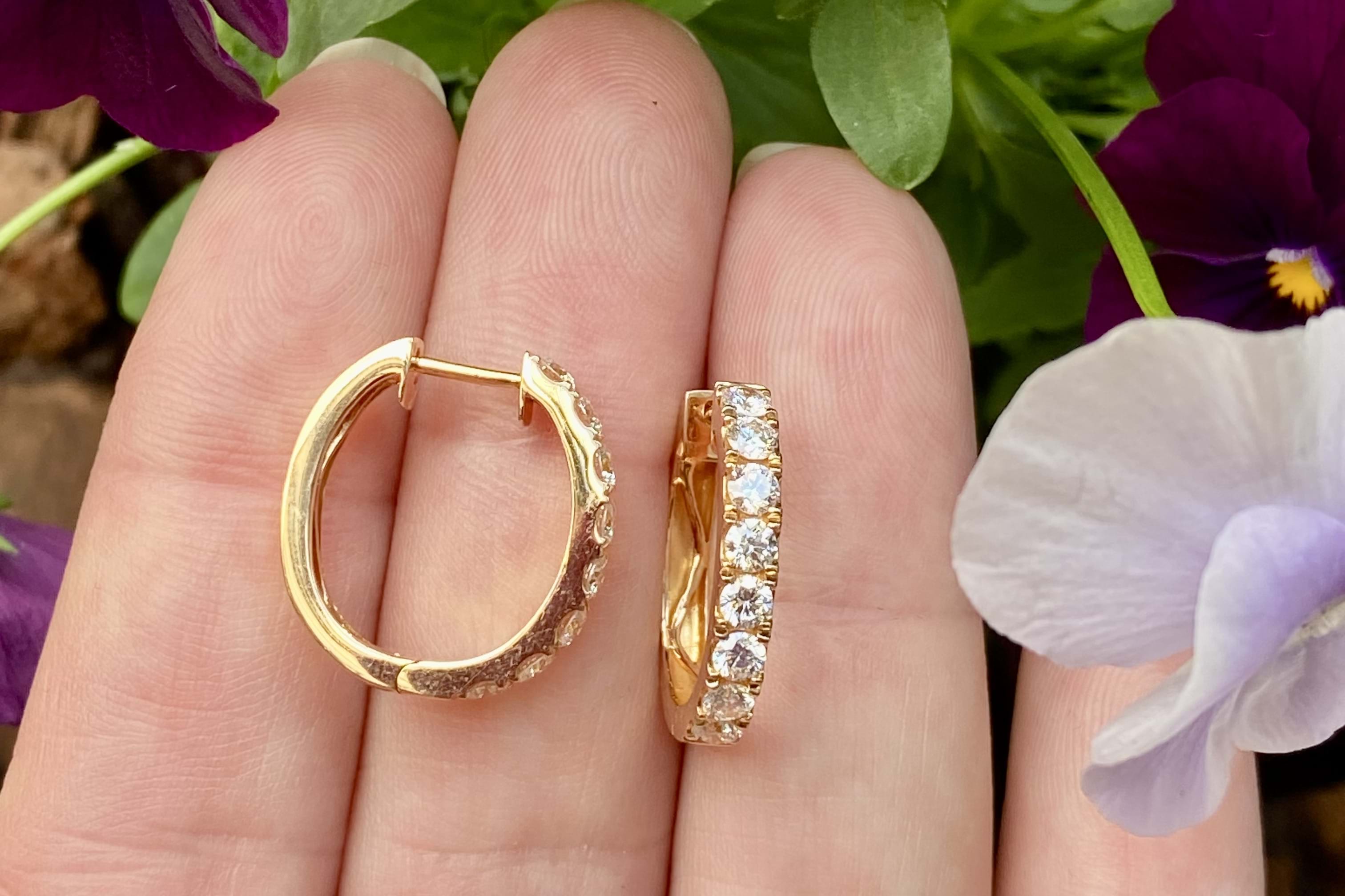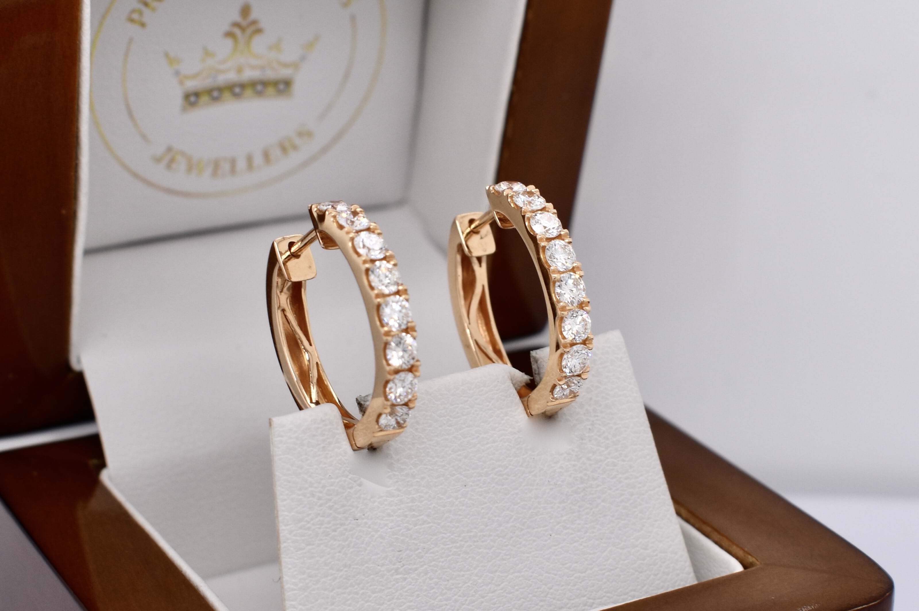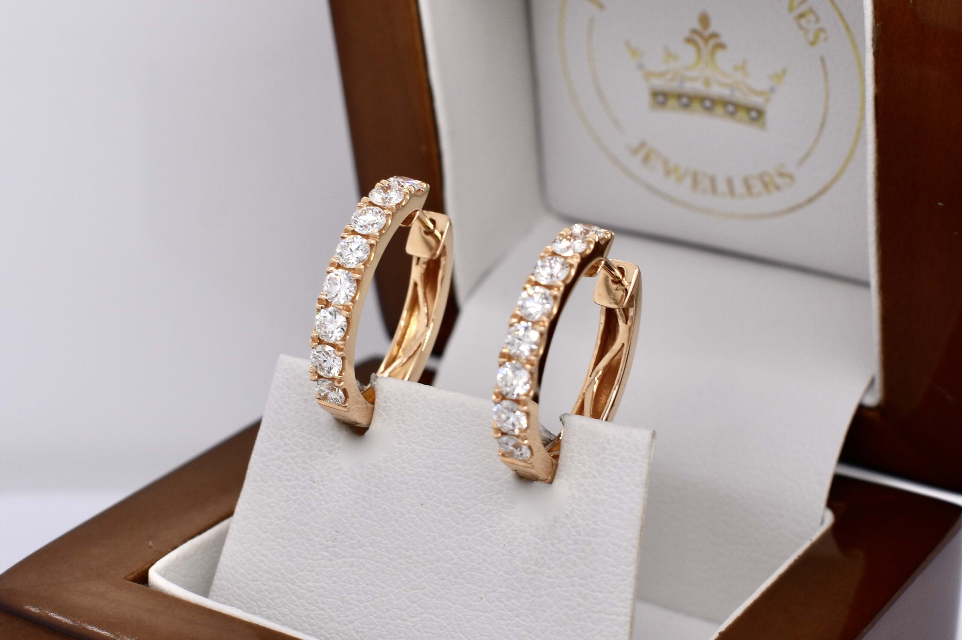 A pair of 18ct rose gold oval u-shaped huggies, each cut down claw set with 8 round brilliant cut diamonds and a combined total diamond content of 16 diamonds at 1.18cts FG VS-SI. Finished with a clipped post fittings. Independent Valuation Supplied