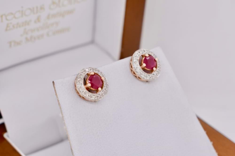 Beautiful 4mm round red rubies, four claw set in rose gold, surrounded by a white gold diamond halo with 9ct rose gold post and butterfly fittings. Matching pendant available for separate purchase.