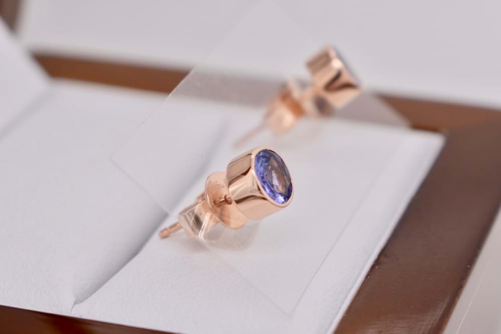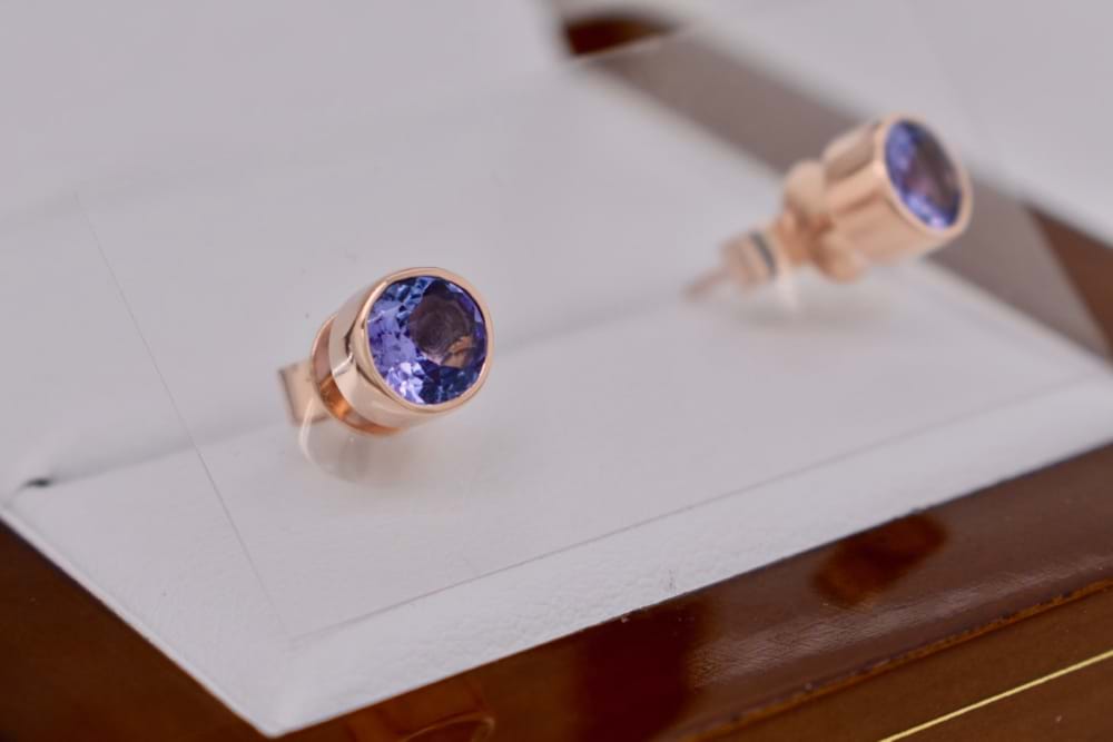 Handmade in 9ct rose golds these lovely 5.8mm round faceted tanzanites are bezel set with stud post and butterfly fittings
