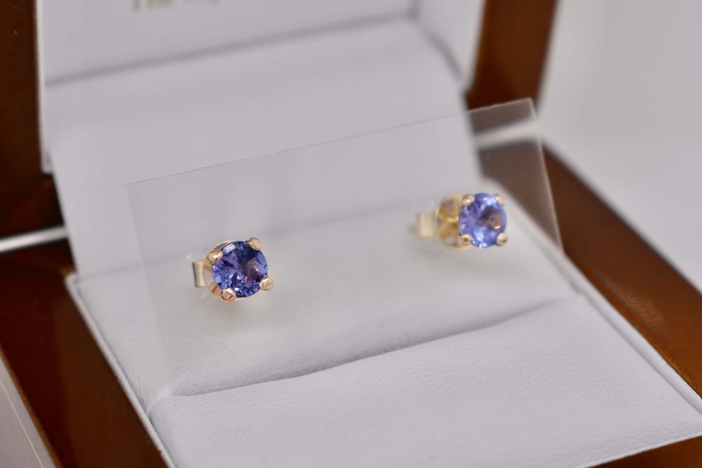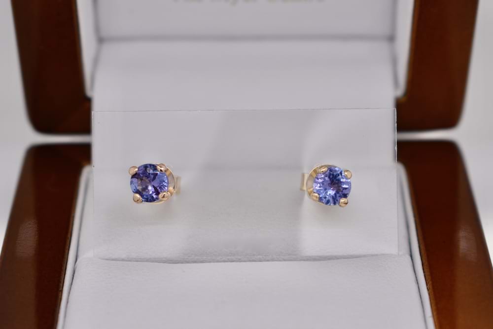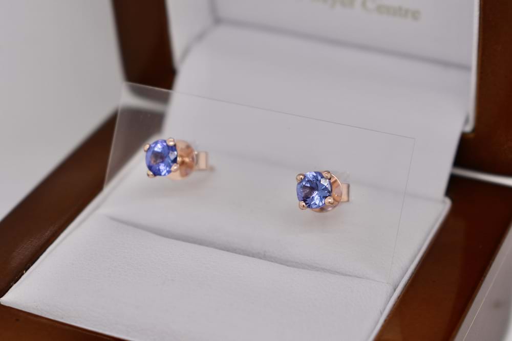 A gorgeous pair of handmade 9ct rose gold four claw studs featuring a pair of faceted round tanzanites measuring 4.5mm