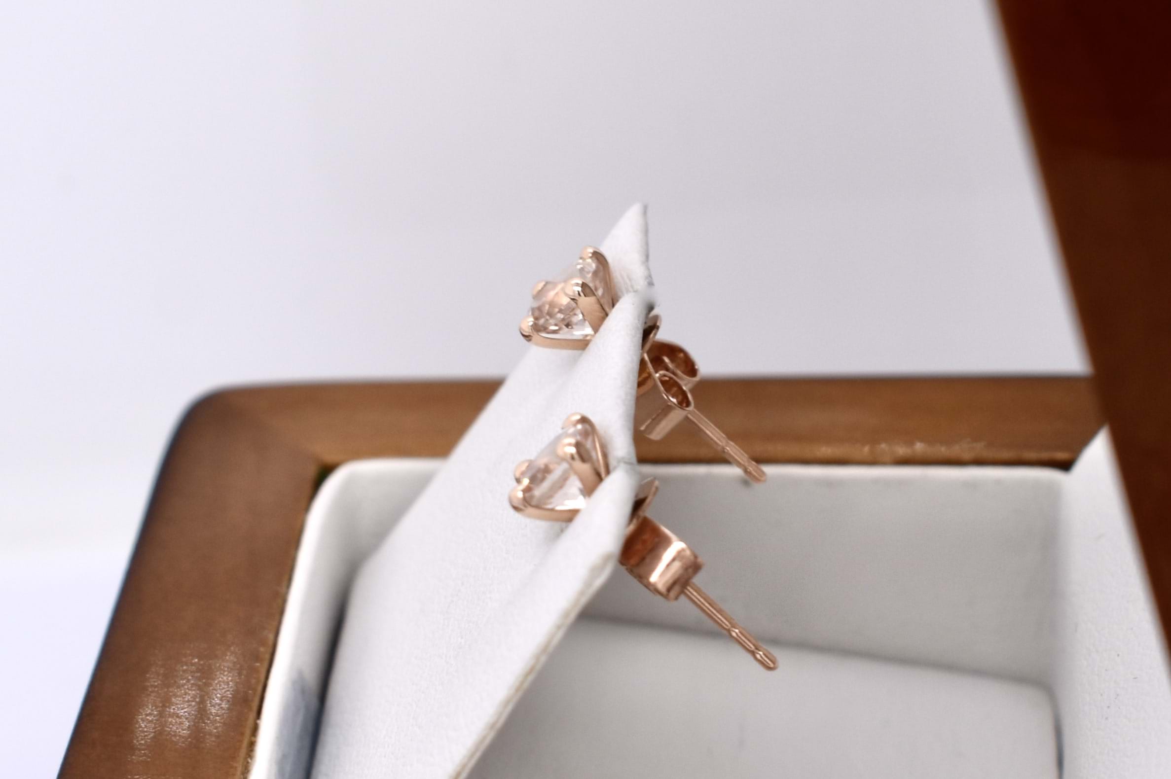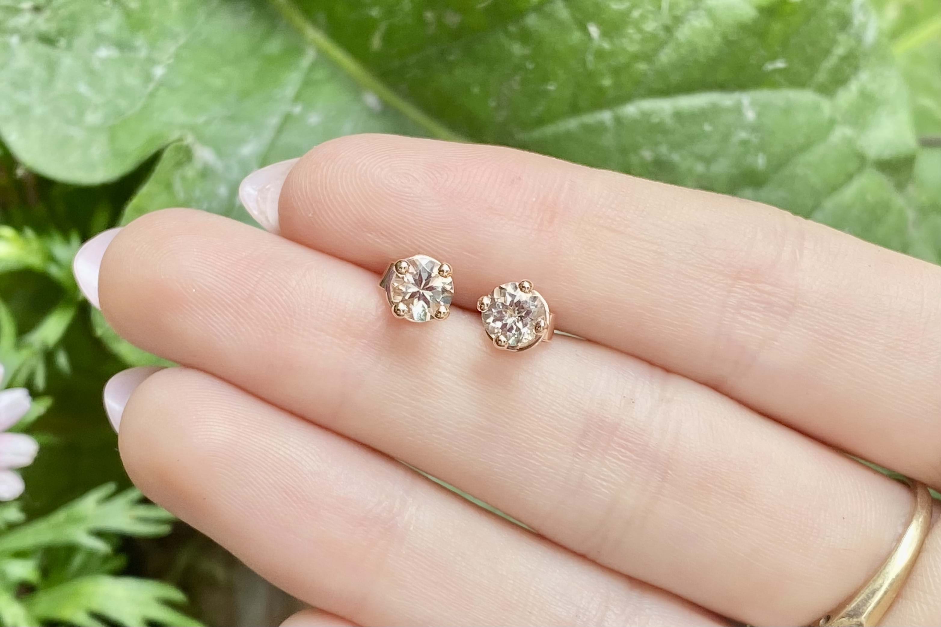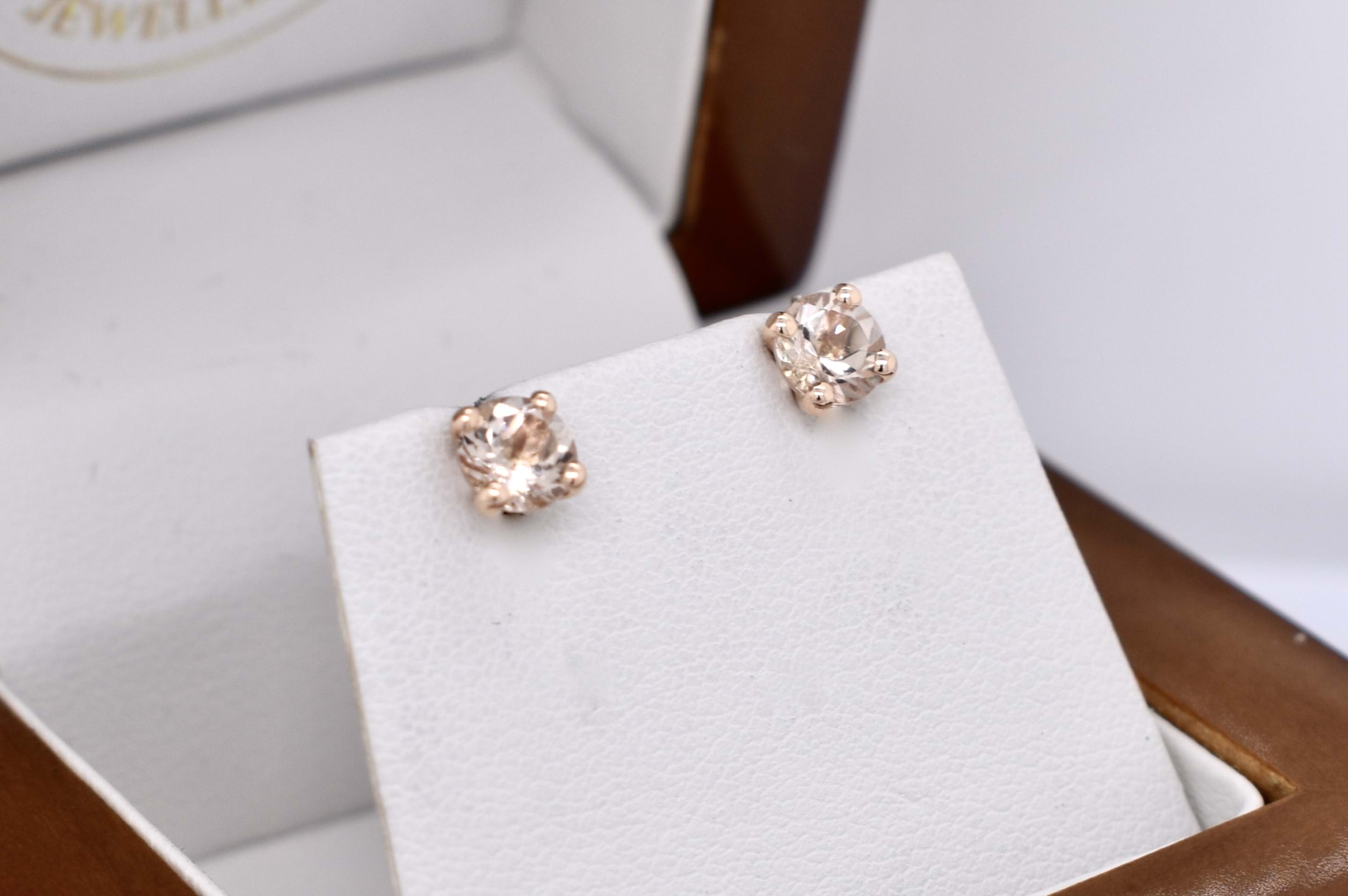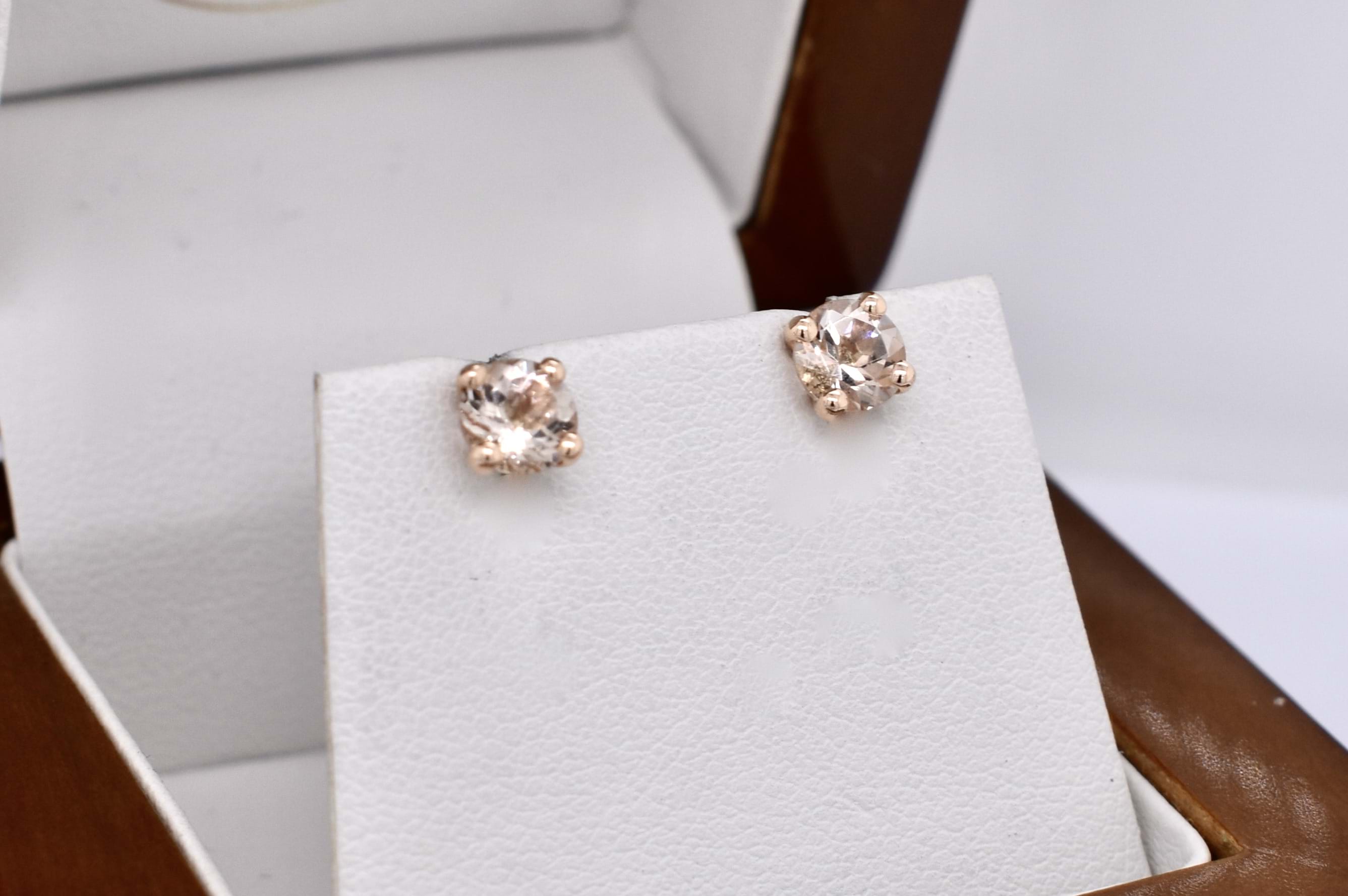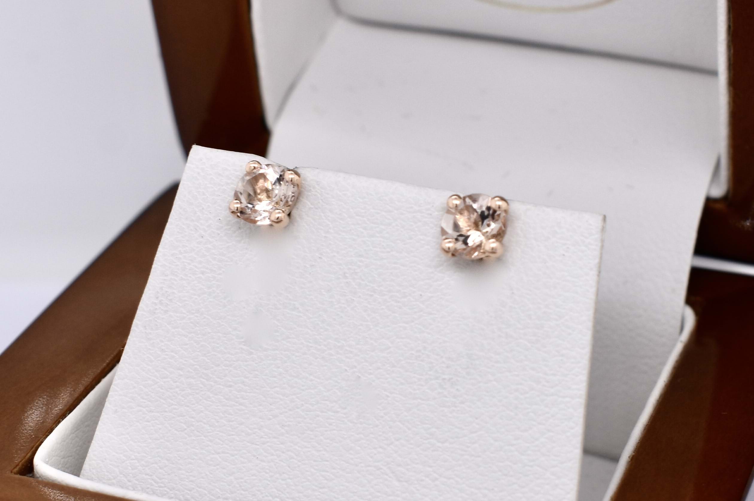 The sweetest pair of round shaped studs featuring 5mm round rose quartz, four claw set in 9ct rose gold, with post and butterfly fittings.