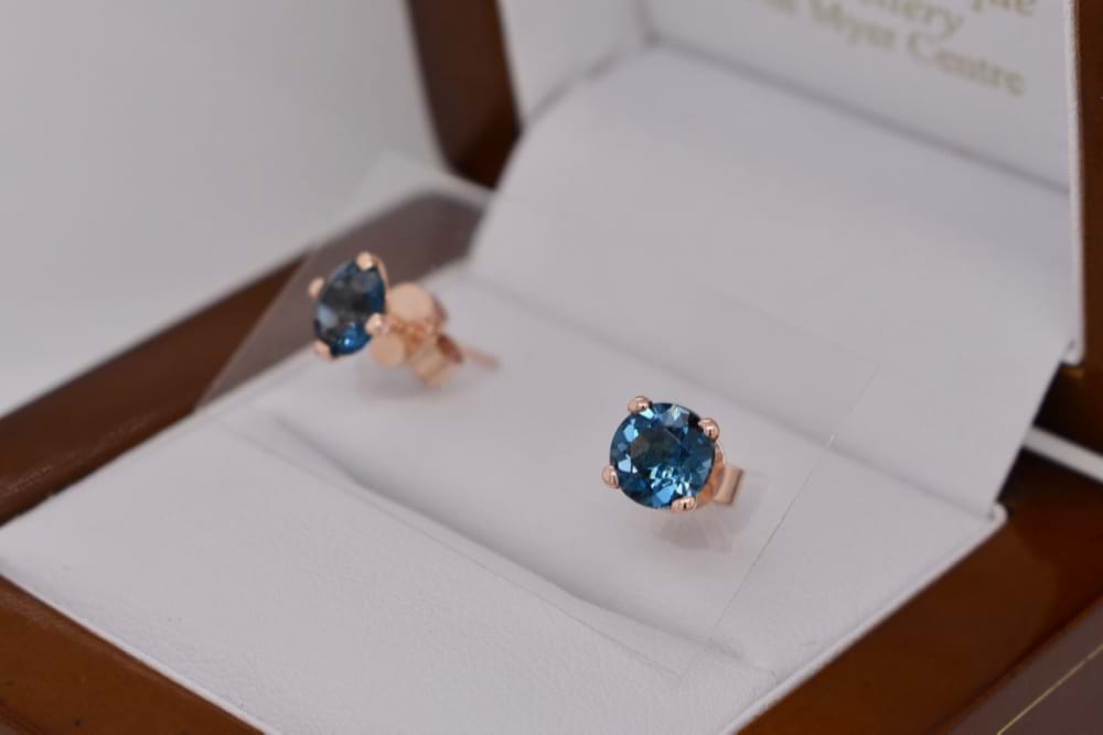 9ct rose gold handmade earrings featuring a pair of pretty round, faceted, London blue topaz in four claw settings with post and butterfly fittings. Stones measures 6mm