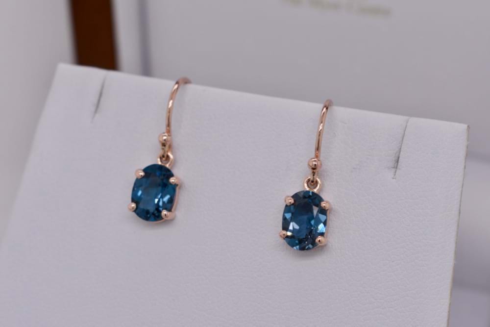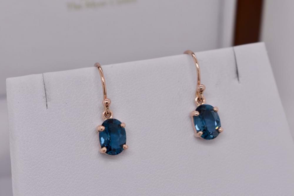 9ct rose gold handmade earrings featuring a pair of pretty oval, faceted, London blue topaz in four claw settings suspended from shepherd hooks. Stones measures 8x6mm