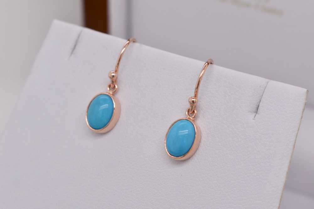 9ct rose gold handmade earrings featuring a pair of stunning cabochon oval turquoise from Arizona in bezel settings suspended from shepherd hooks. Stones measures 7.8x6mm