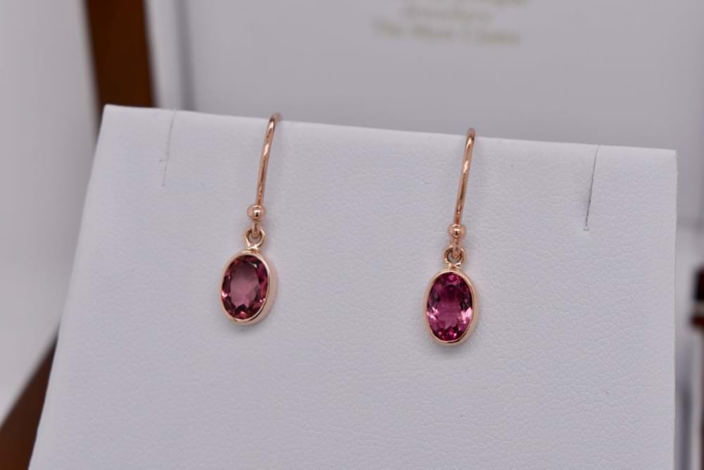 9ct rose gold handmade earrings featuring a pair of pretty oval, faceted, pink tourmalines in bezel settings suspended from shepherd hooks. Stones measures 7x5mm