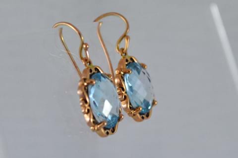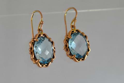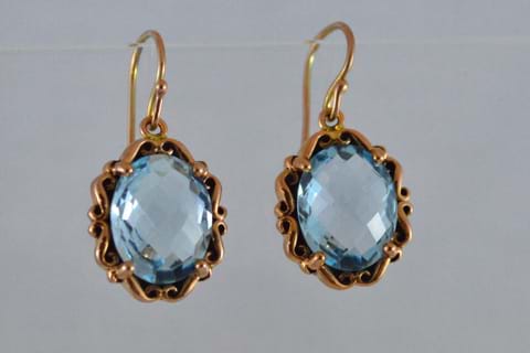 Stunning faceted oval blue topaz gems each surrounded by a scalloped border in 9ct rose gold and suspended from shepherd hook fittings. These earrings have a antique feel, whilst still being simple and understated.