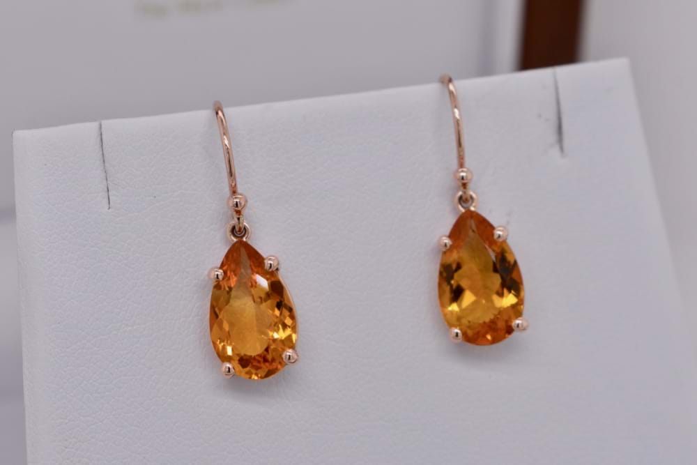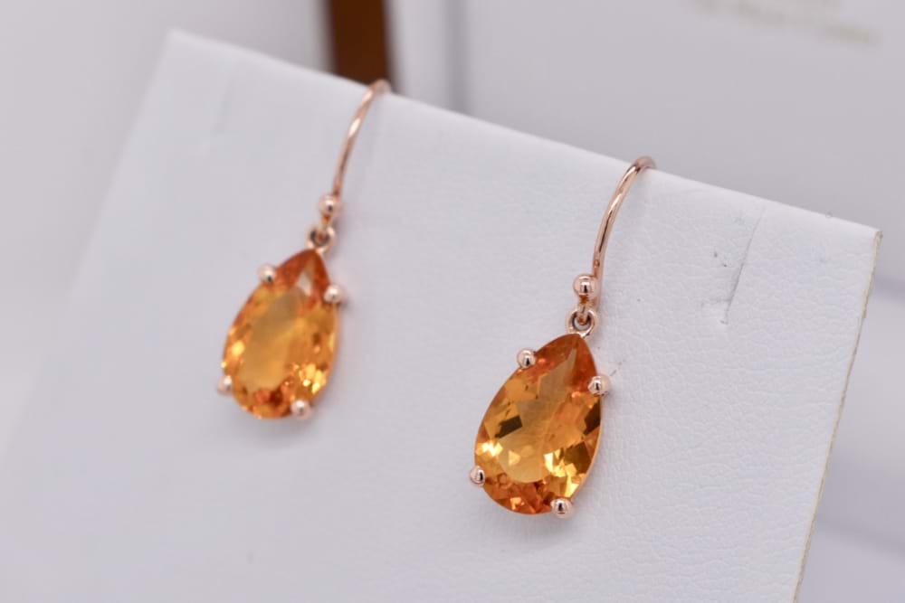 9ct yellow gold handmade earrings featuring a pair of stunning pearshape, faceted, citrines in four claw settings suspended from shepherd hooks. Stones measures 13x8mm