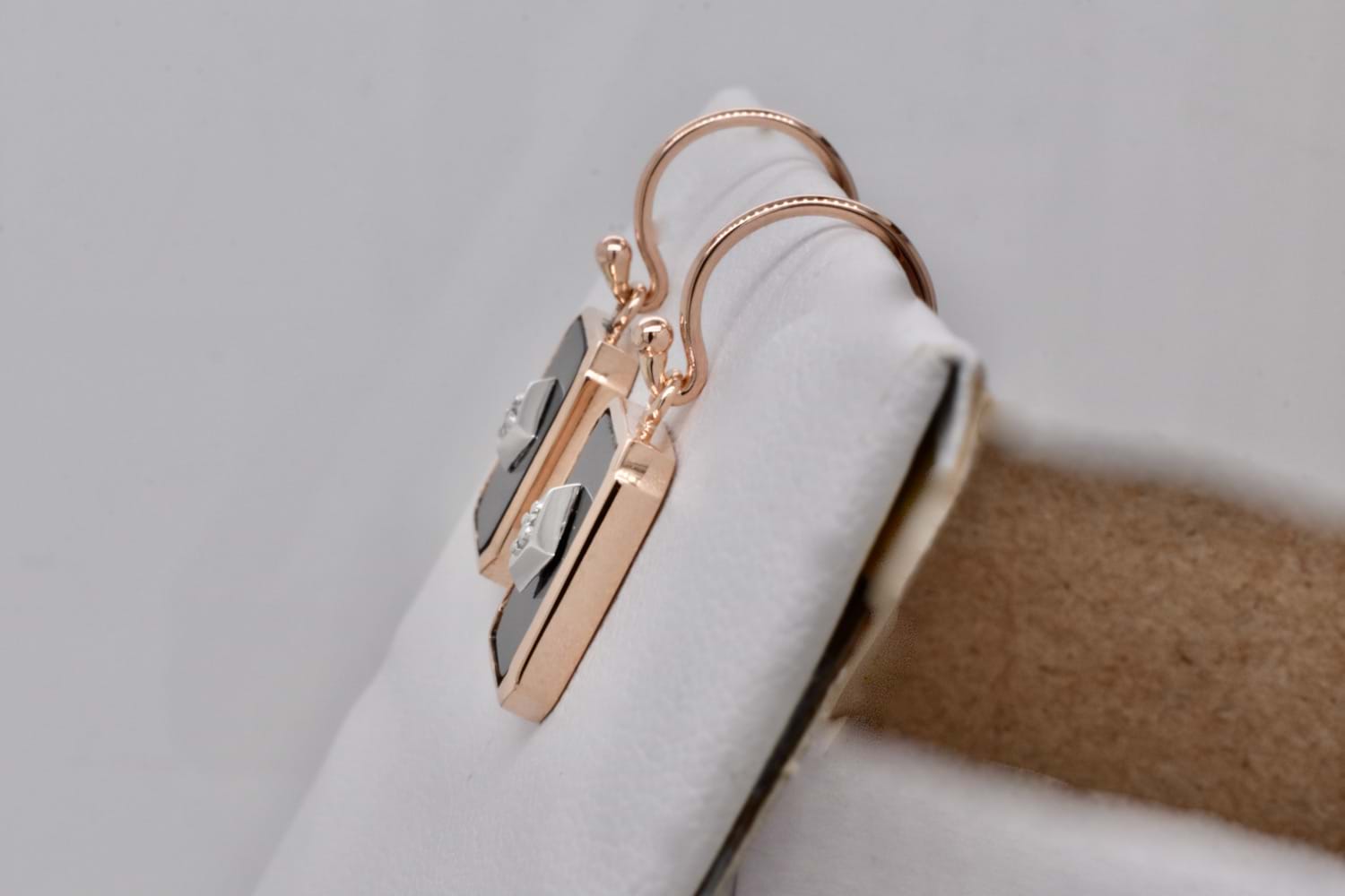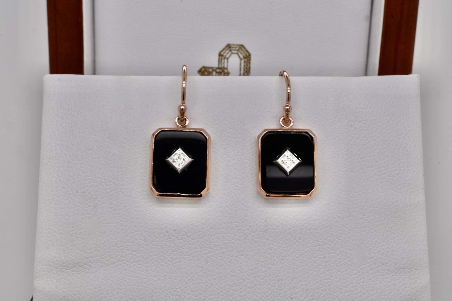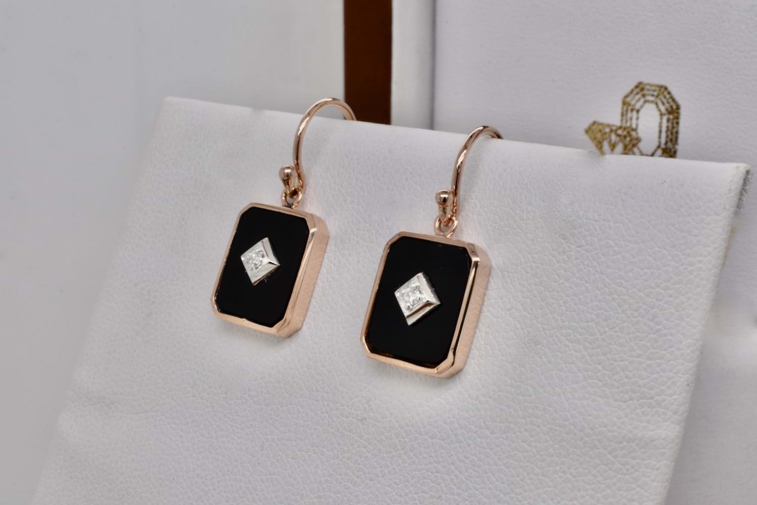 A striking geometric pair of drop earrings crafted in 9ct rose gold, set with emerald cut onyx measuring approximately 13 x 11mm. In the centre of each earring is a glimmering white diamond set into diamond shaped white gold and suspended from shepherd hooks