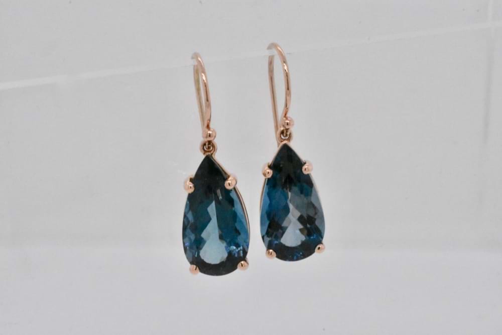 A fabulous pair of matching London blue topaz faceted into 17x10mm teardrops and set into handmade 9ct rose gold settings