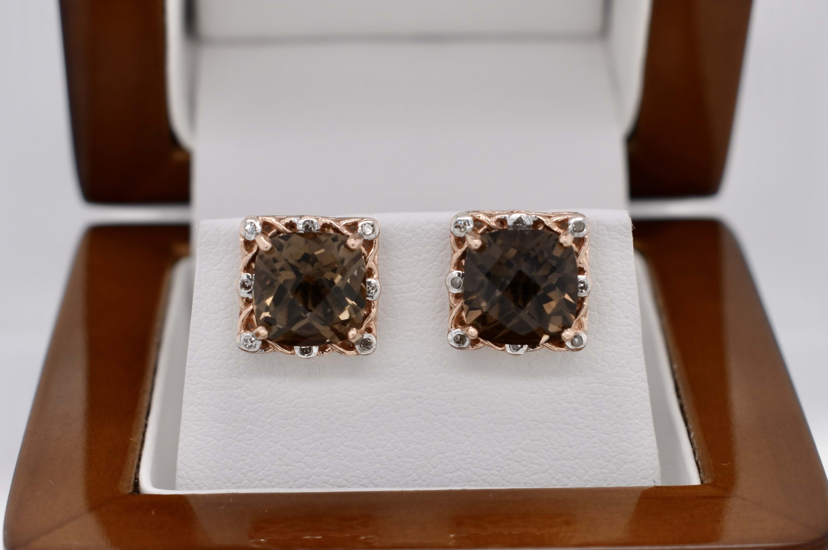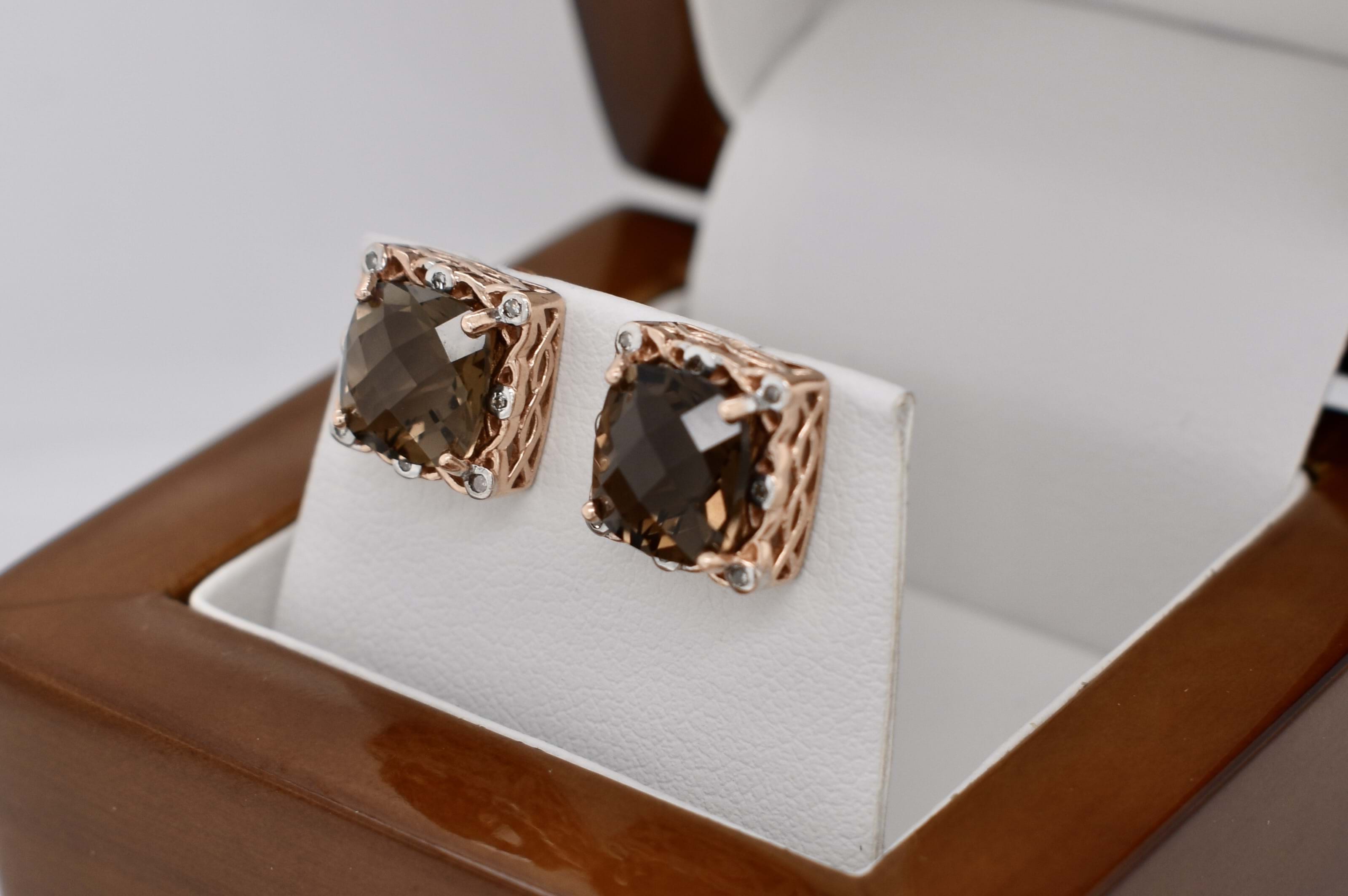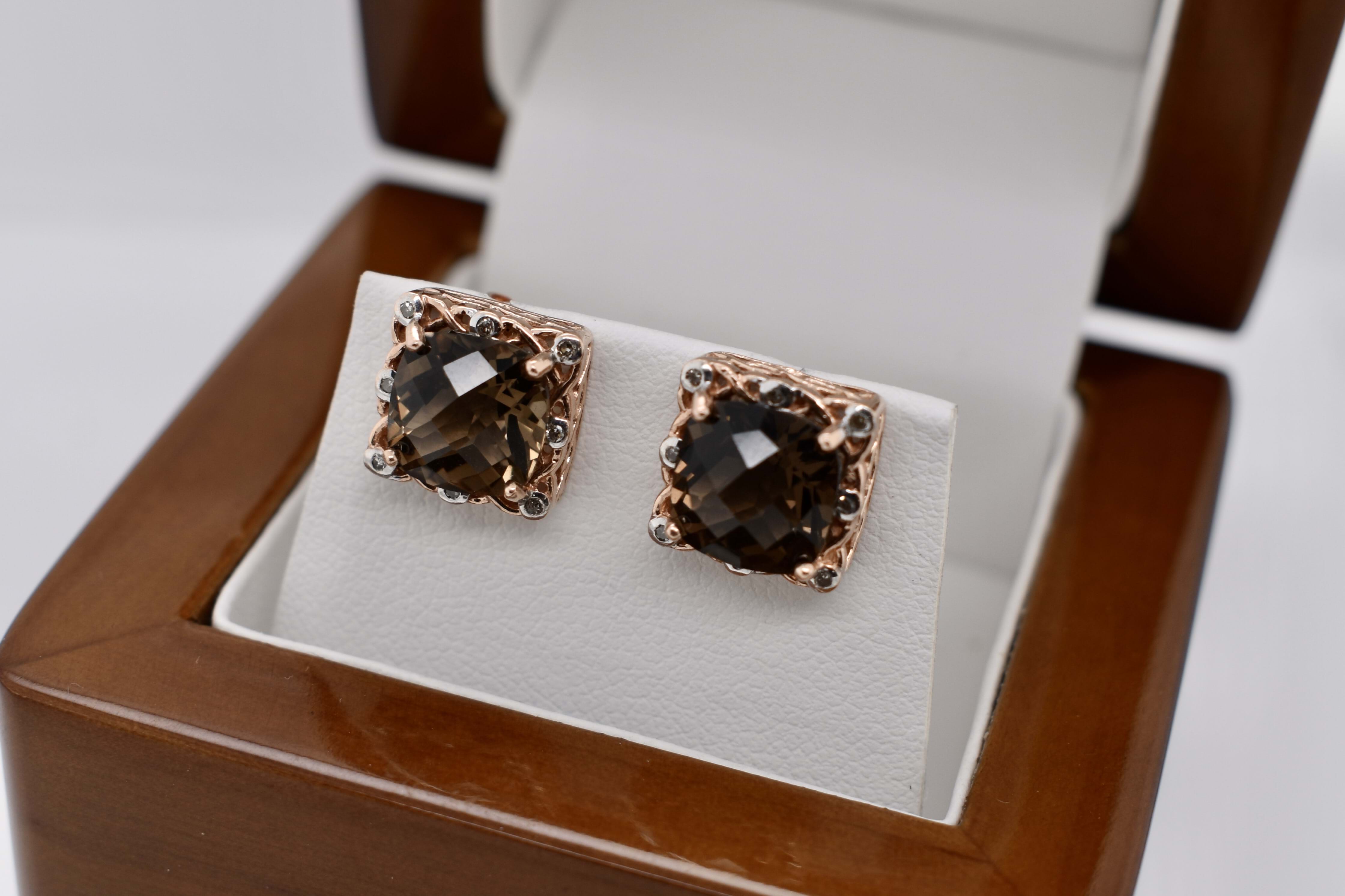 Lovely cushion shaped 8.6mm smokey quartz studs, with checkerboard faceting, set in 9ct rose gold. Detailed with a filigree border and gallery, with small bezel set diamonds evenly spaced in a square along the borders. Completed with post and butterfly fittings.