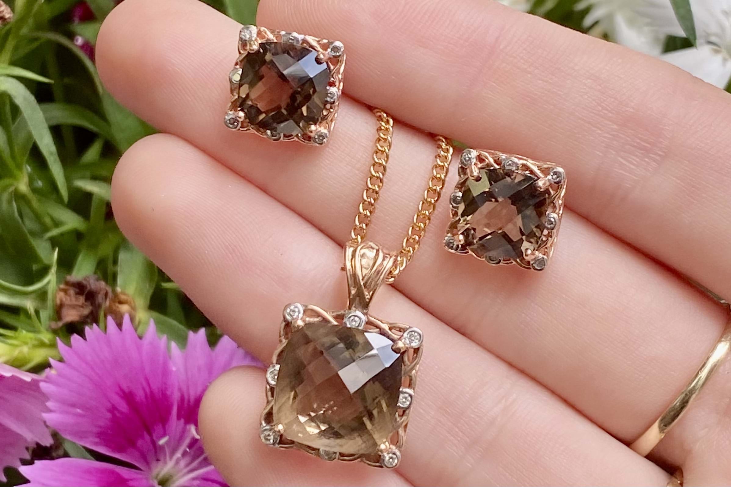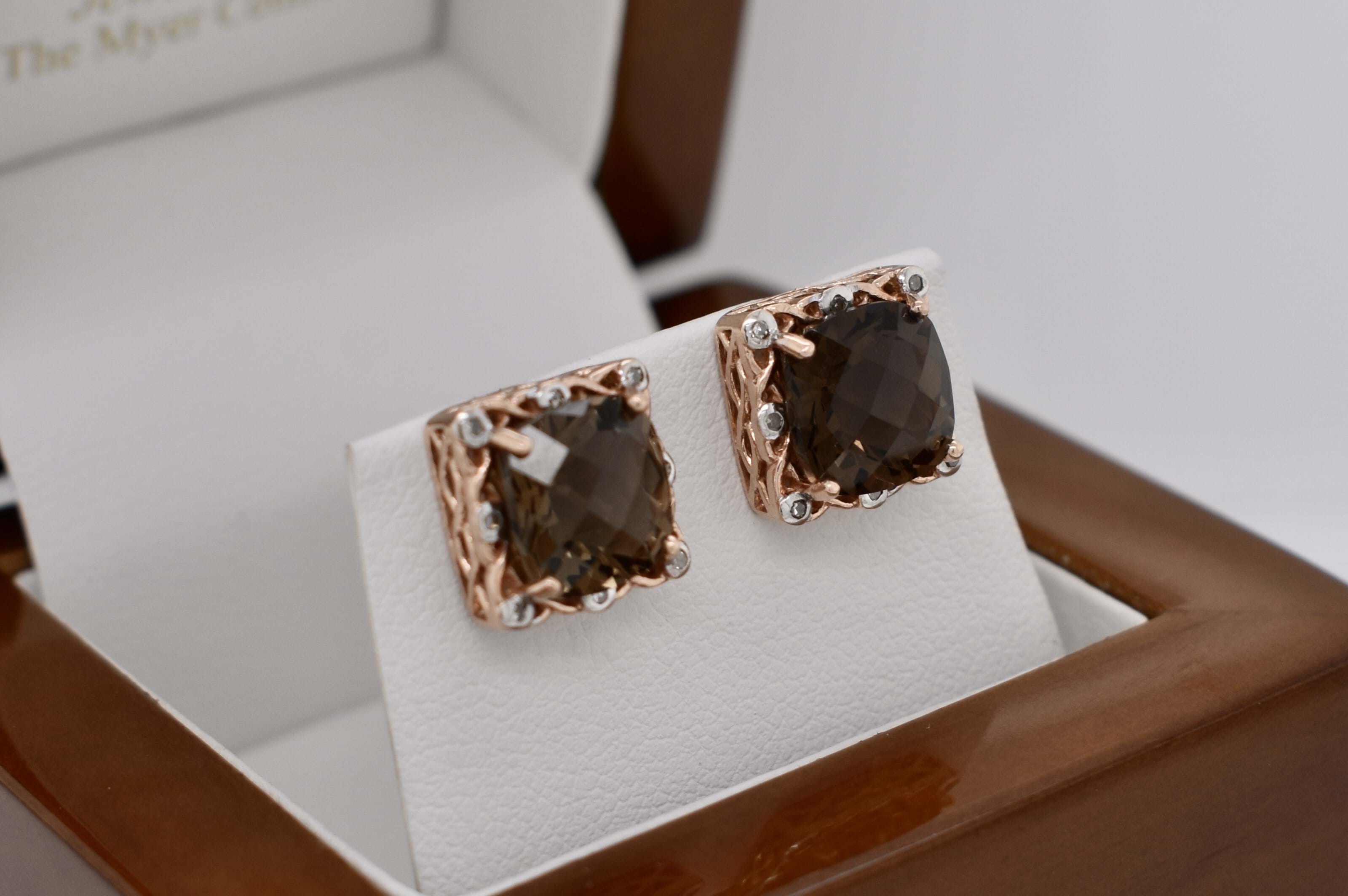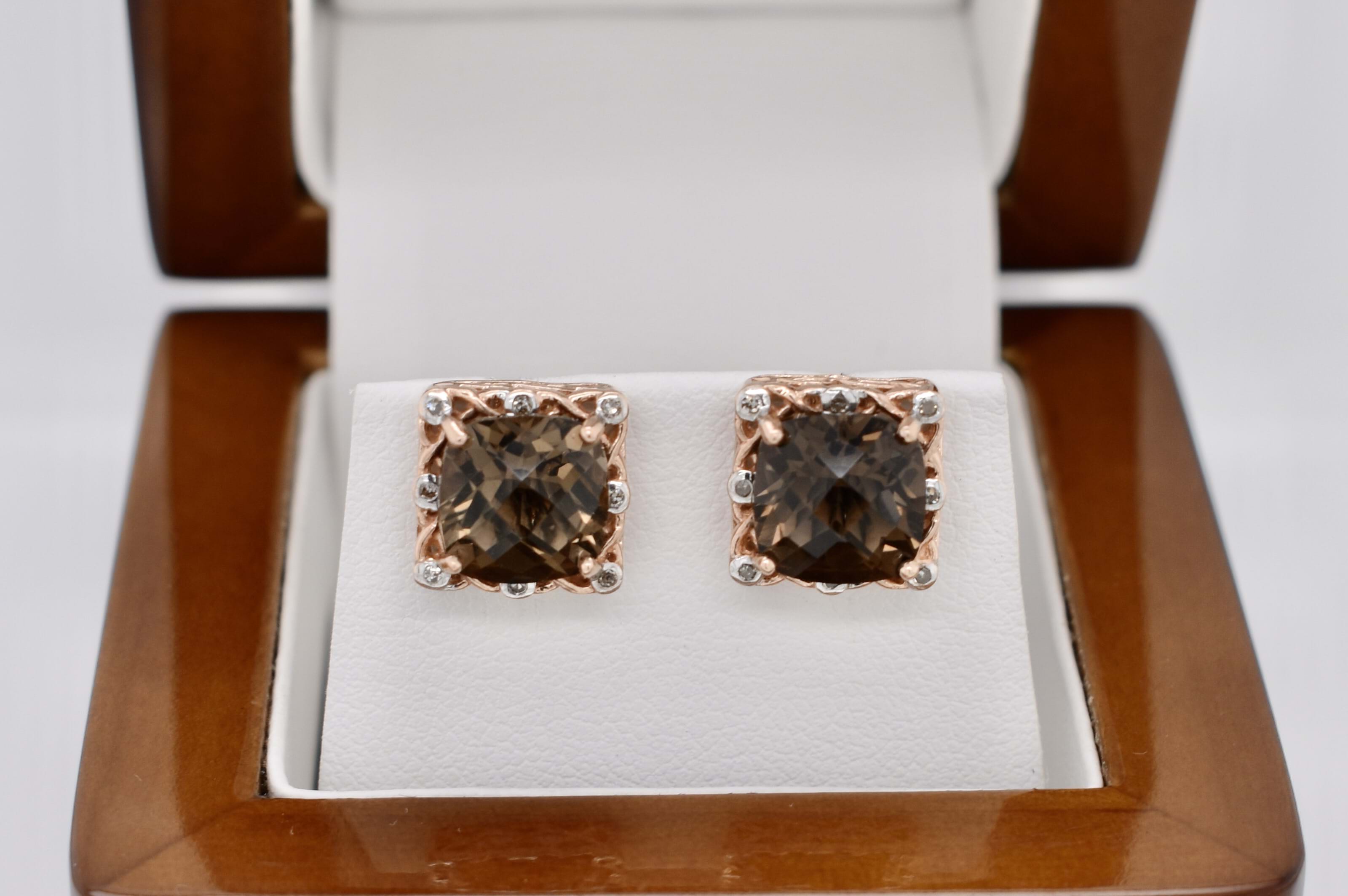 Lovely cushion shaped 8.6mm smokey quartz studs, with checkerboard faceting, set in 9ct rose gold. Detailed with a filigree border and gallery, with small bezel set diamonds evenly spaced in a square along the borders. Completed with post and butterfly fittings.
