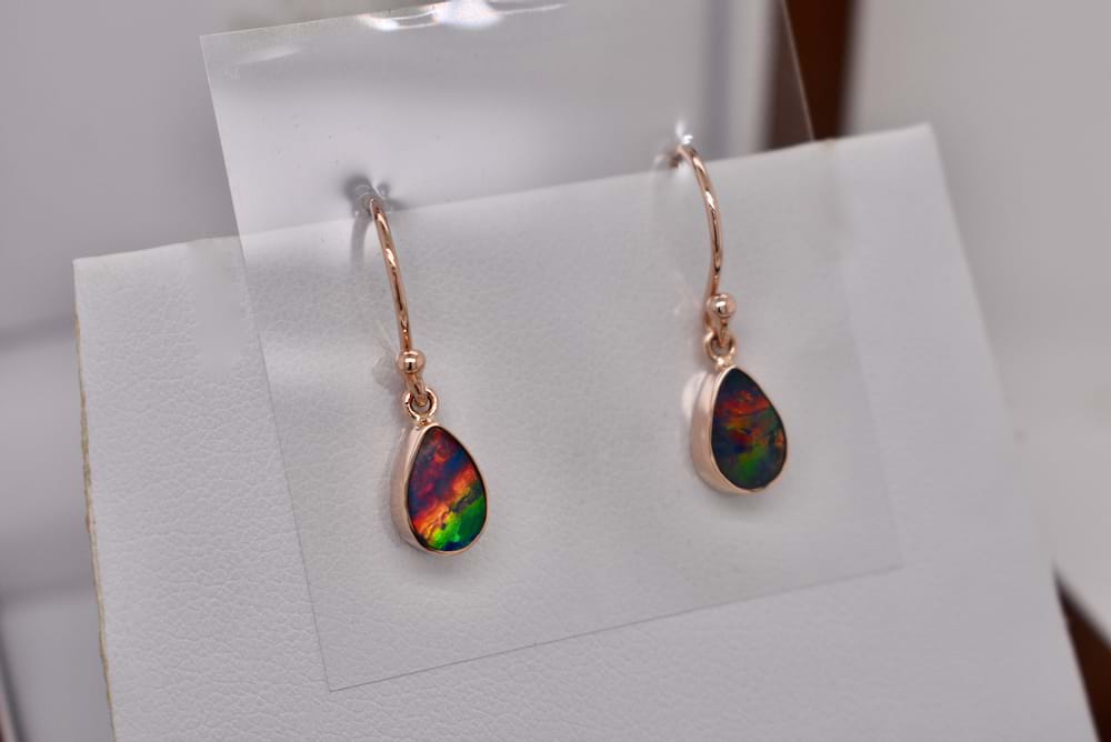 Handmade in 9ct rose gold these bezel set doublet opal drops earrings contain a boulder opal base and a Coober Pedy opal top with a dark body and red/orange/yellow/green & blue flashes. Doublets measure 8.7 x 5.9mm