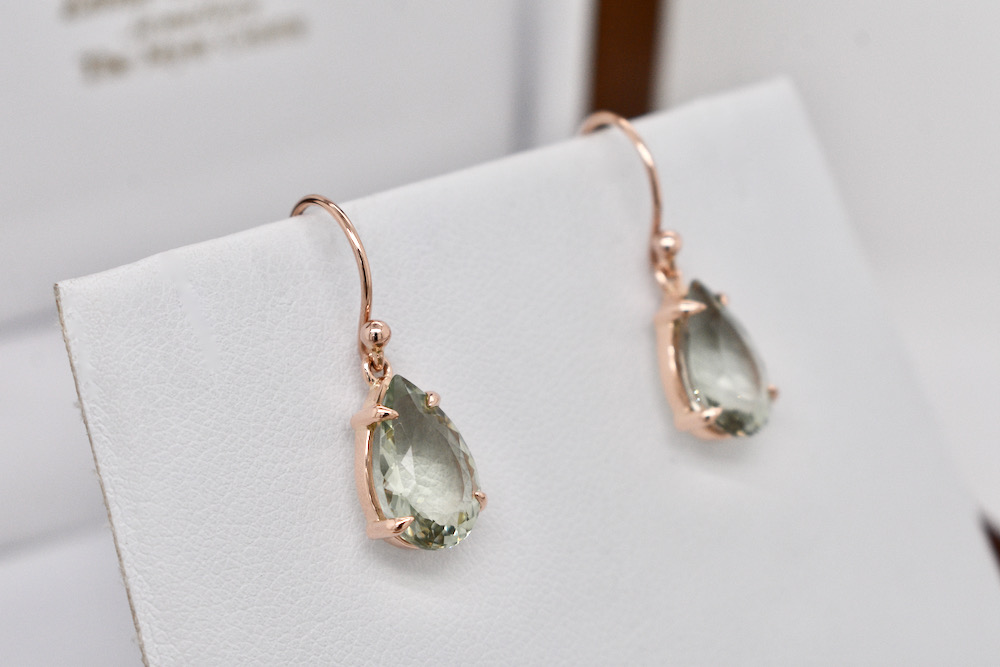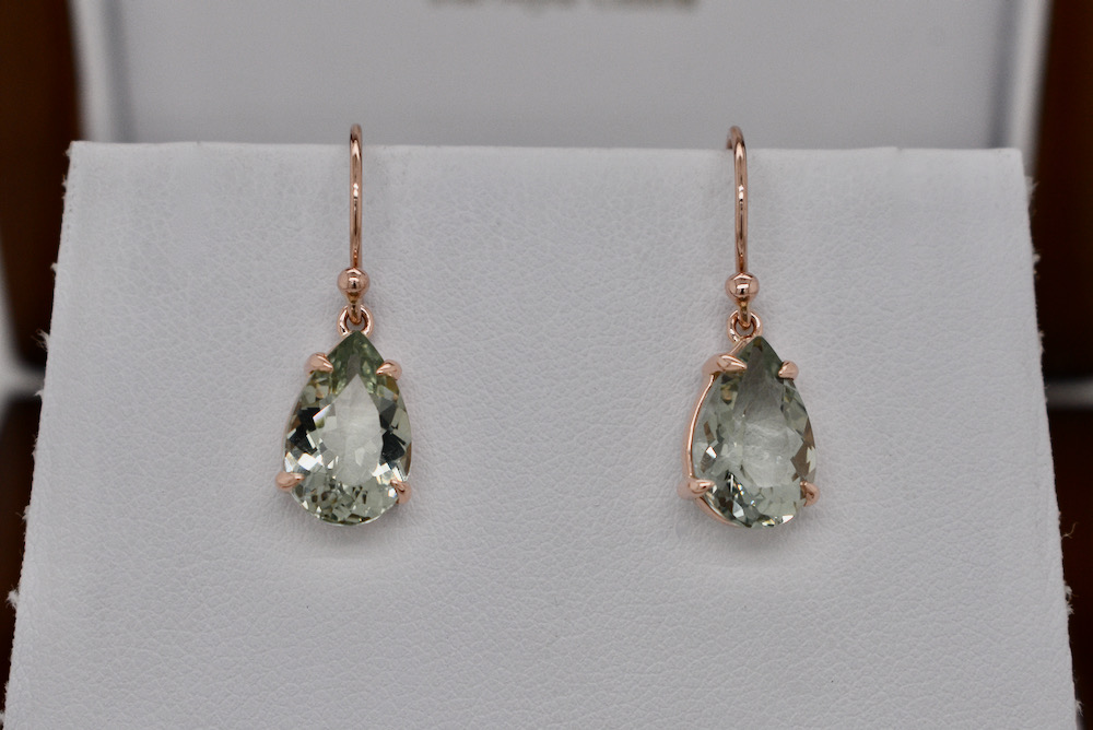 Stunning pearshape Prasiolite measuring 12x8mm four claw set into handmade 9ct rose gold settings and suspended from shepherd hook fittings