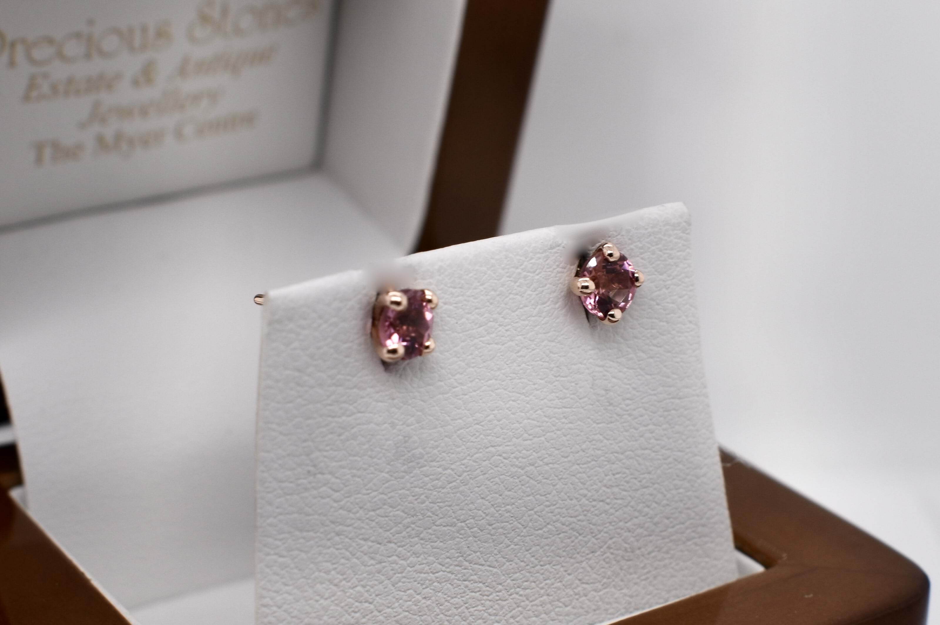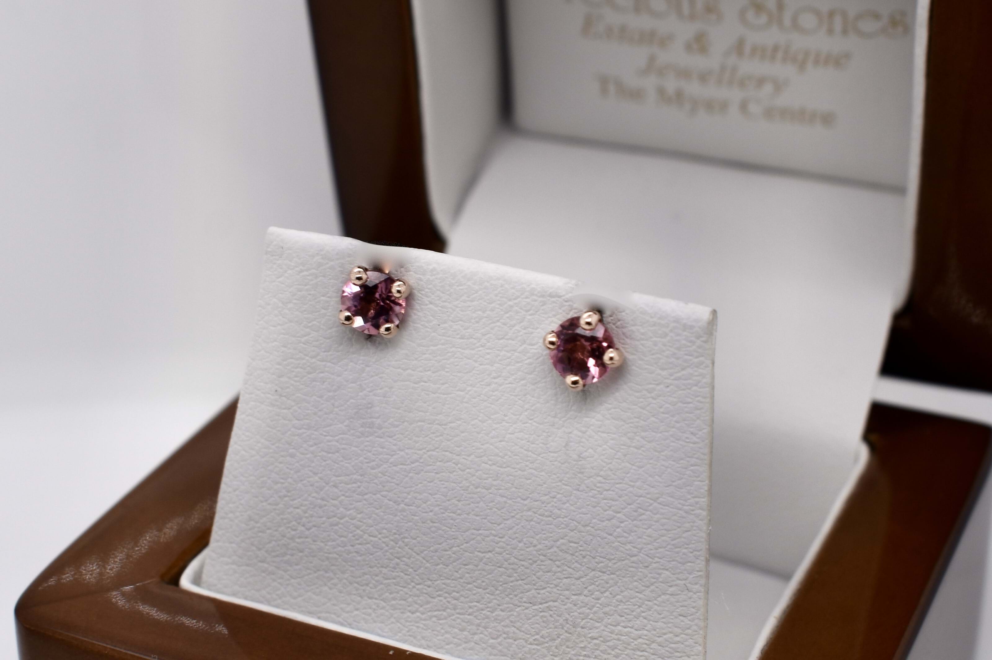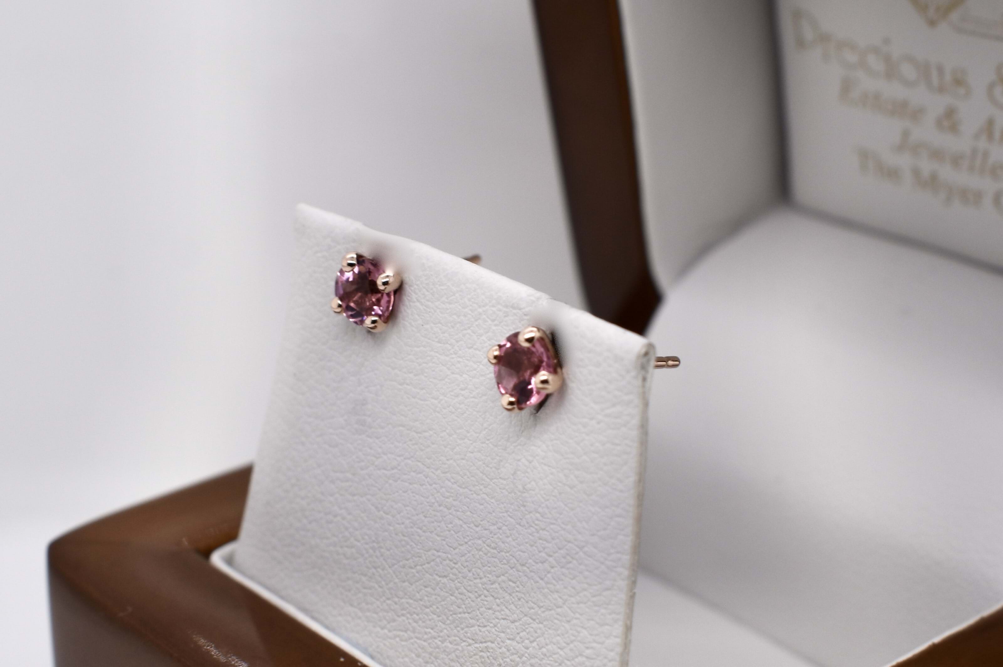 Crafted in 9ct yellow gold, two round pink tourmaline stones, four claw set with simple post and butterfly settings. Measuring 4.5x4.5mm.