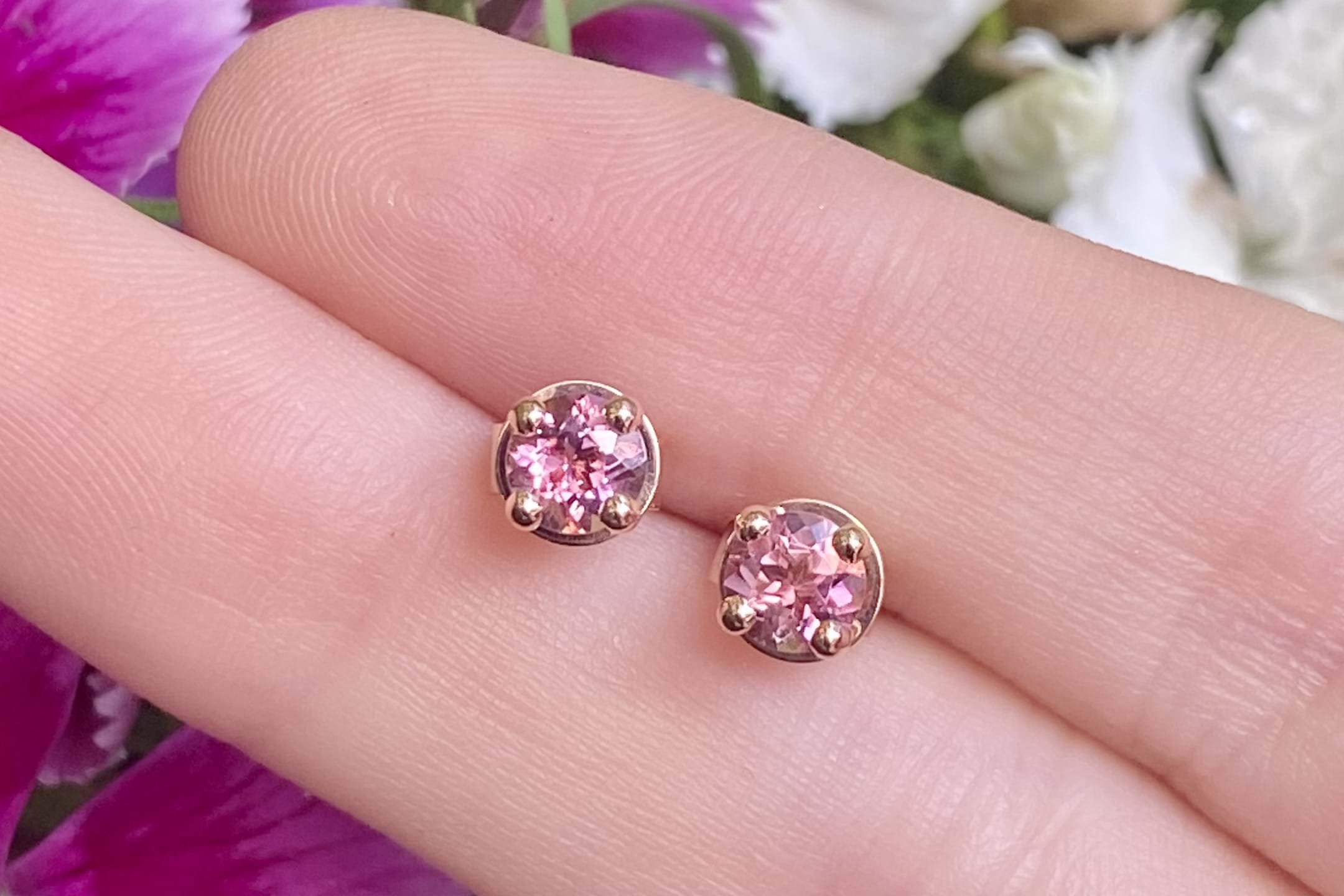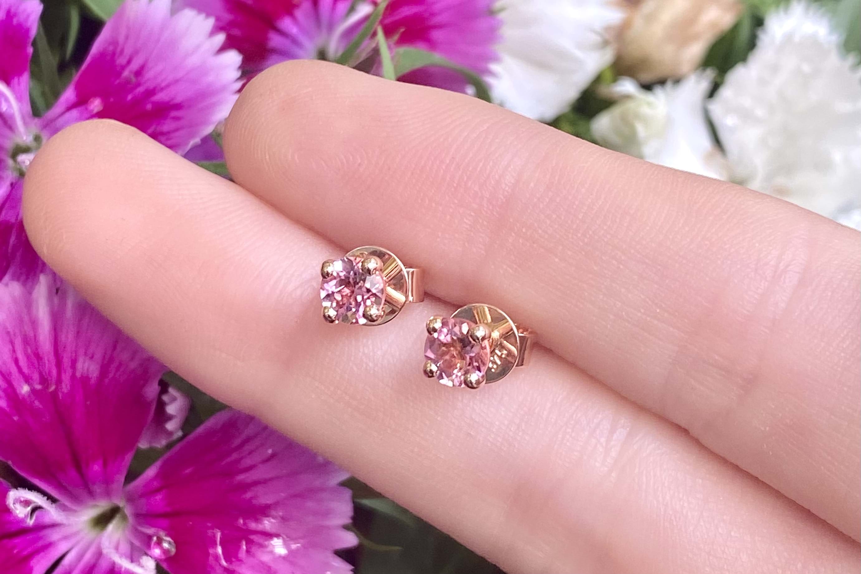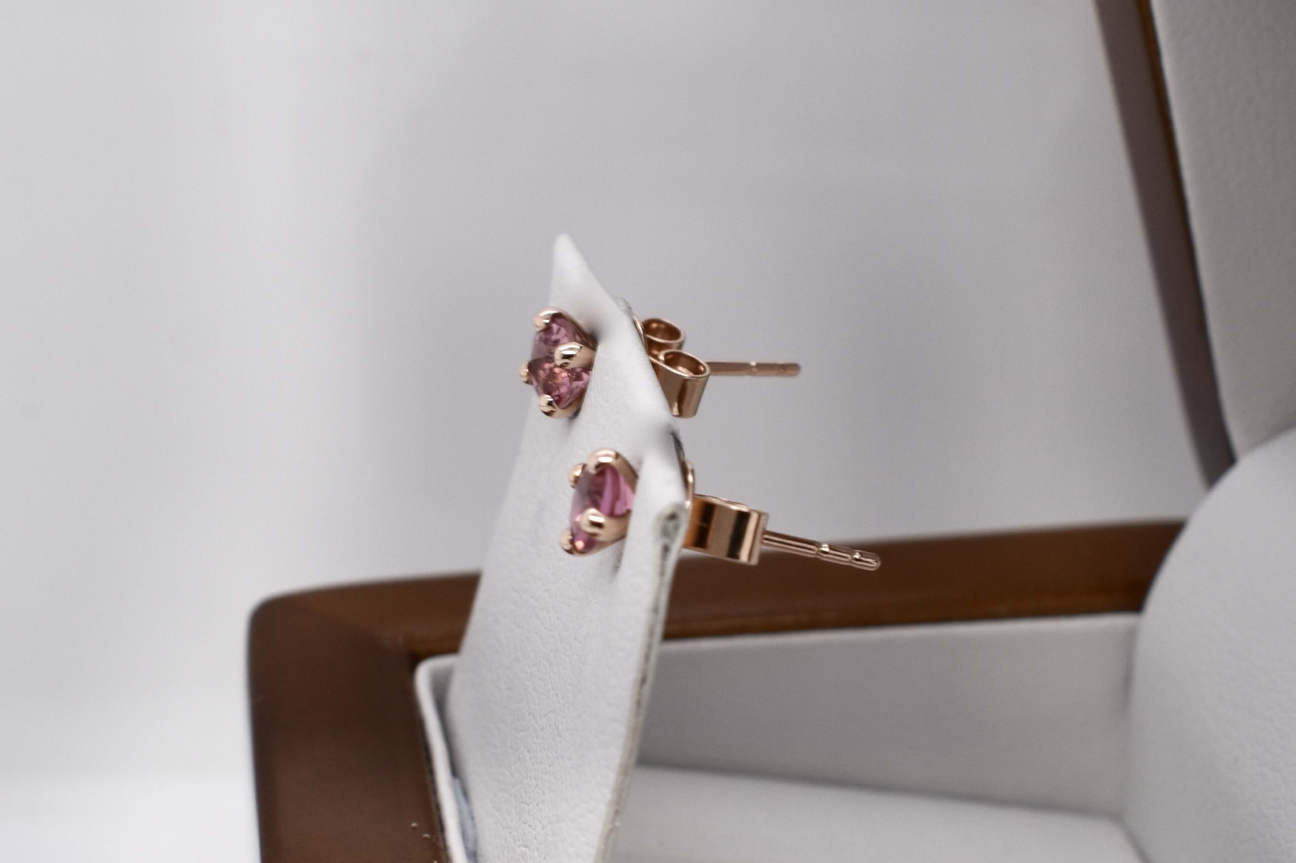Crafted in 9ct yellow gold, two round pink tourmaline stones, four claw set with simple post and butterfly settings. Measuring 4.5x4.5mm.