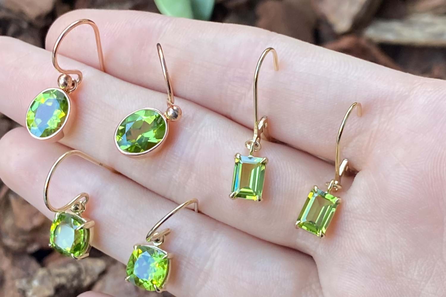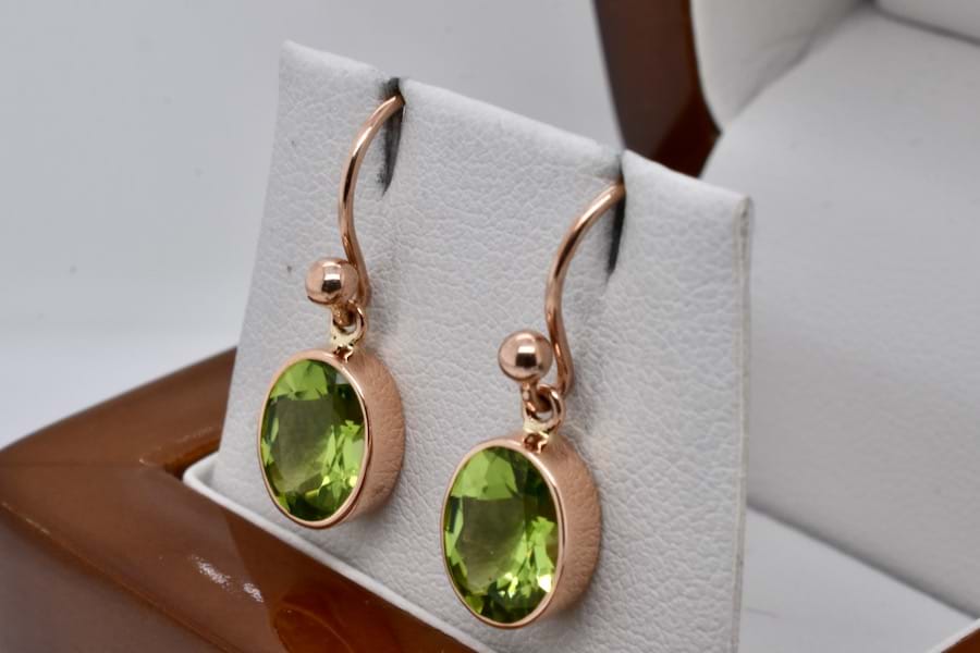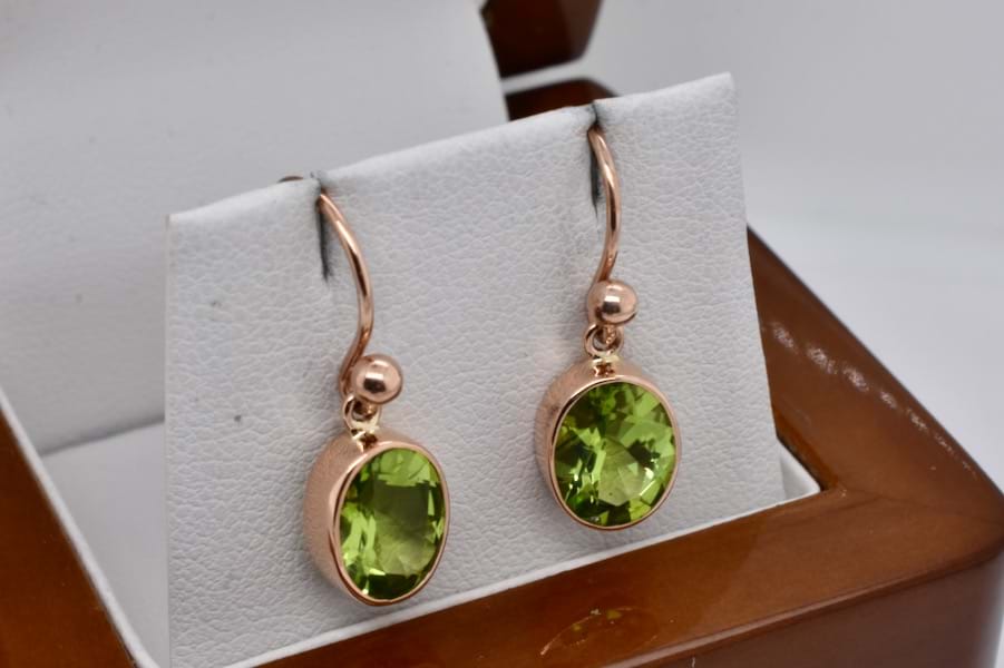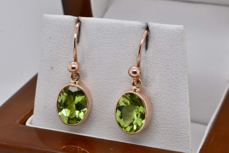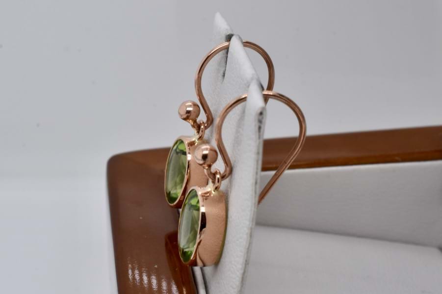 Handmade 9ct rose gold earrings set with lovely oval shape peridot measuring approx. 10 x 8mm, bezel set with shepherd hooks