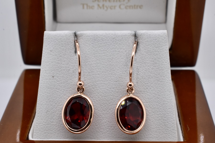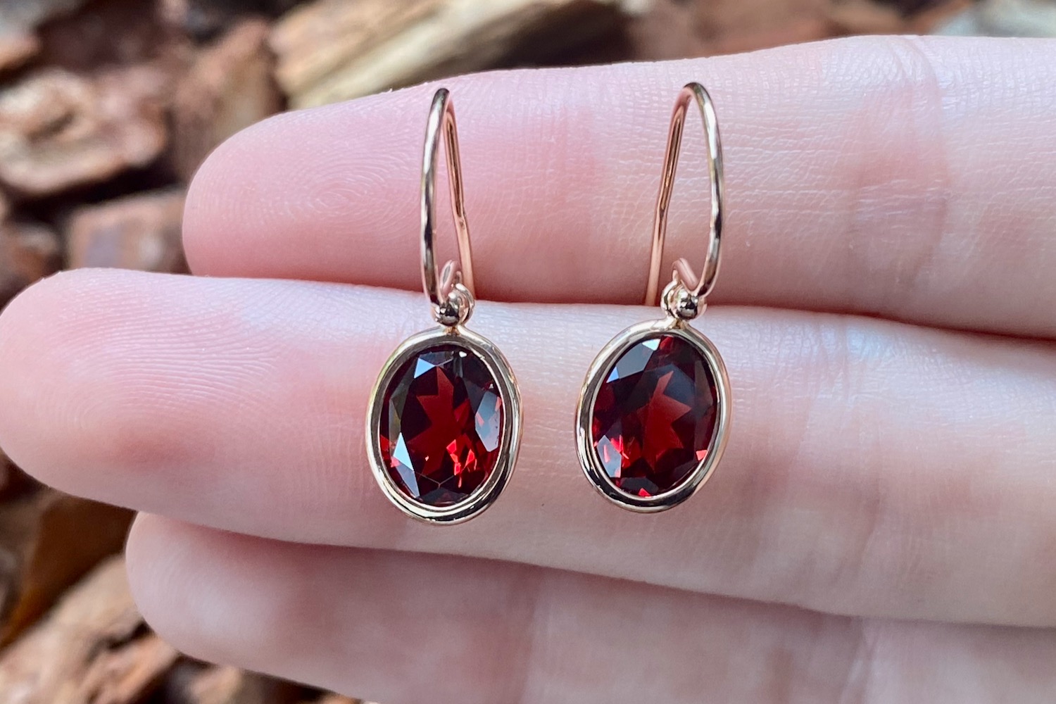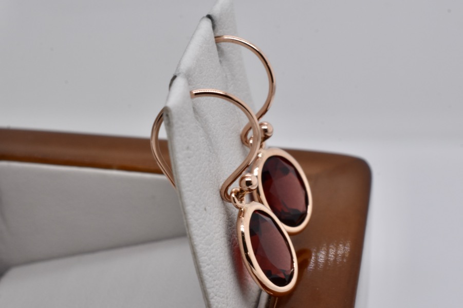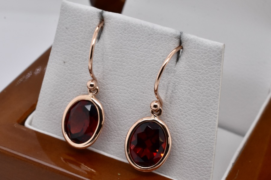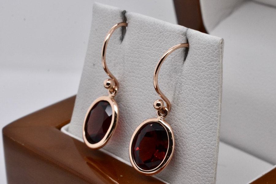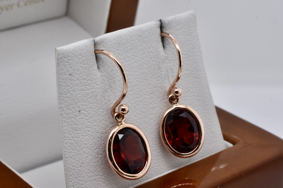 Handmade 9ct rose gold earrings set with approx. 11 x 9mm oval shape garnets in bezel settings with shepherd hooks