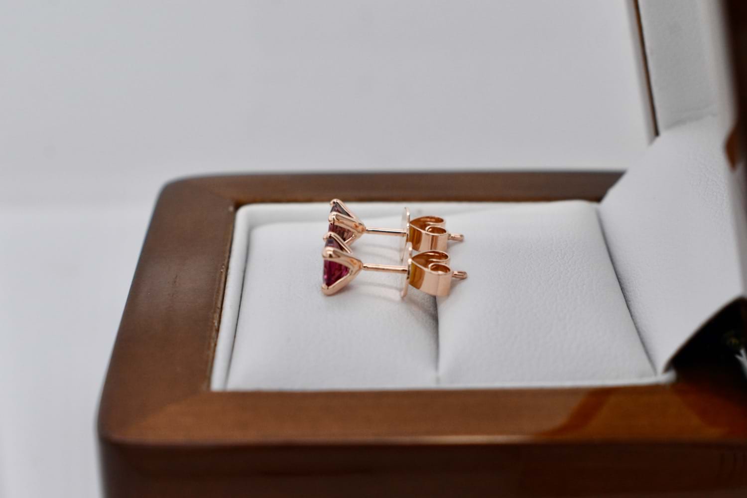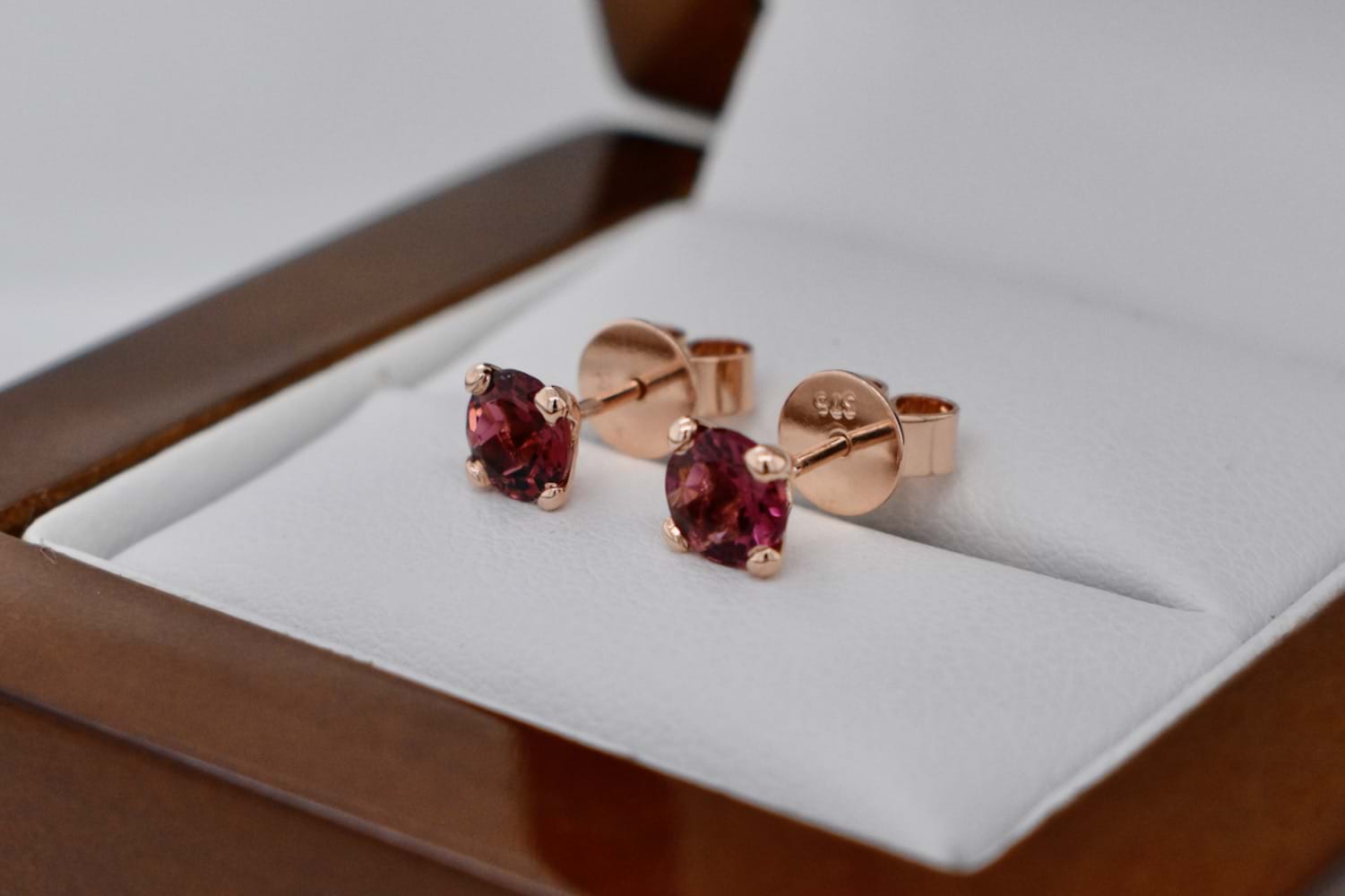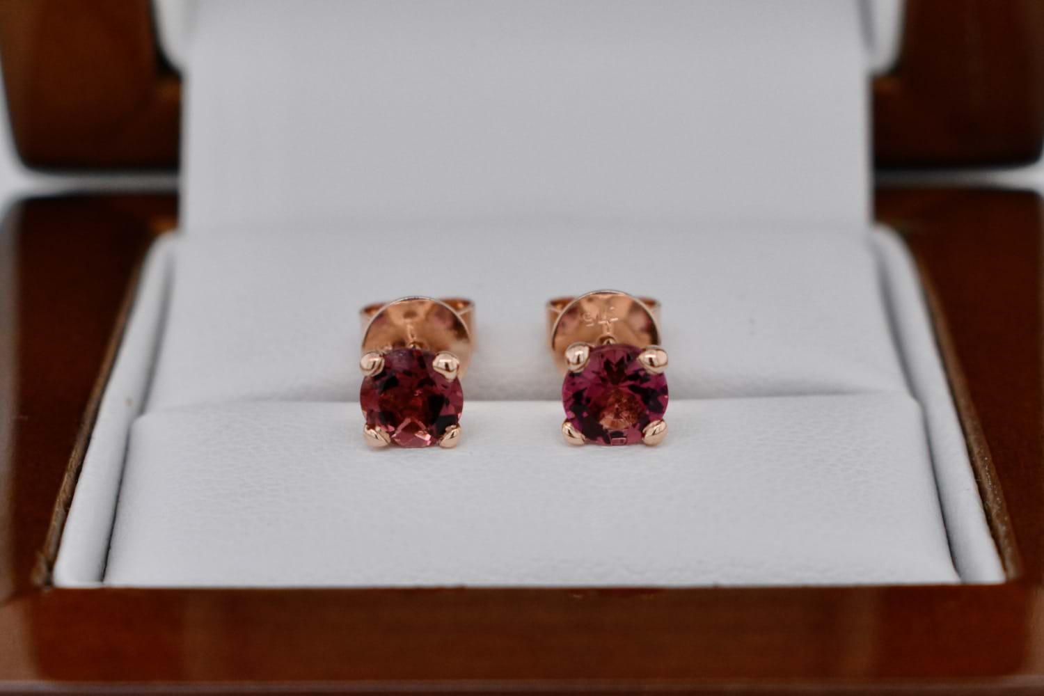 Pretty pink tourmalines measuring approx. 4.4mm round set into handmade 9ct rose gold four claw set stud settings with post and butterfly fittings