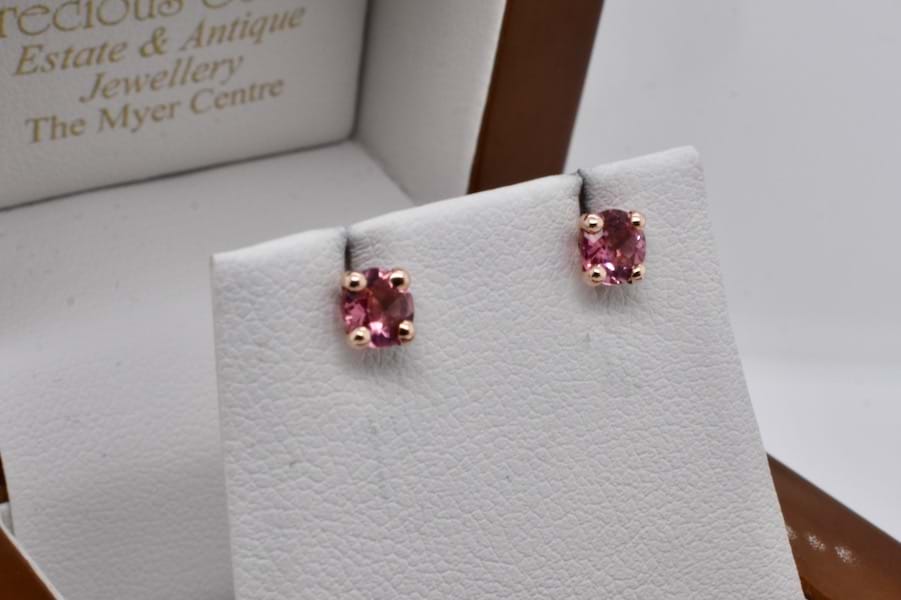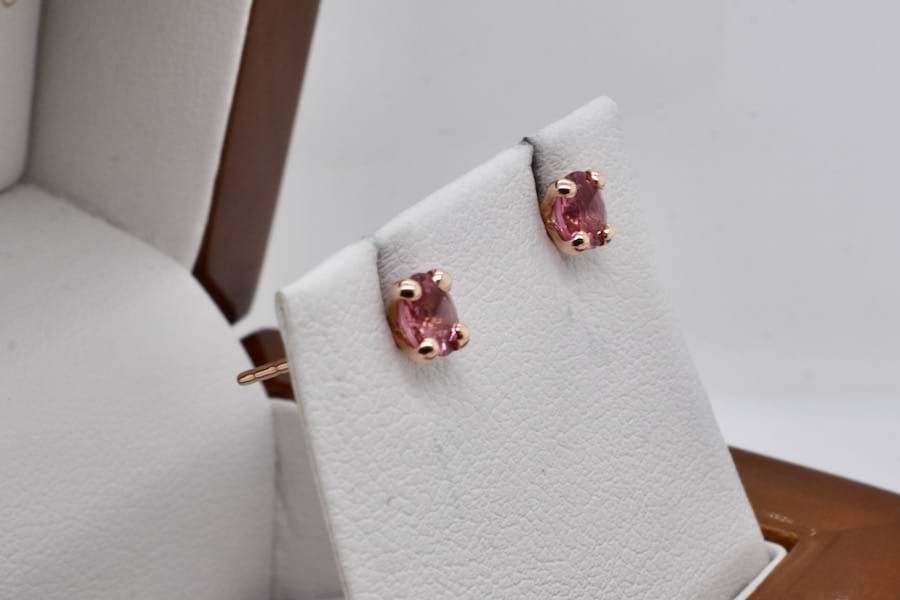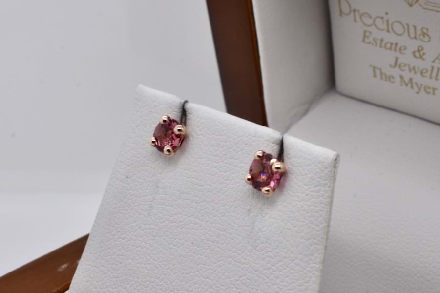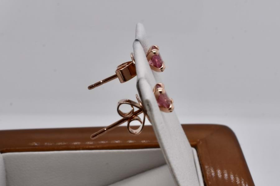 A sweet, pretty pair of handmade 9cr rose gold studs set with round pink tourmaline measuring approx. 4.5mm, in four claws with post and butterfly fittings