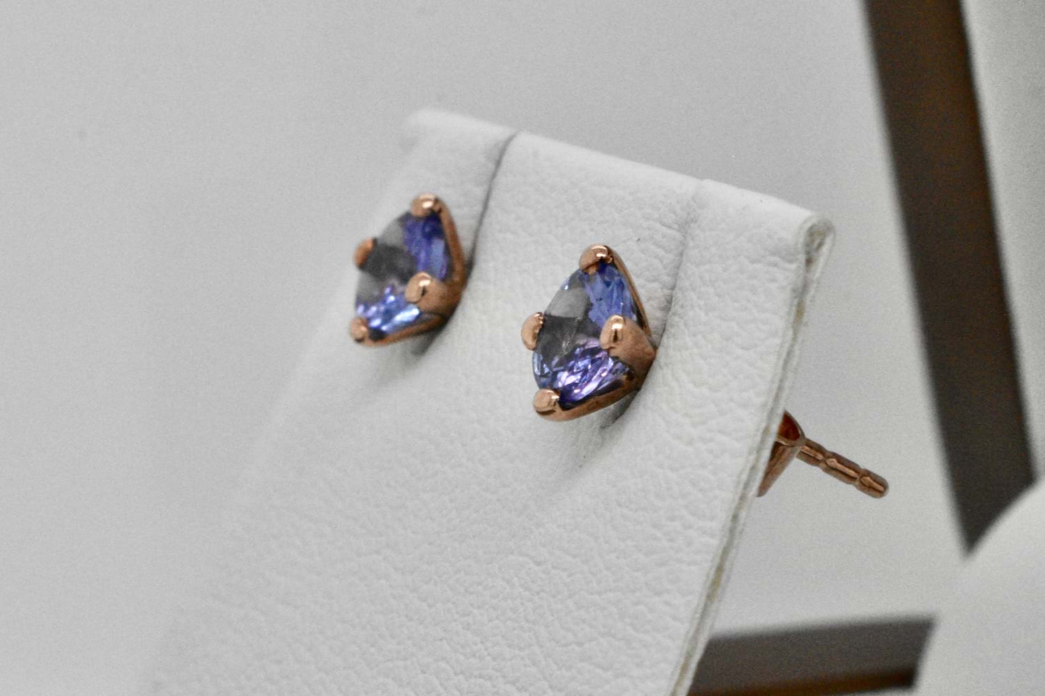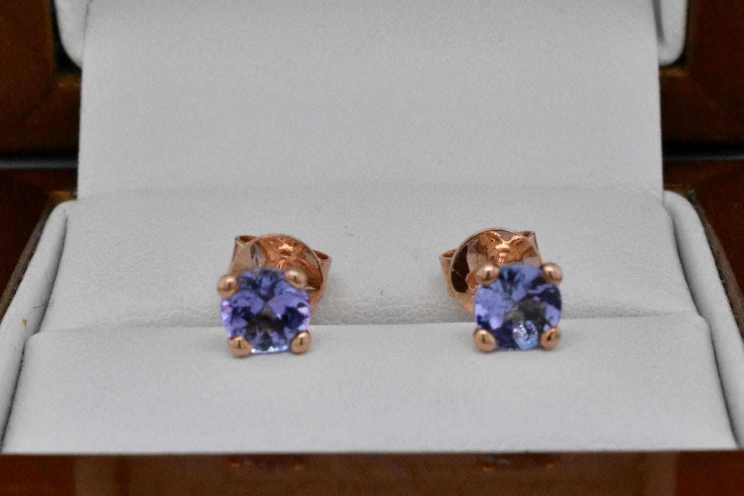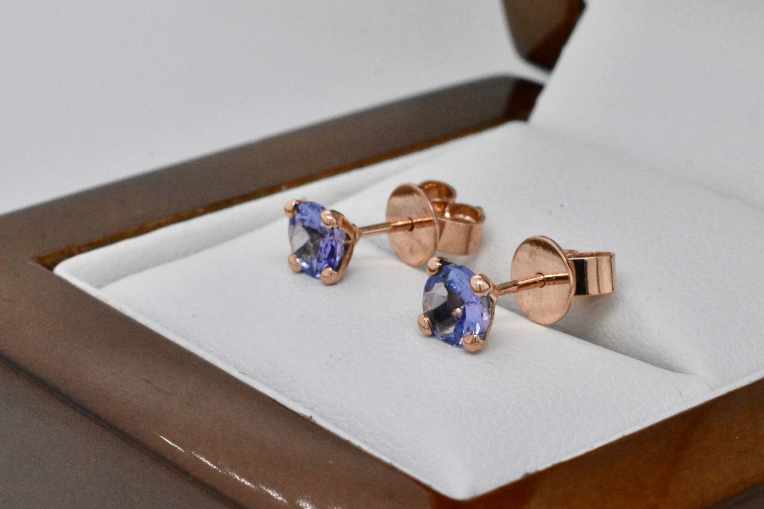 Handmade in 9ct rose gold these four claw stud earrings feature 4.5mm round faceted tanzanites with post & butterfly fittings